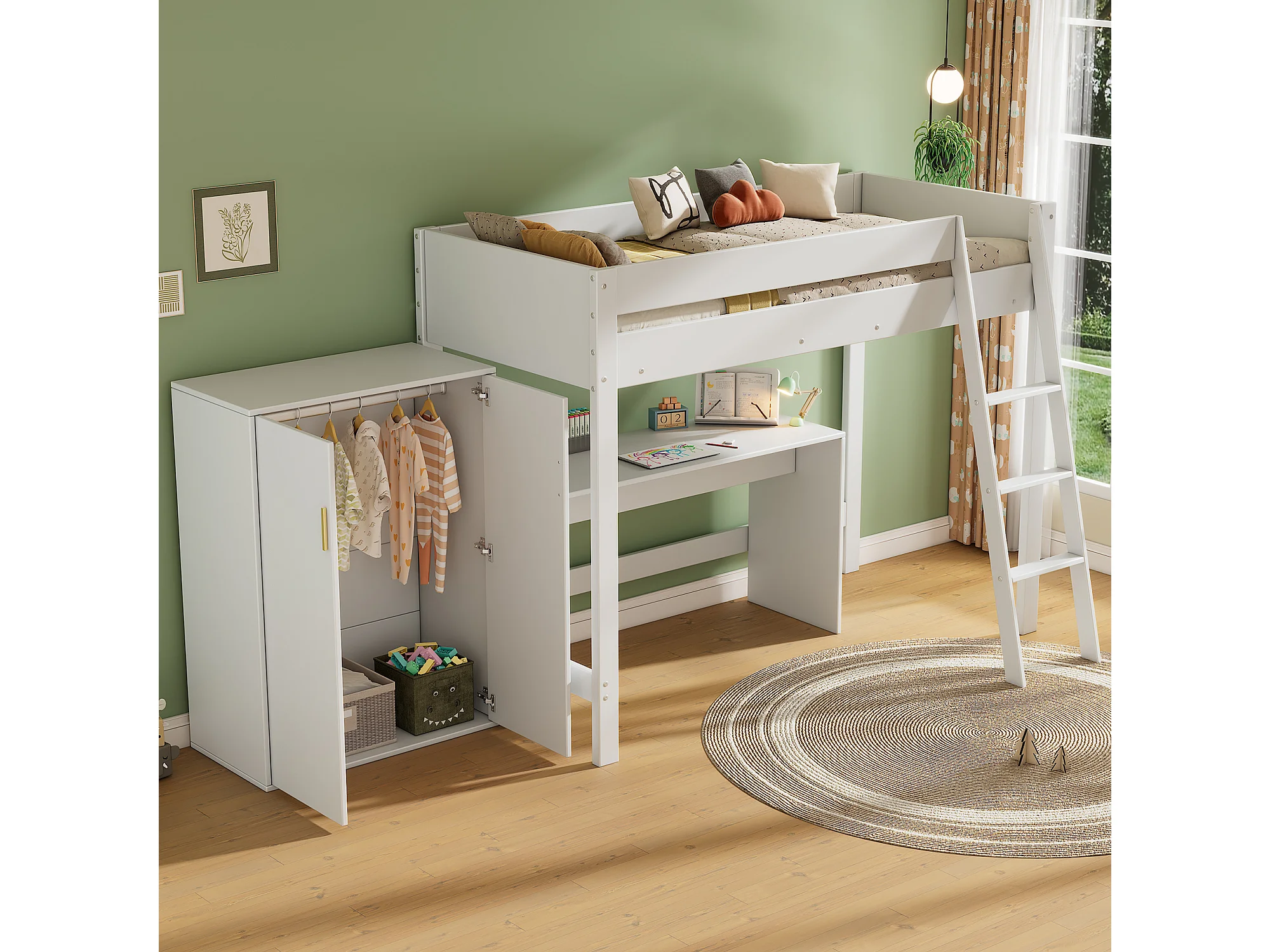 Cama alta infantil 90x200 cm madera maciza con escritorio y armario multifunción en color blanco