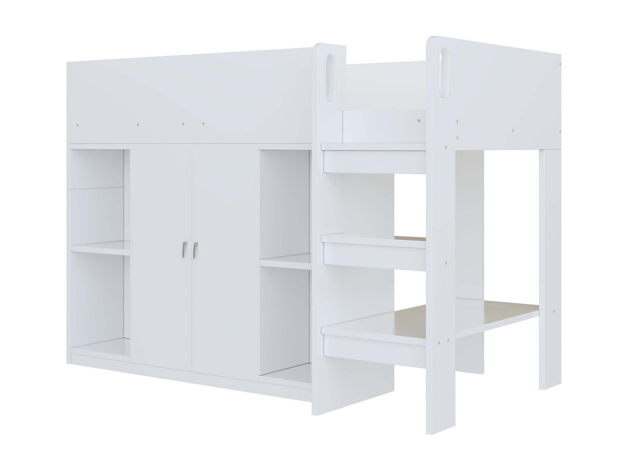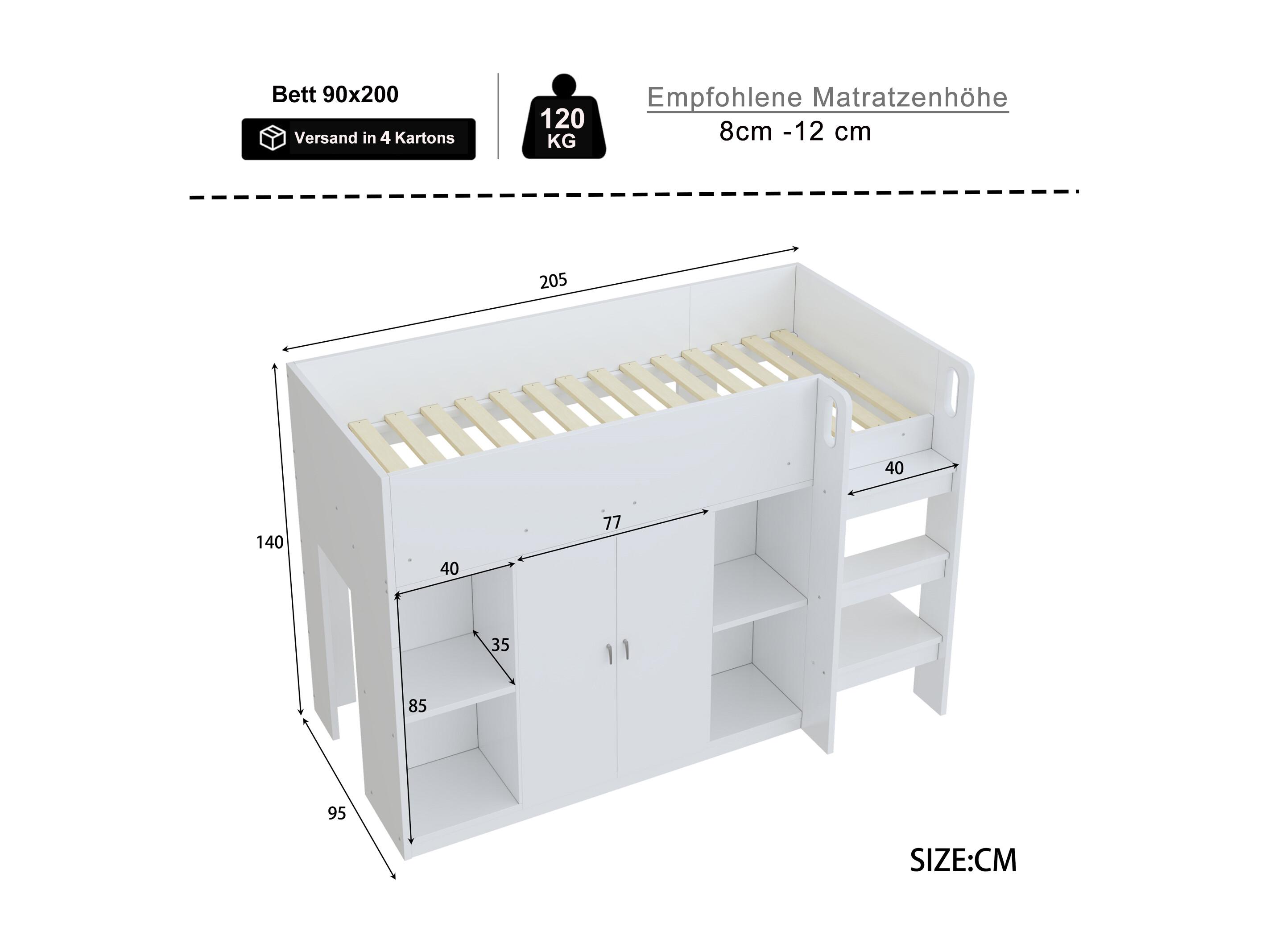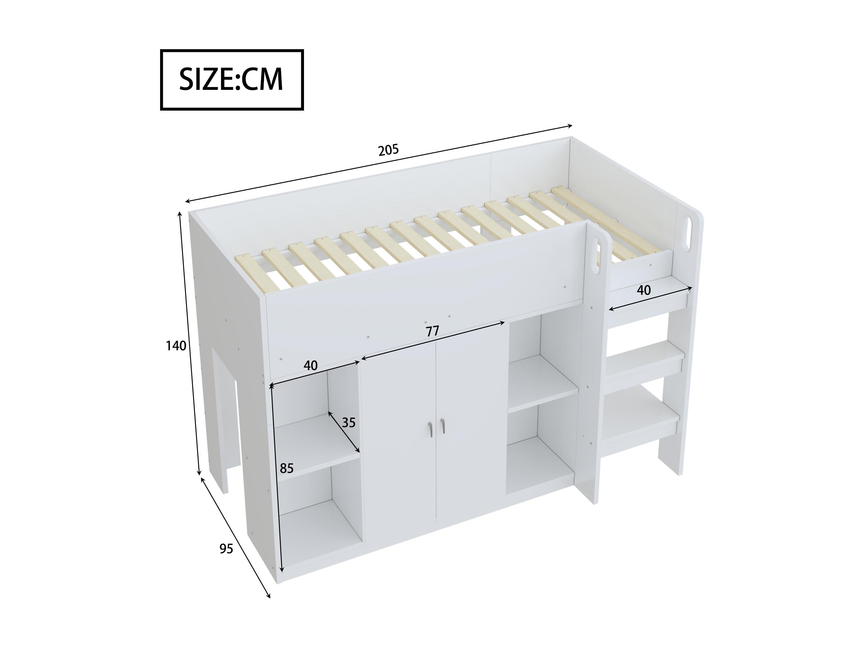 Cama alta infantil 90x200cm madera maciza con armario almacenaje estantes blanco