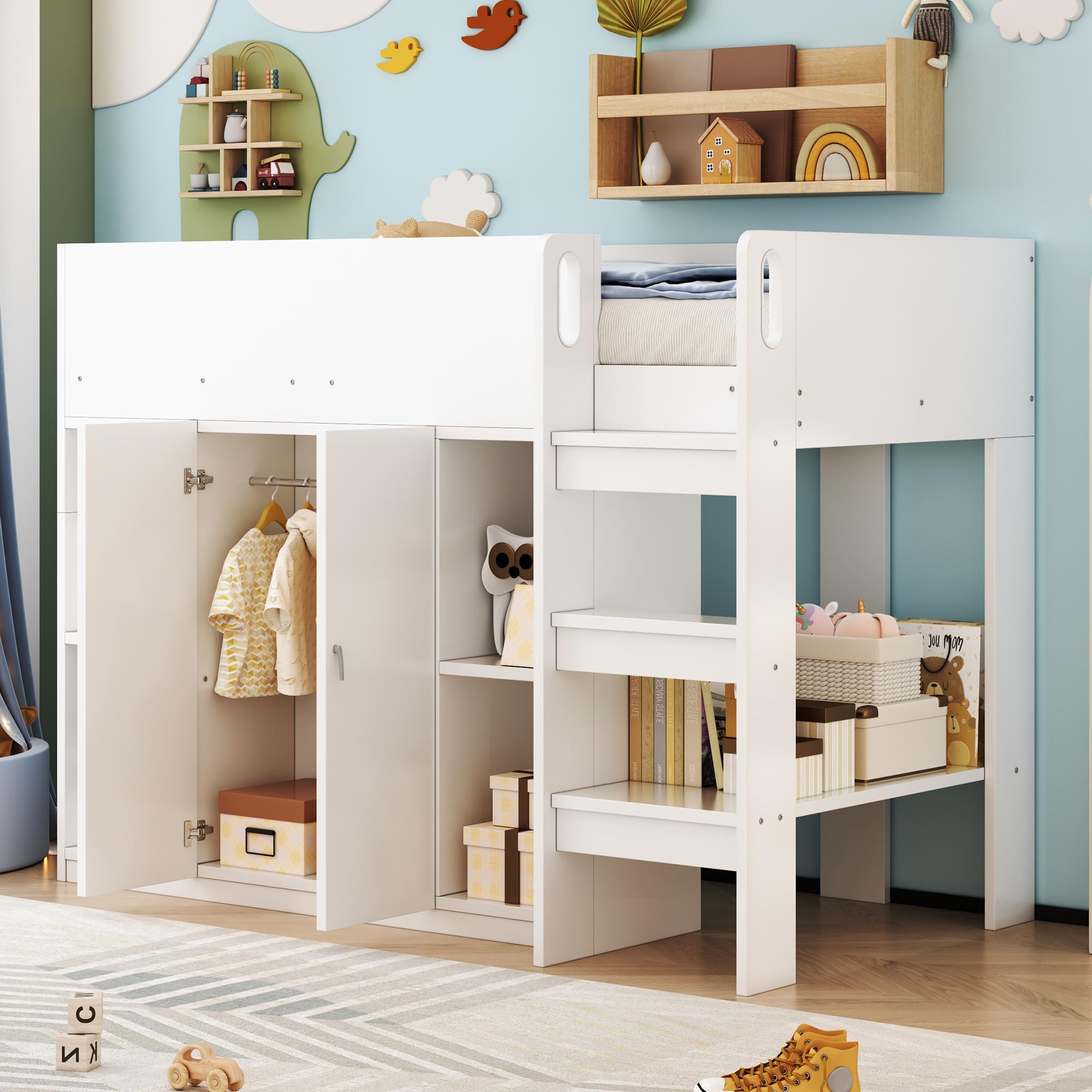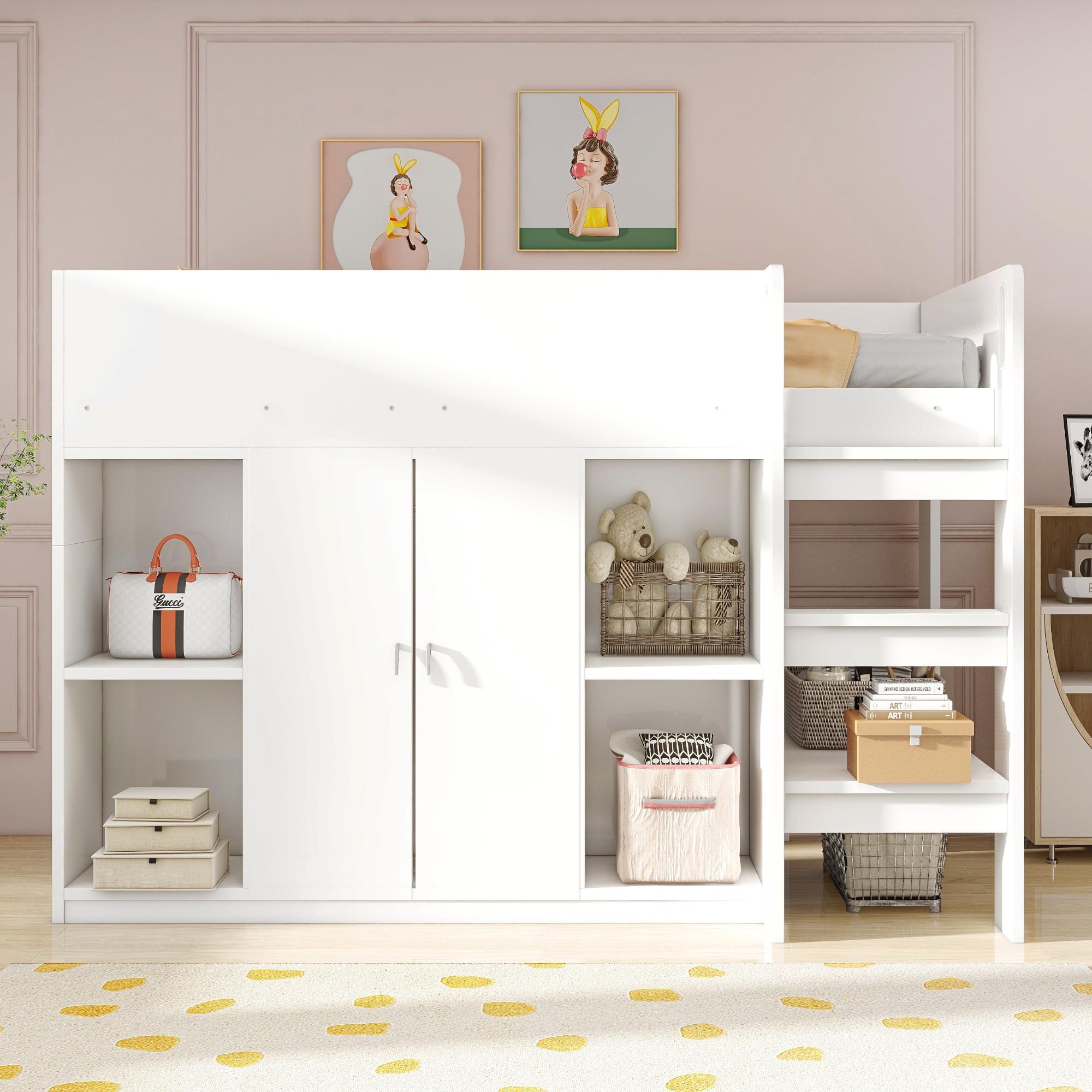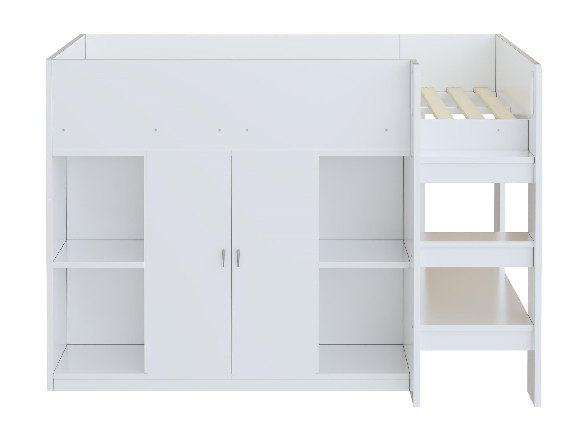 Cama alta infantil 90x200cm madera maciza con armario almacenaje estantes blanco
