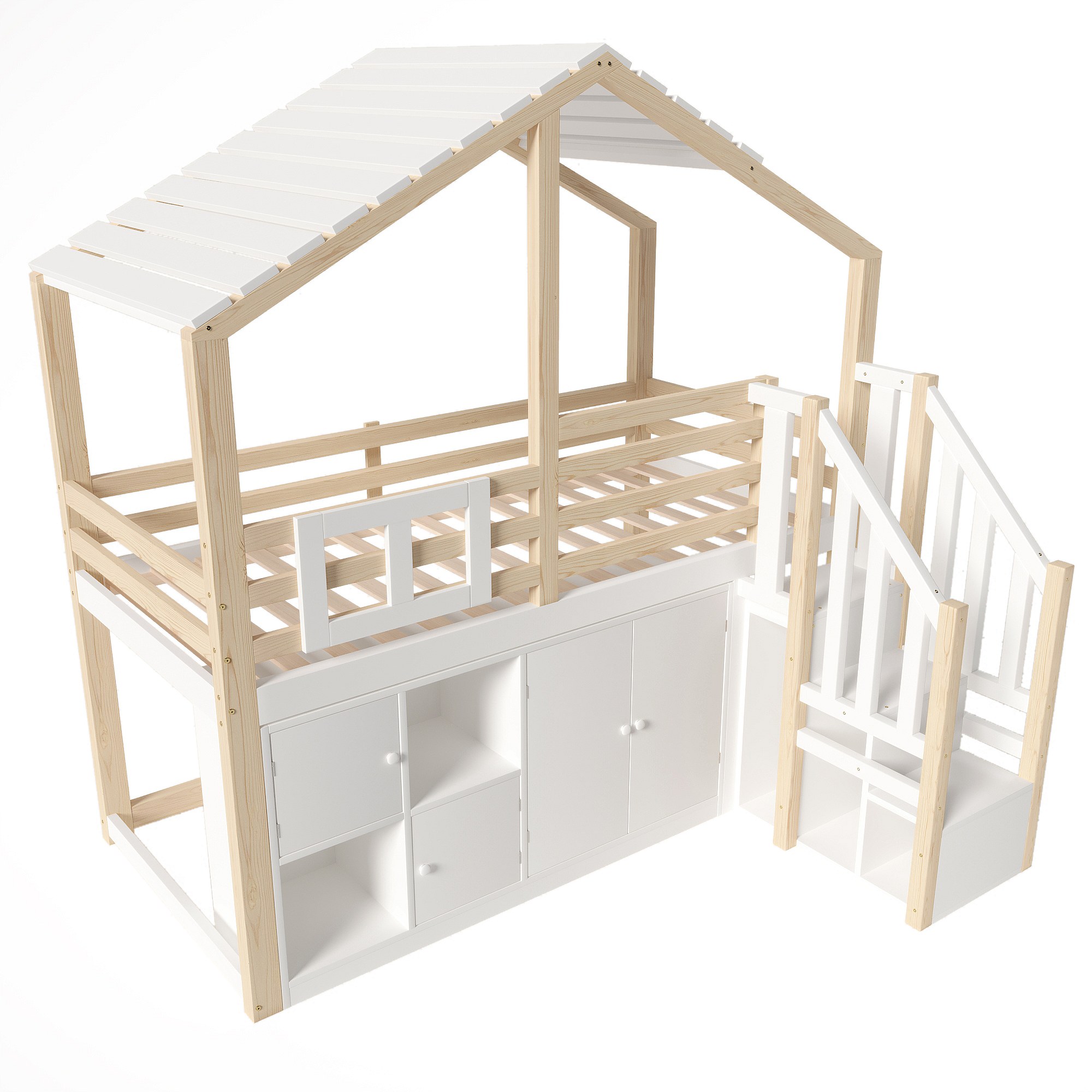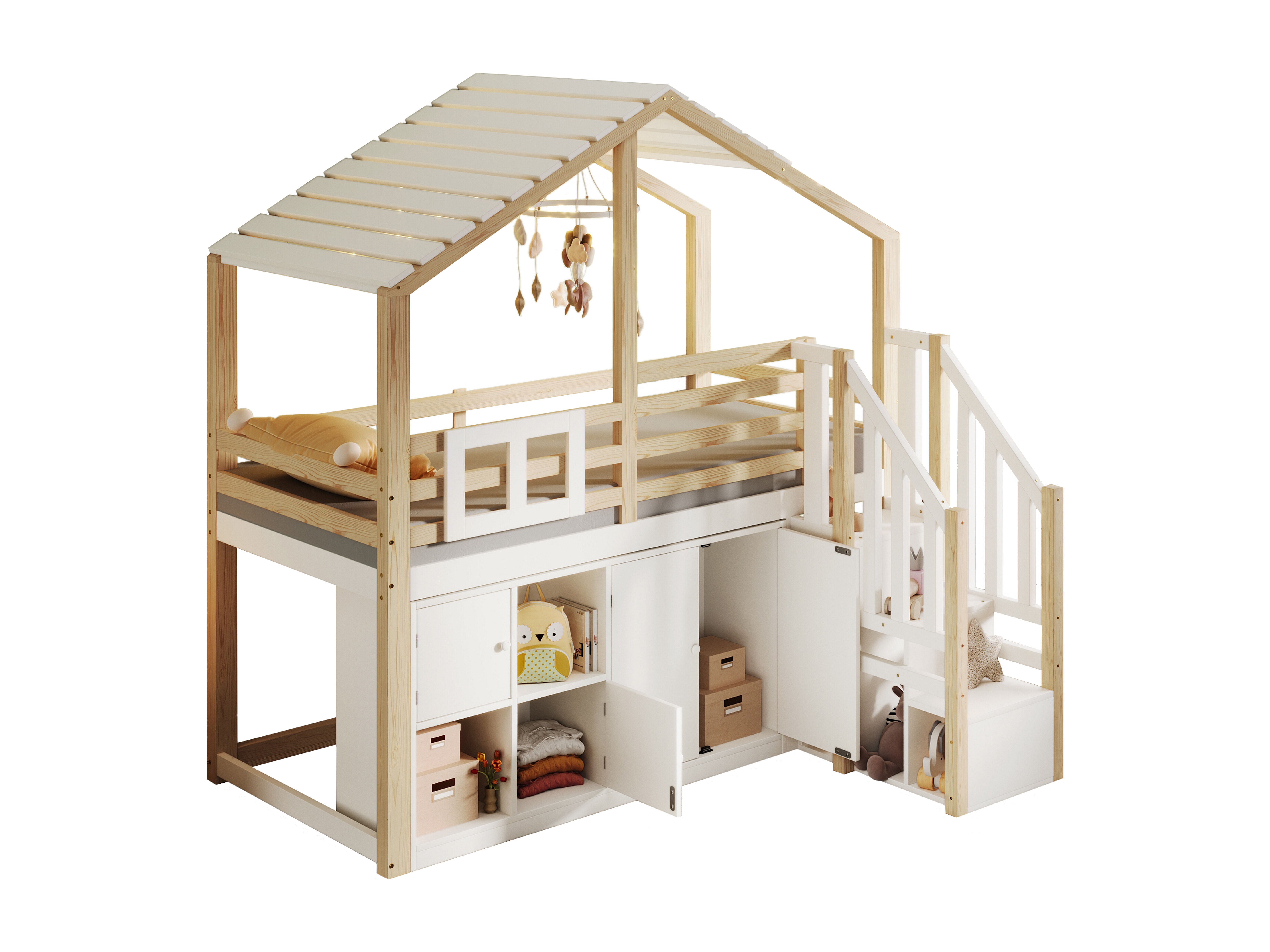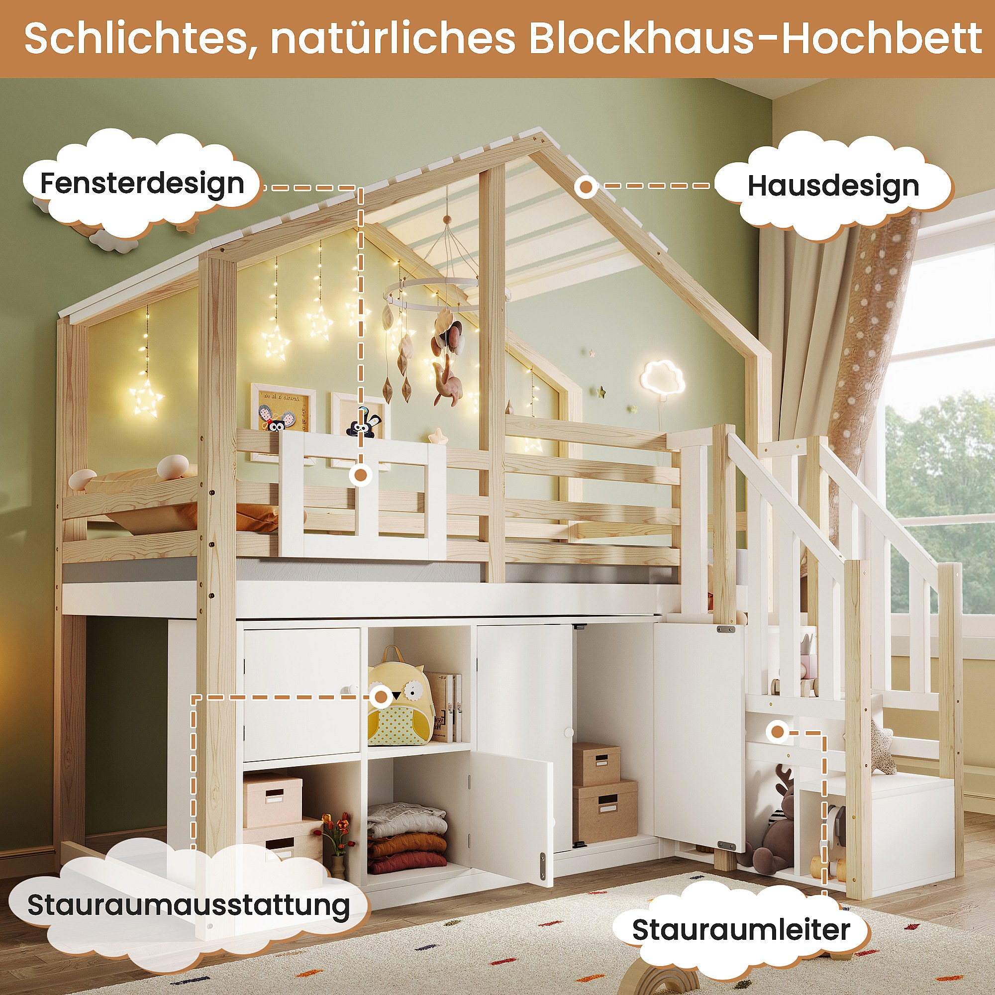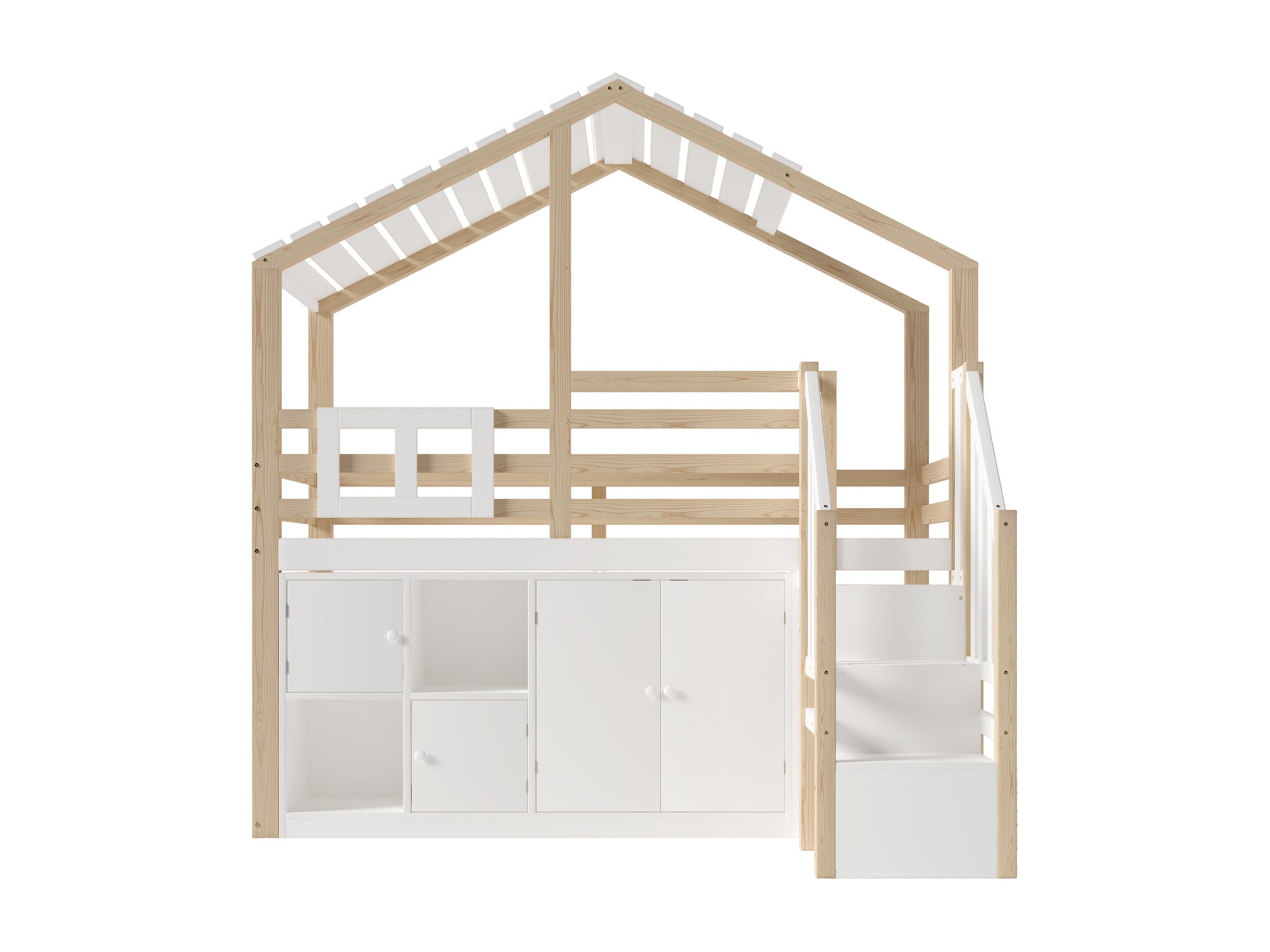 Cama alta infantil con forma de casa - 90 x 200 cm - con taquillas + escalera de almacenaje - madera - blanco + natural