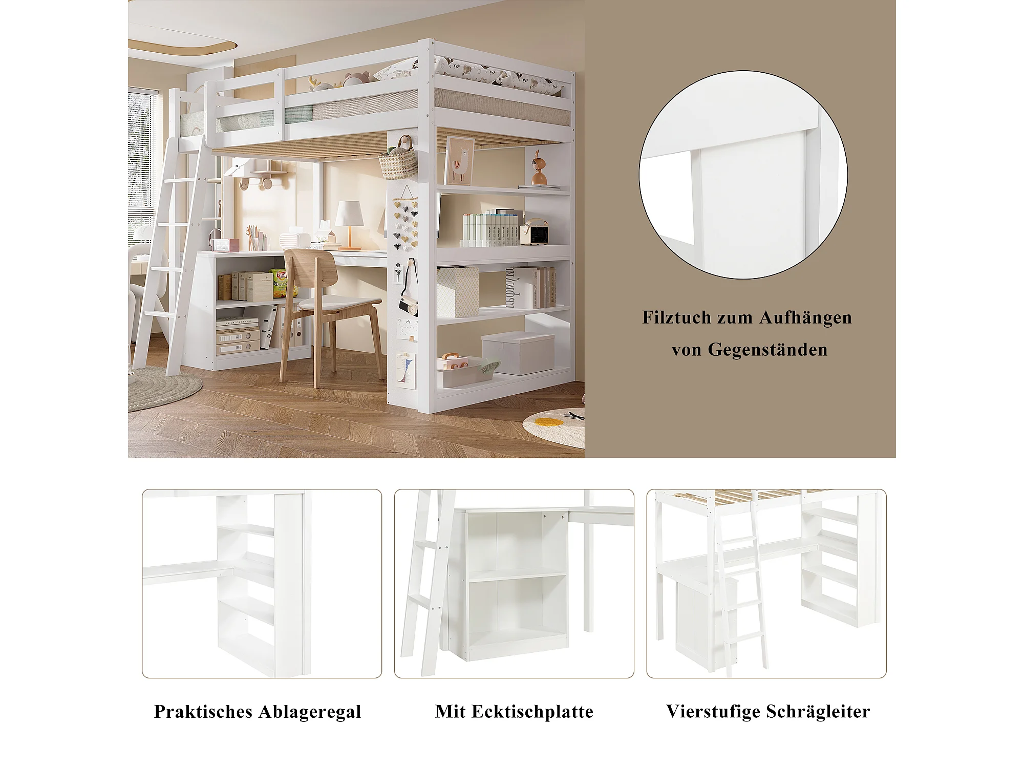 Cama alta infantil con práctico estante, barandilla de seguridad y escalera inclinada, madera maciza + MDF, blanco (90x200 cm)