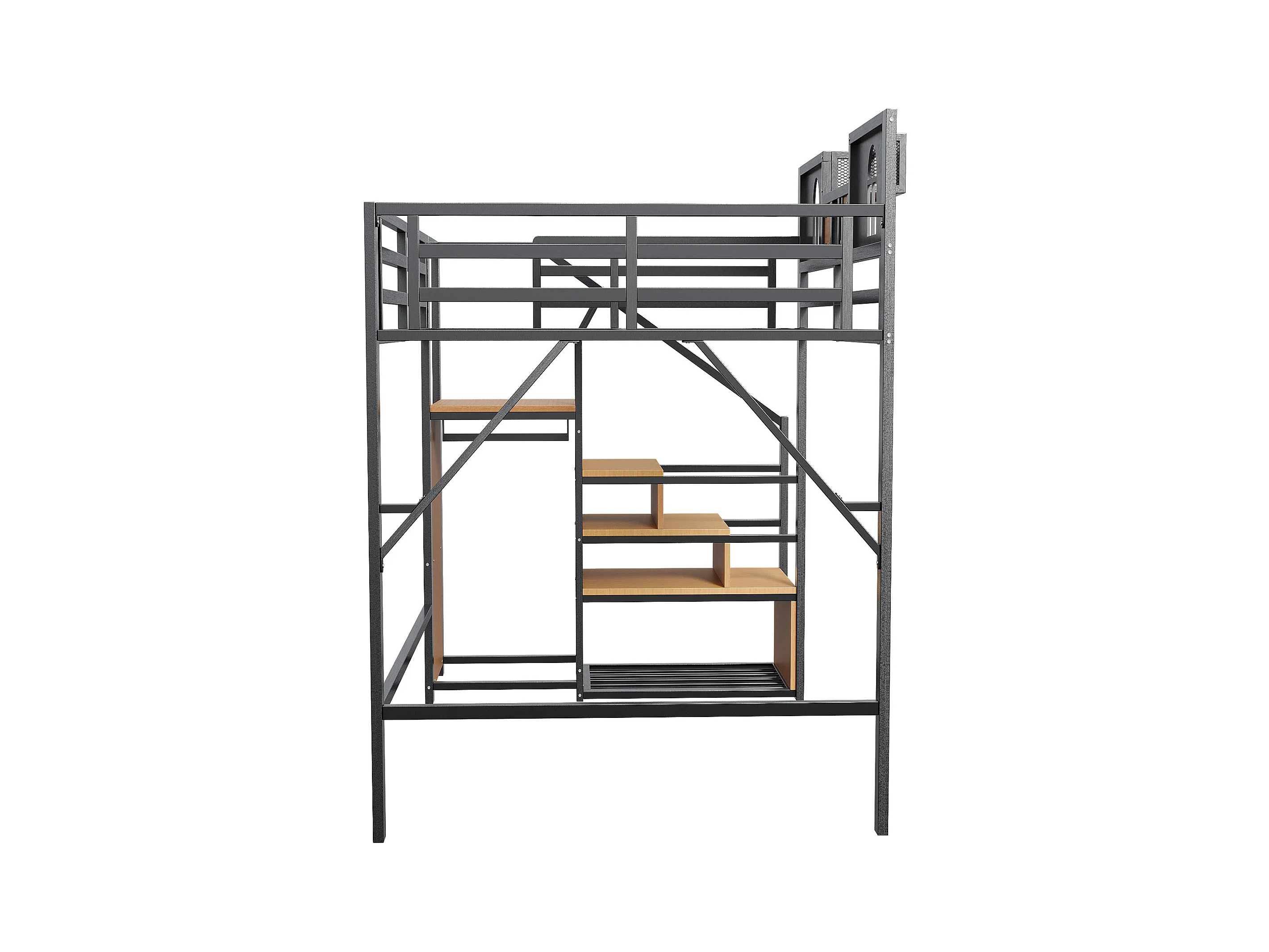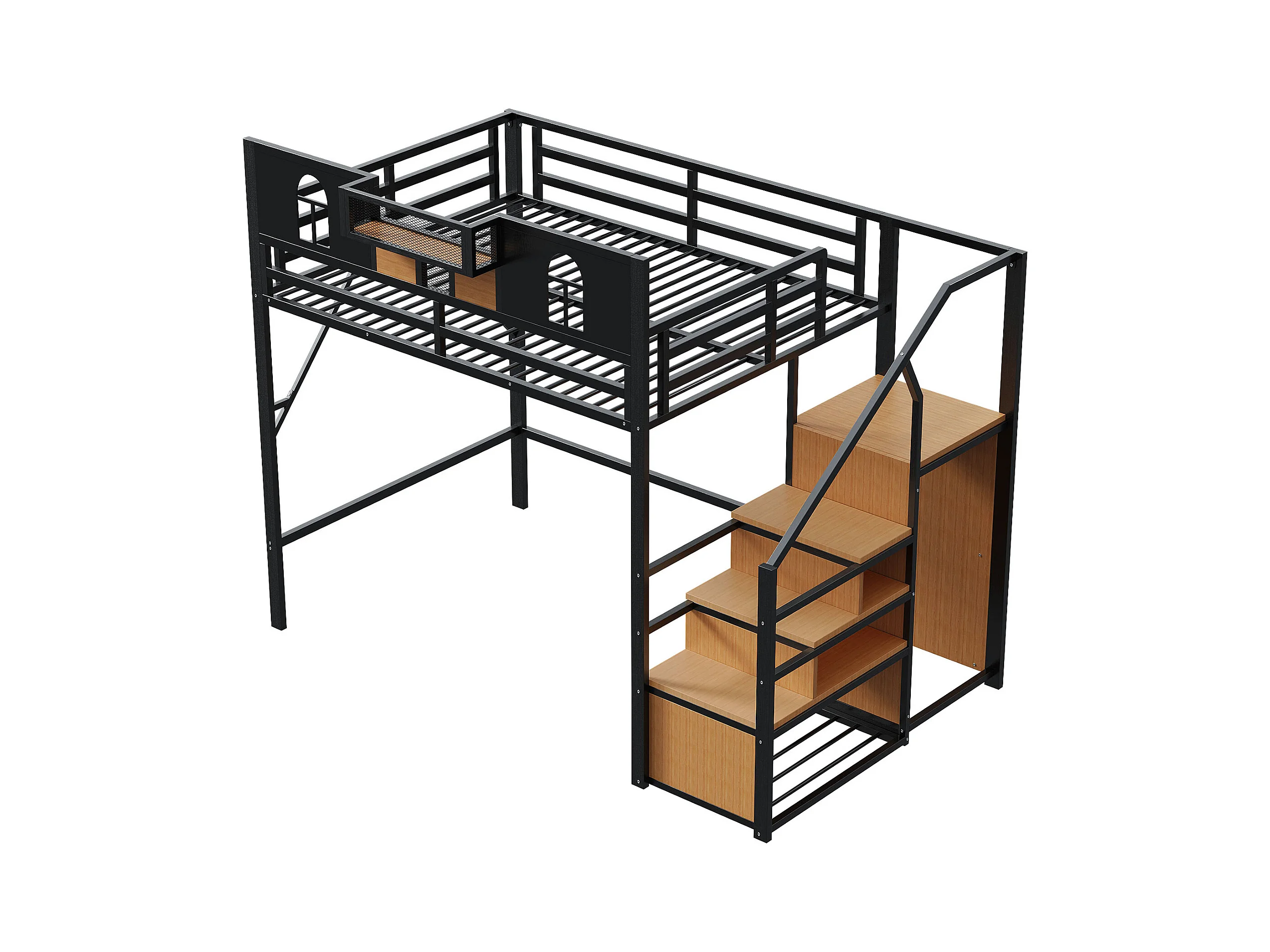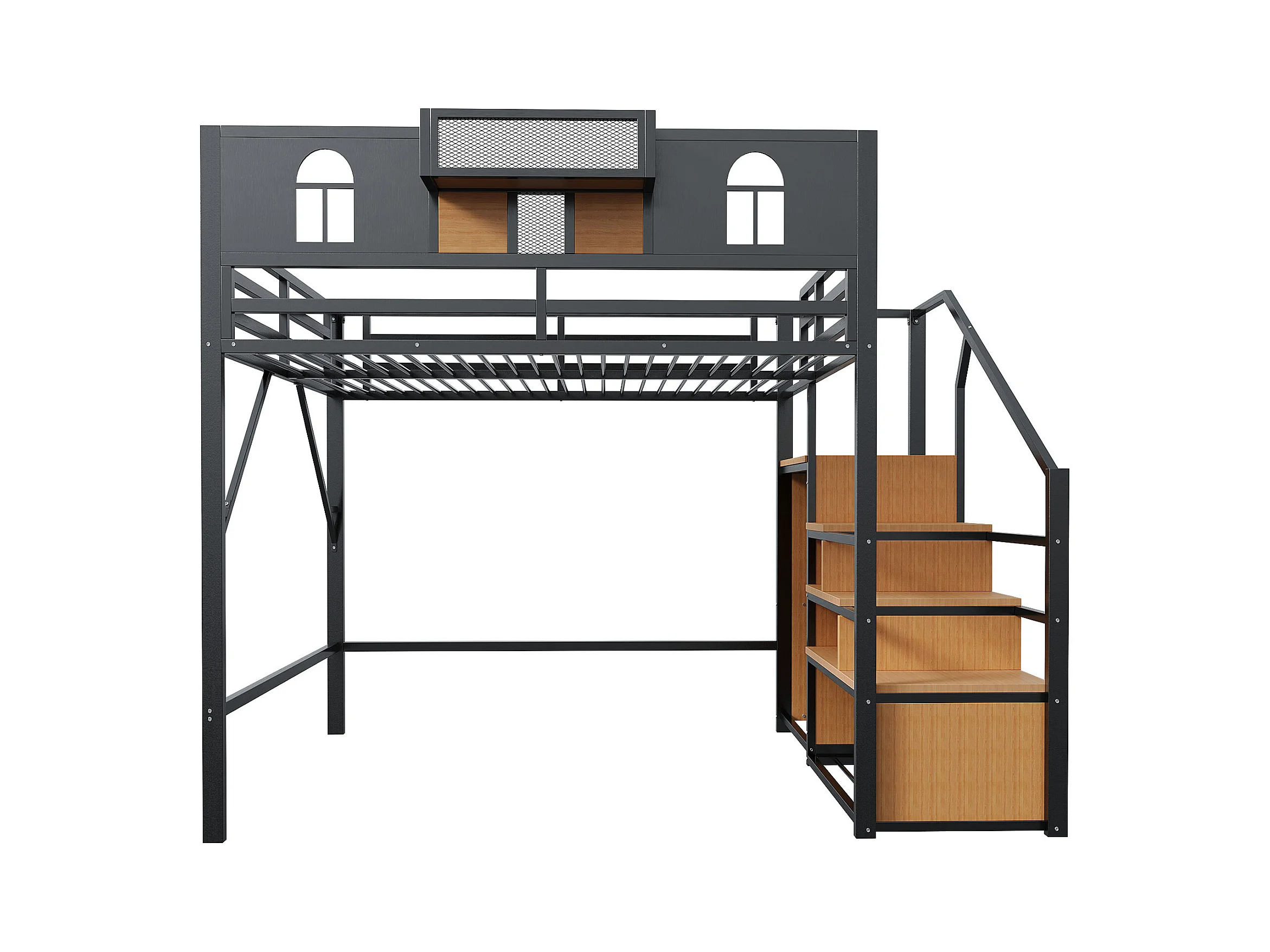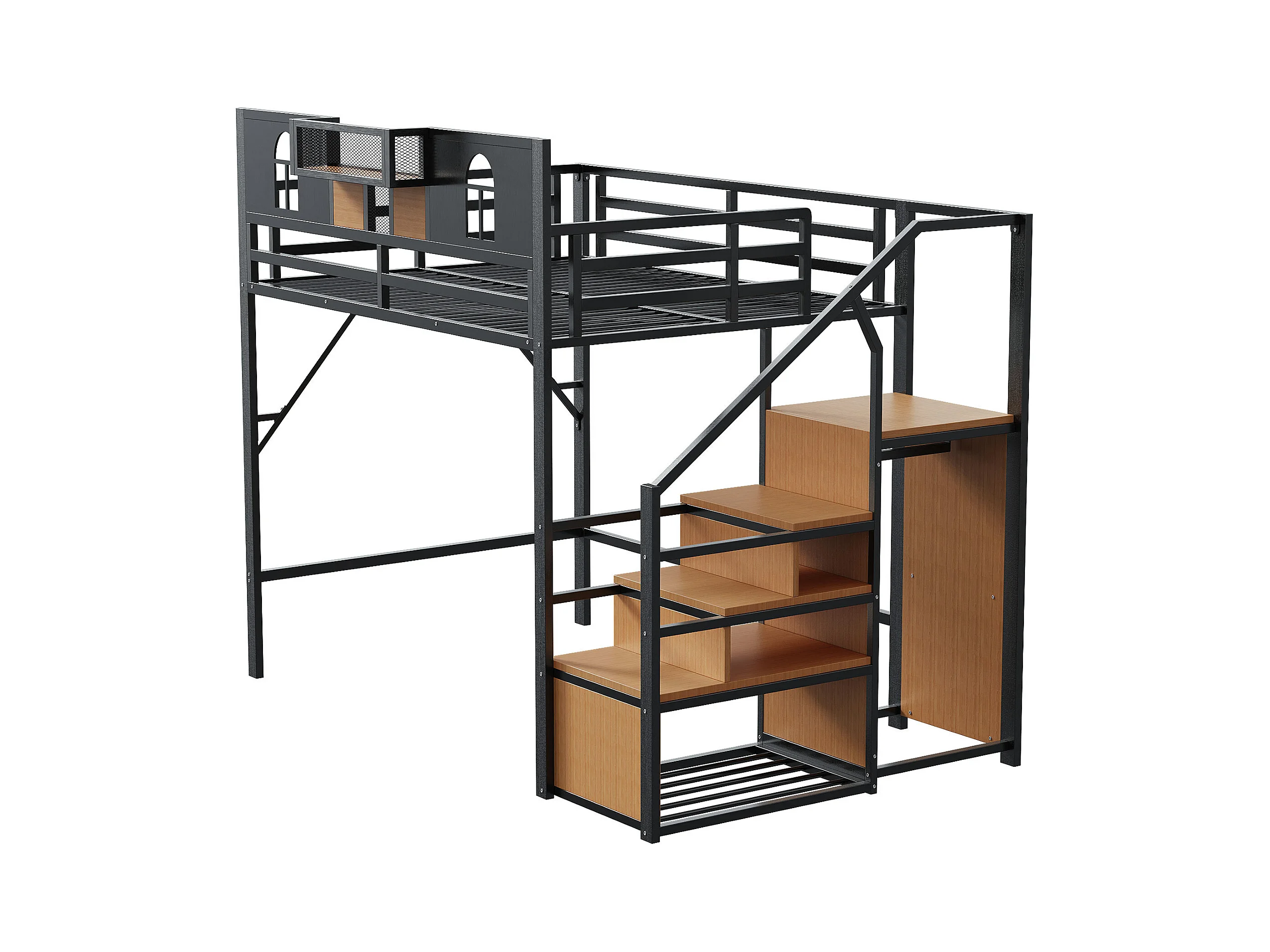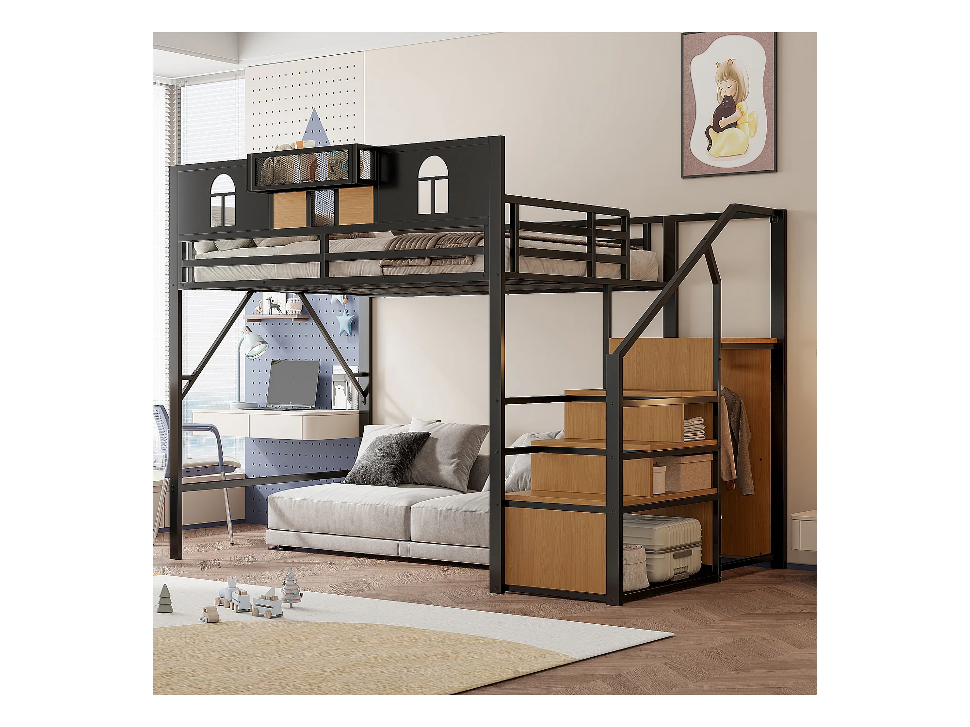 Cama alta infantil negra de 140x200cm con escalera de almacenaje y barrera de seguridad, metal + MDF (sin colchón)