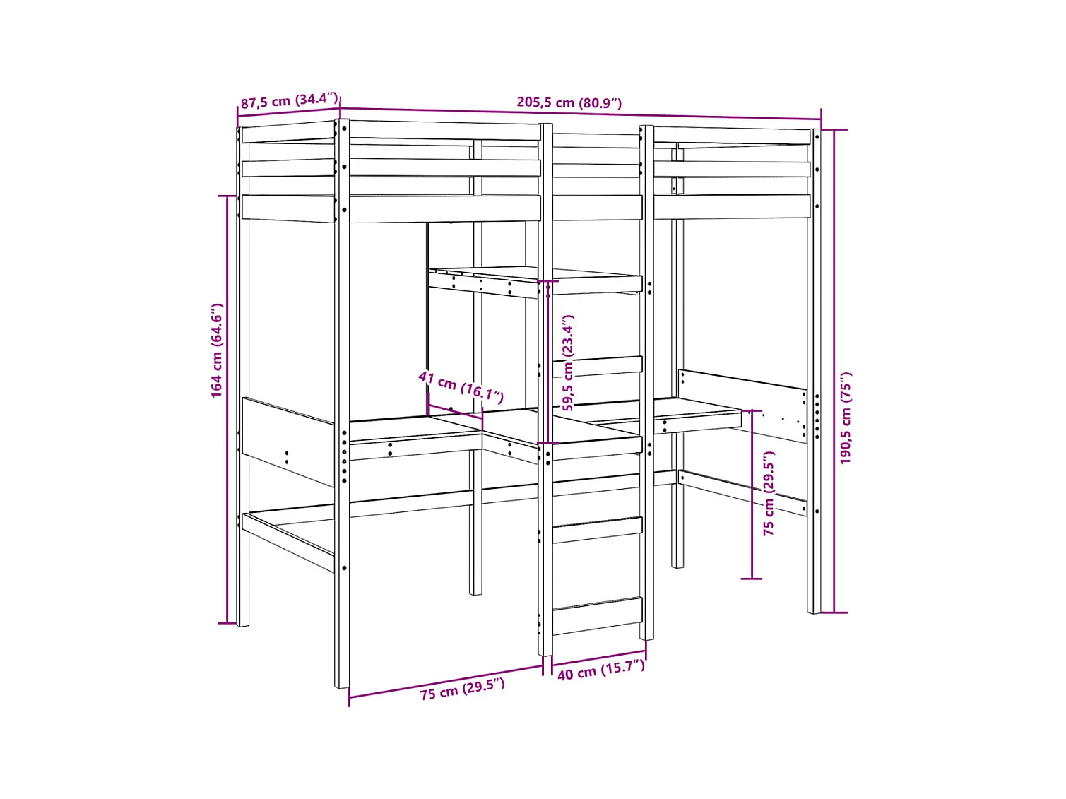 Cama alta escritorio y asientos madera maciza blanco 80x200 cm