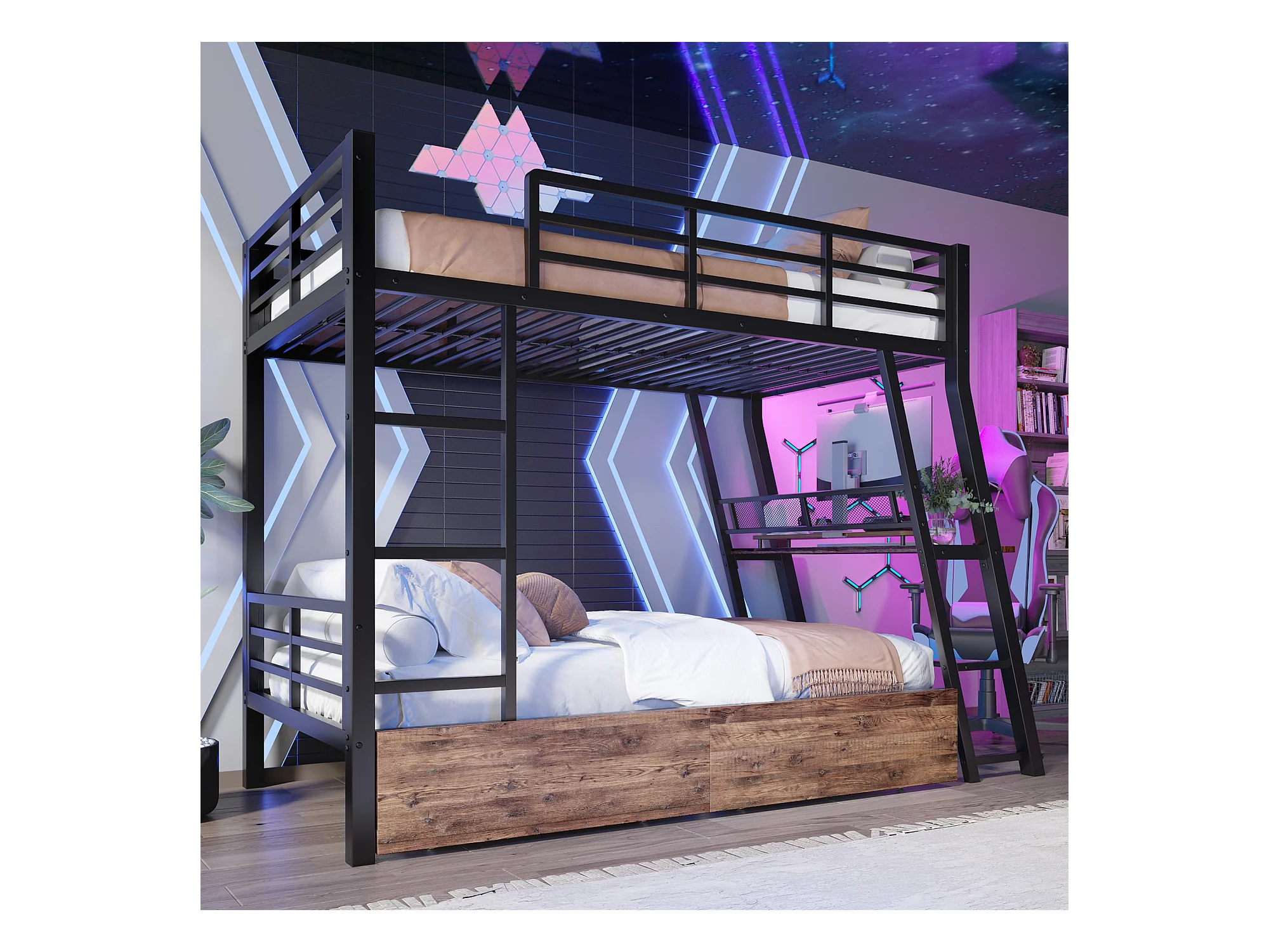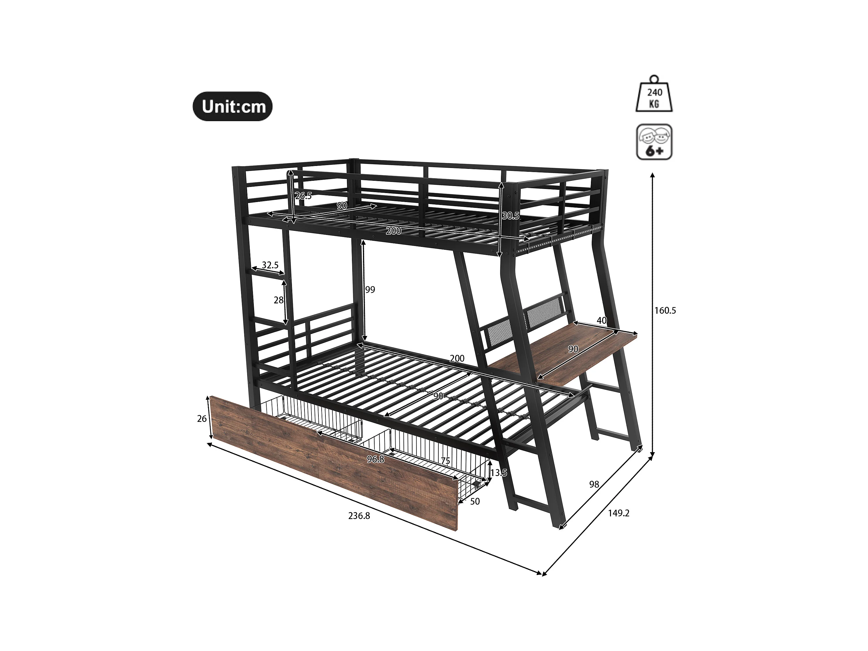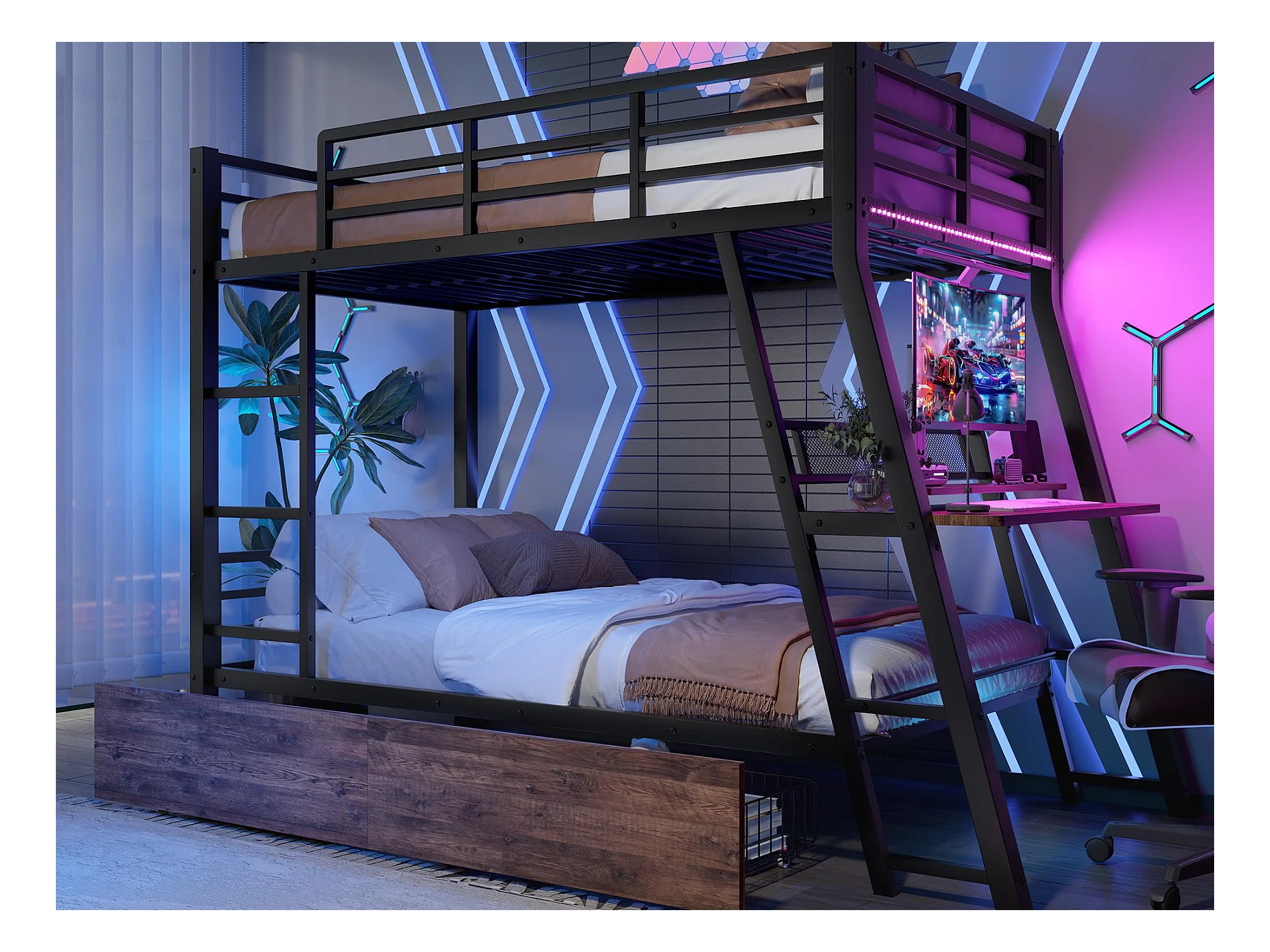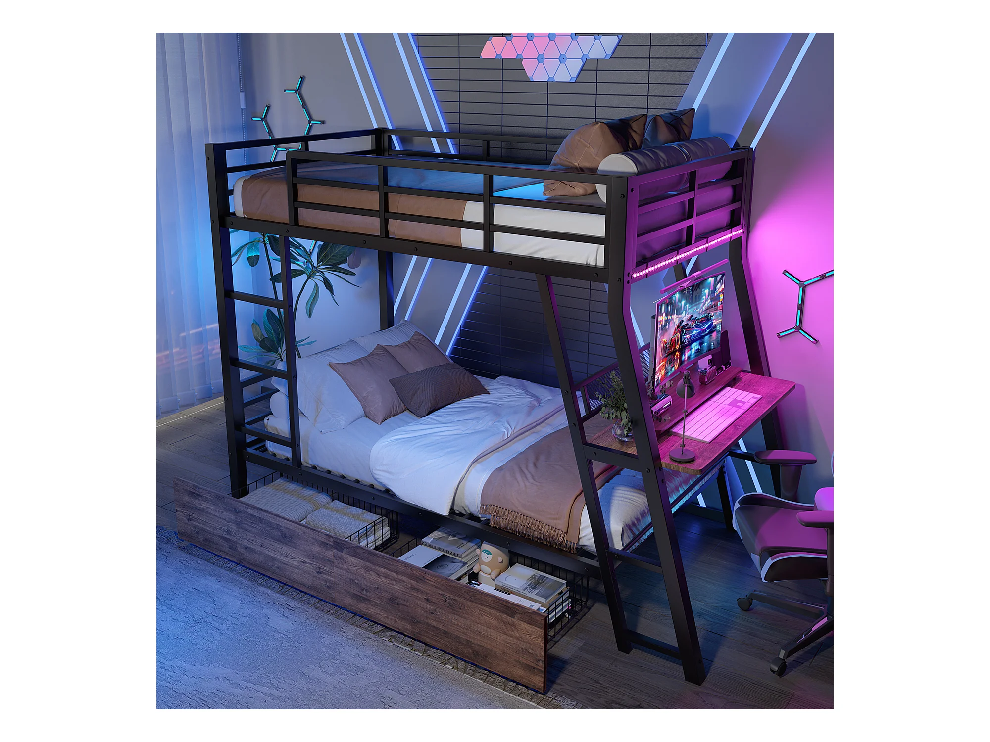 Litera 90x200 cm - con iluminación LED - con 2 cajones - con rampa + escalera - con escritorio - negro
