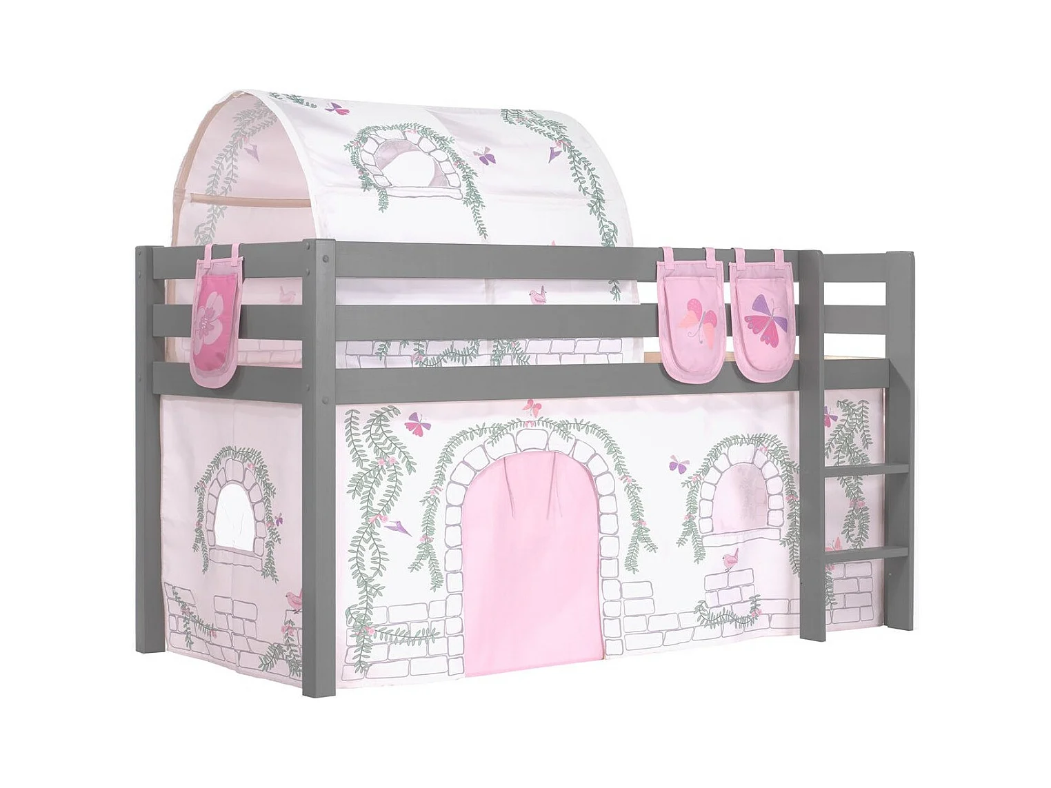 Cama altillo de 90x200 cm con tienda túnel y 3 bolsillos princesa pino macizo gris Pino