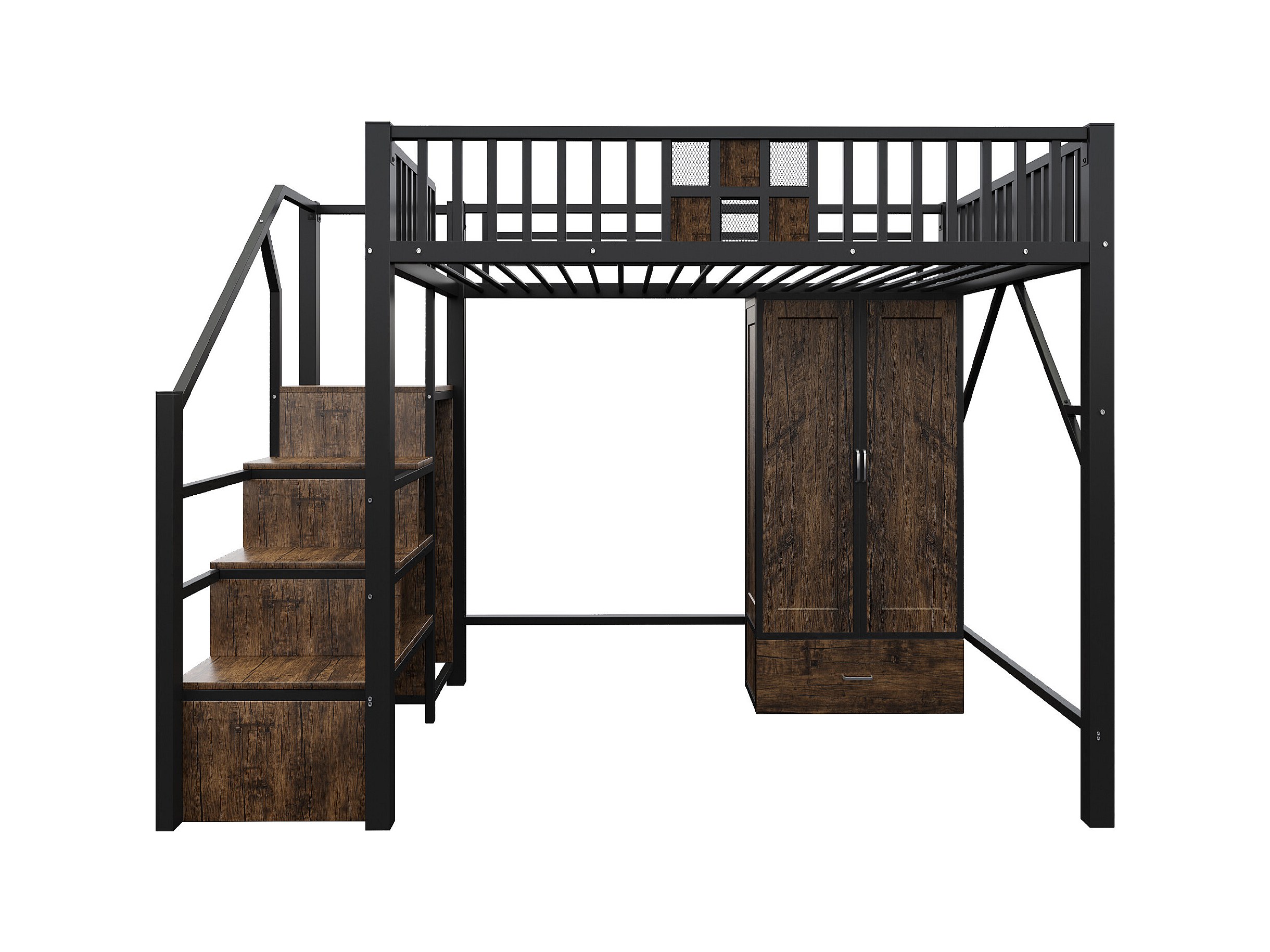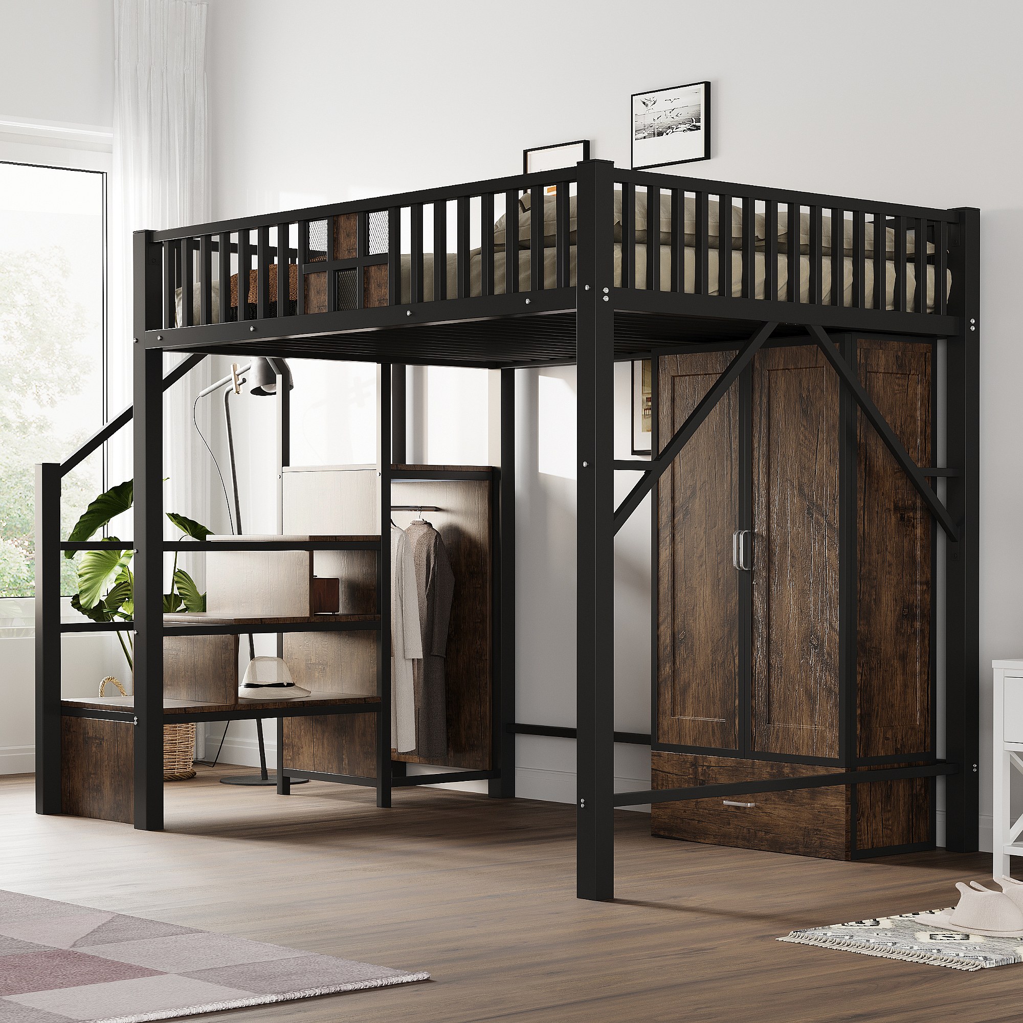 Cama altillo de metal 140x200 cm - con armario - 1 cajón - con escalera de almacenamiento - negro (colchón no incluido)