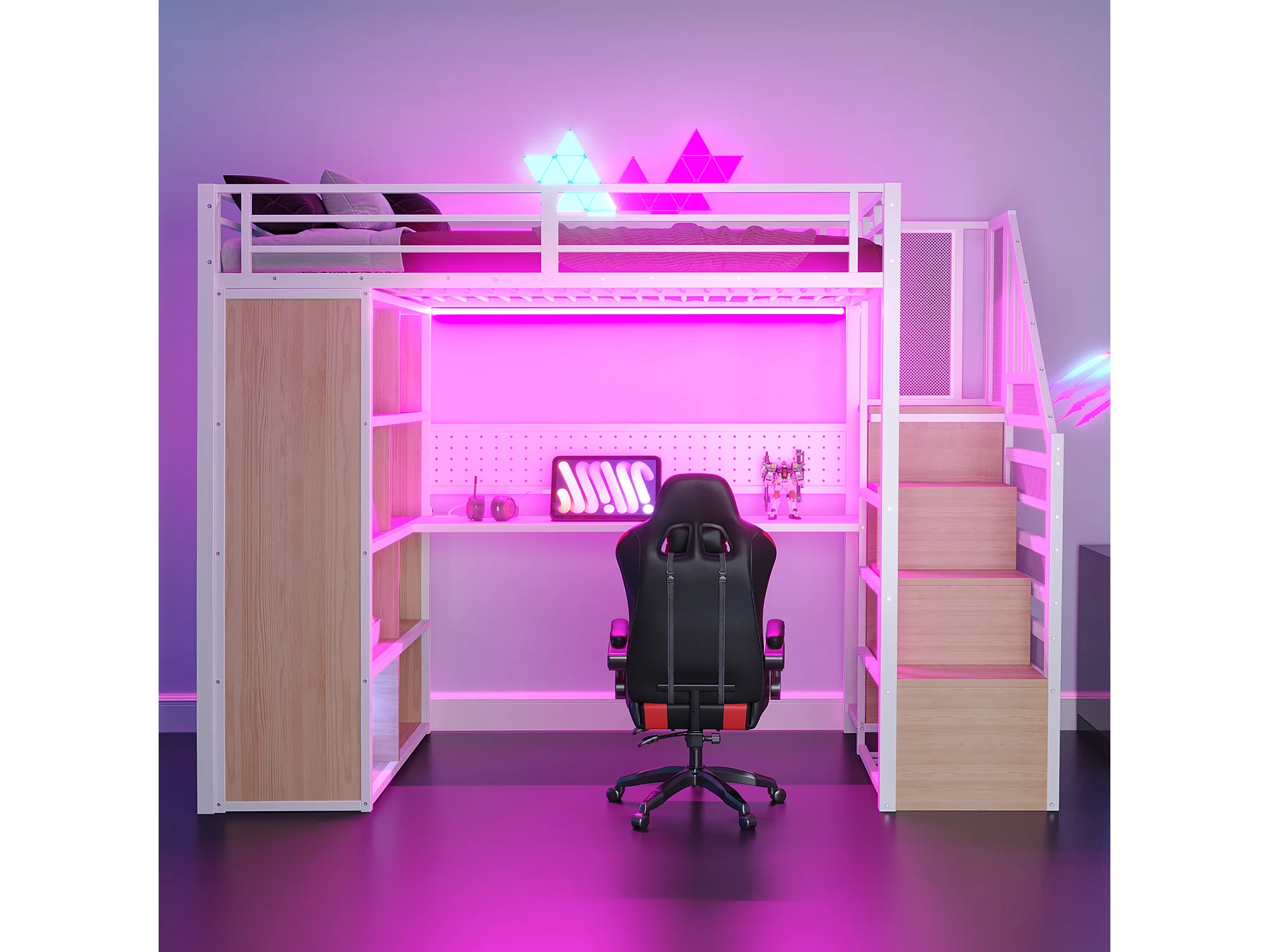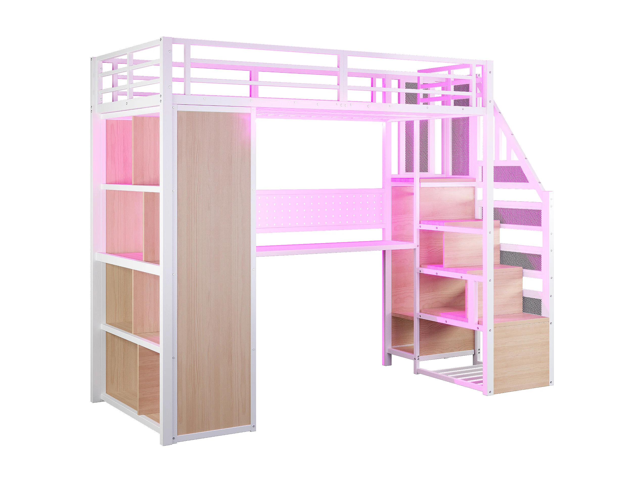 Cama altillo de metal 90x200 cm - con perchero abierto y compartimentos de almacenamiento - con escritorio y escalera - con banda de luz LED - blanco