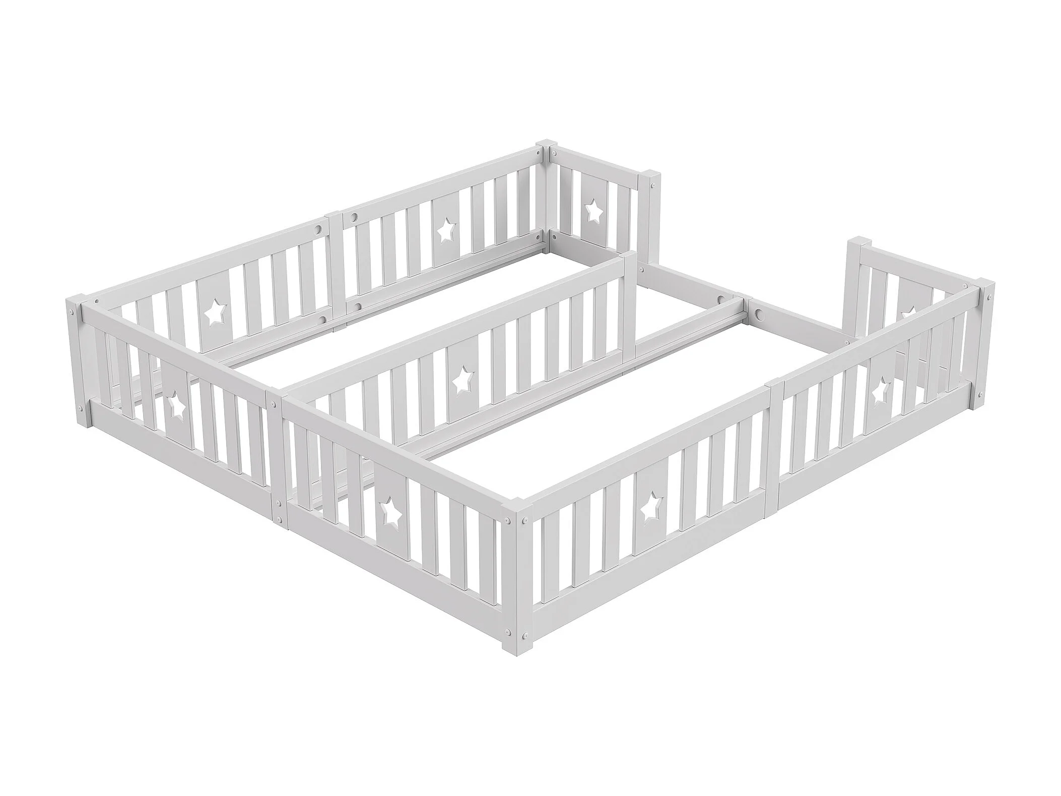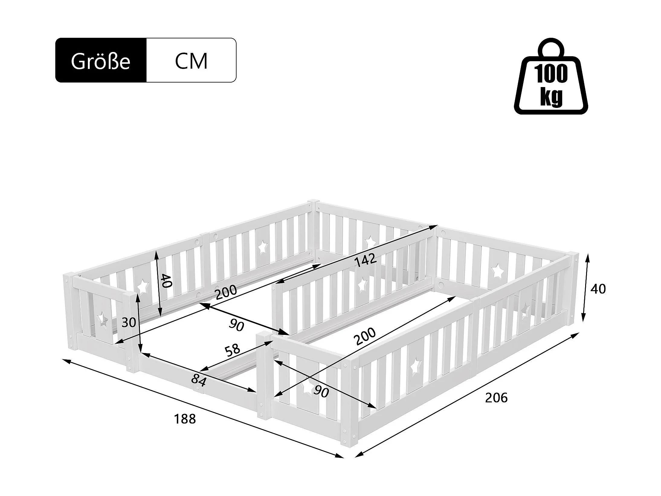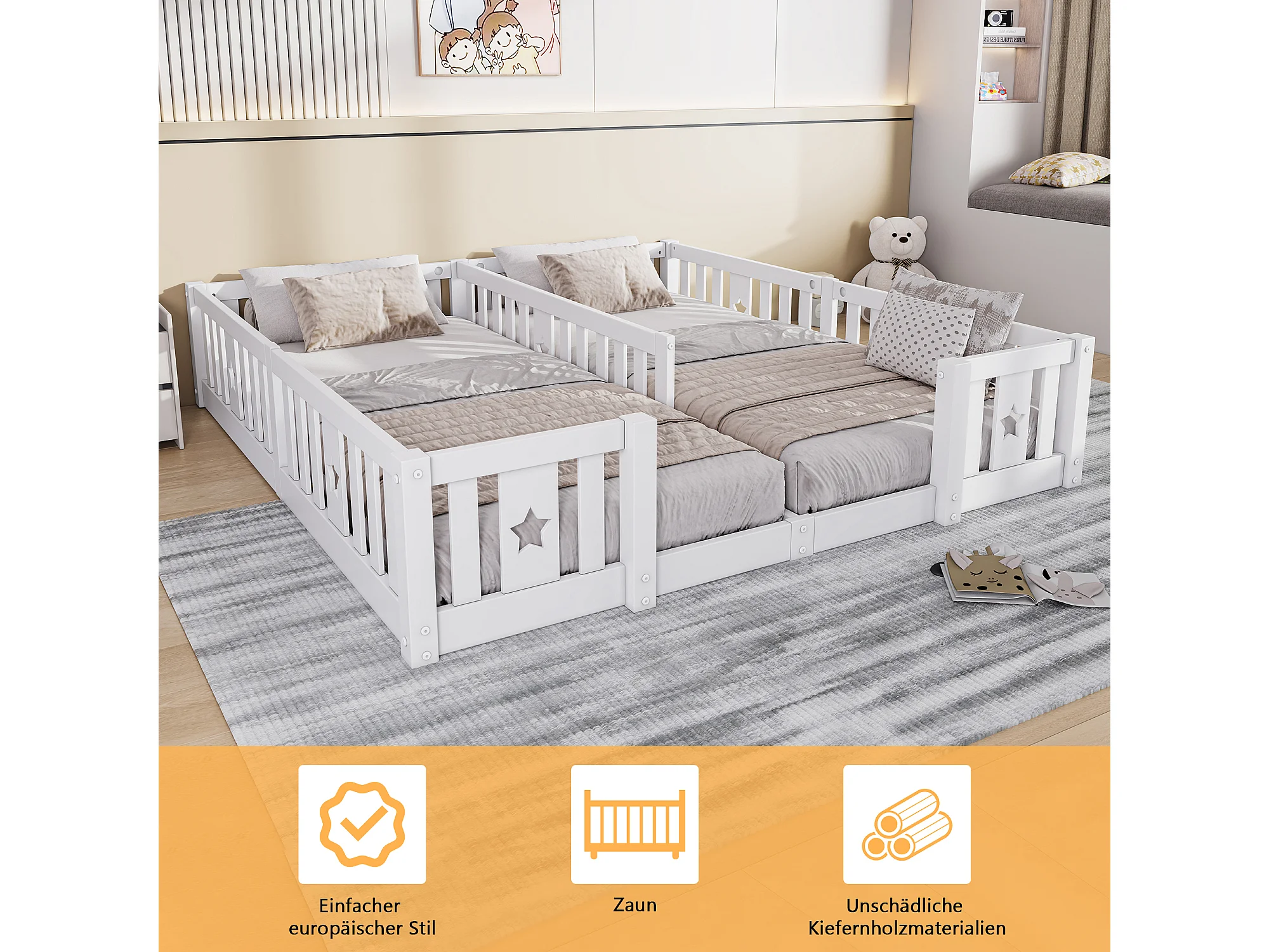 Cama baja, 180 x 200 cm, cama doble, con protección anticaídas, para 2 niños, madera maciza, blanca, sin somier de láminas