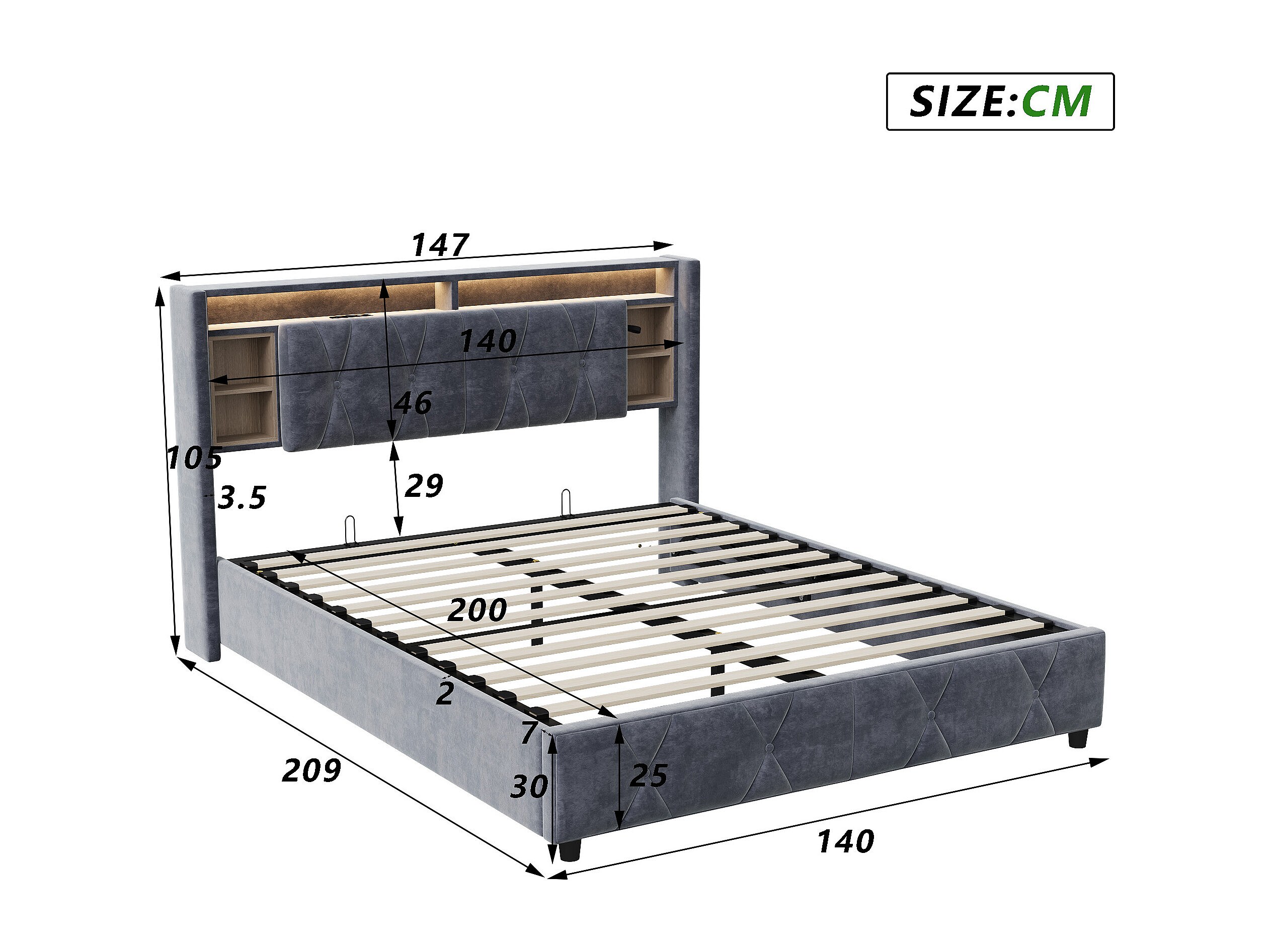 Cama de 140 x 200 cm con cabecero LED y espacio de almacenaje, en terciopelo gris.