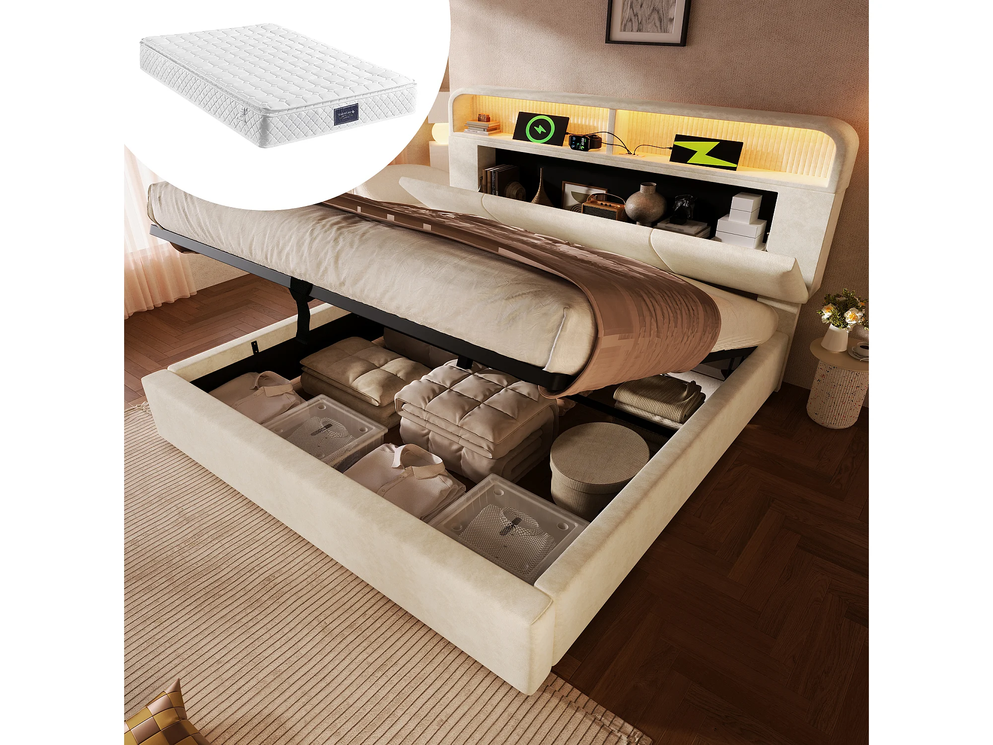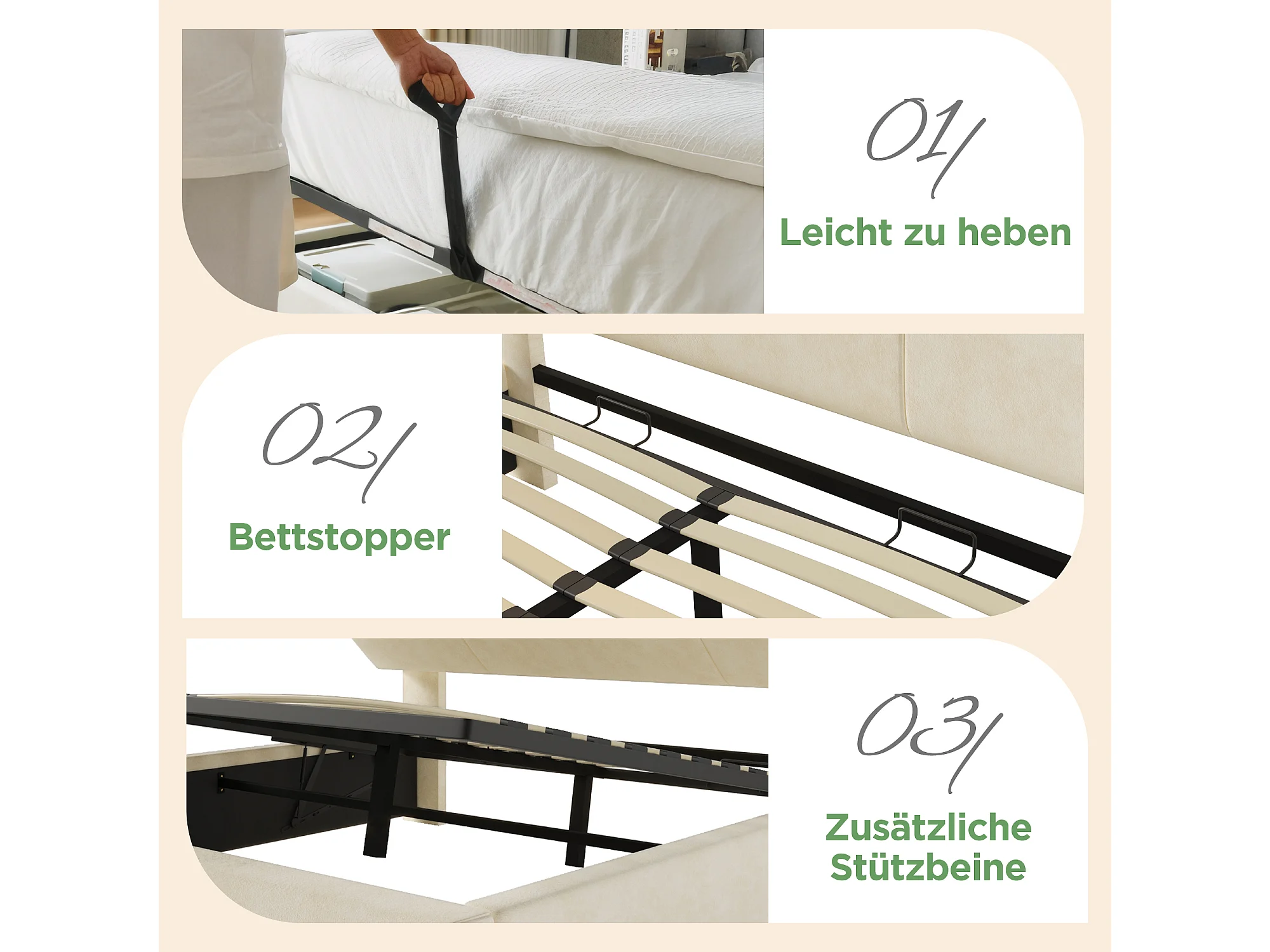 Cama basculante hidráulica - 160 x 200 cm - cabecero ajustable con espacio de almacenaje - con LED + USB/Tipo C - terciopelo - beige (con colchón)