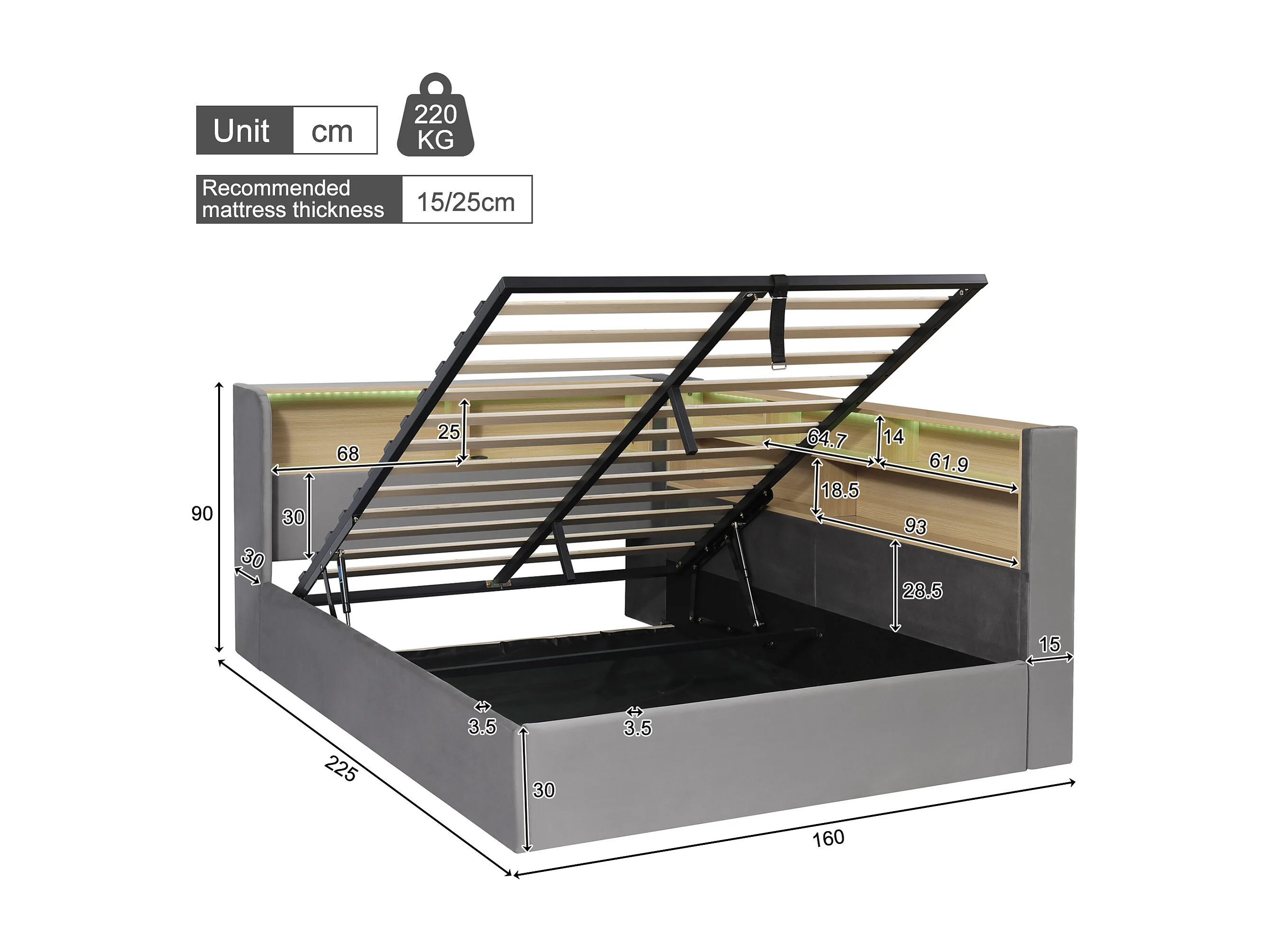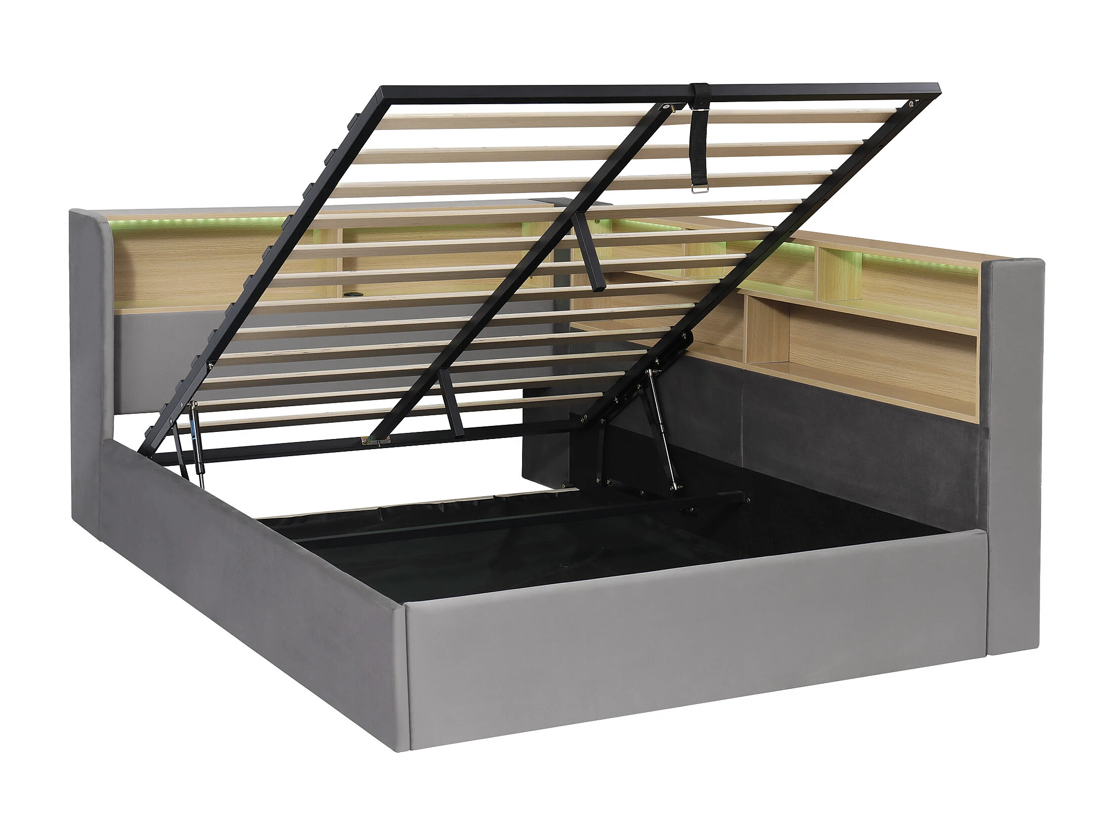 Cama basculante para adultos de 140 x 200 cm con LED y puertos USB/Tipo C - Terciopelo gris