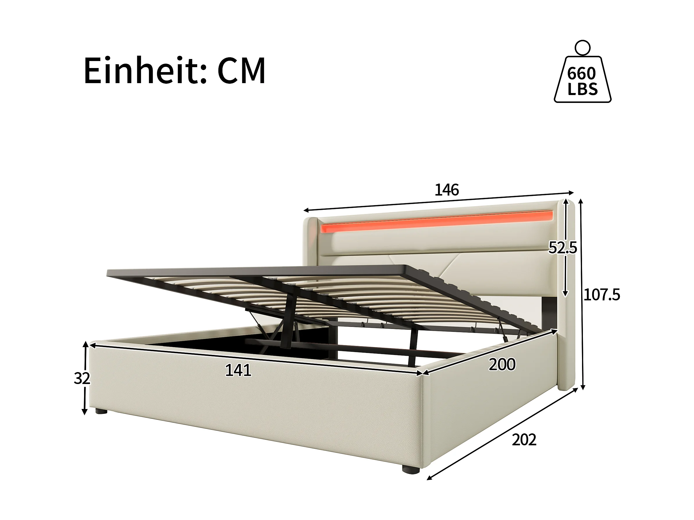 Cama baúl doble 140x200 cm con barra LED, en PU blanco (sin colchón)