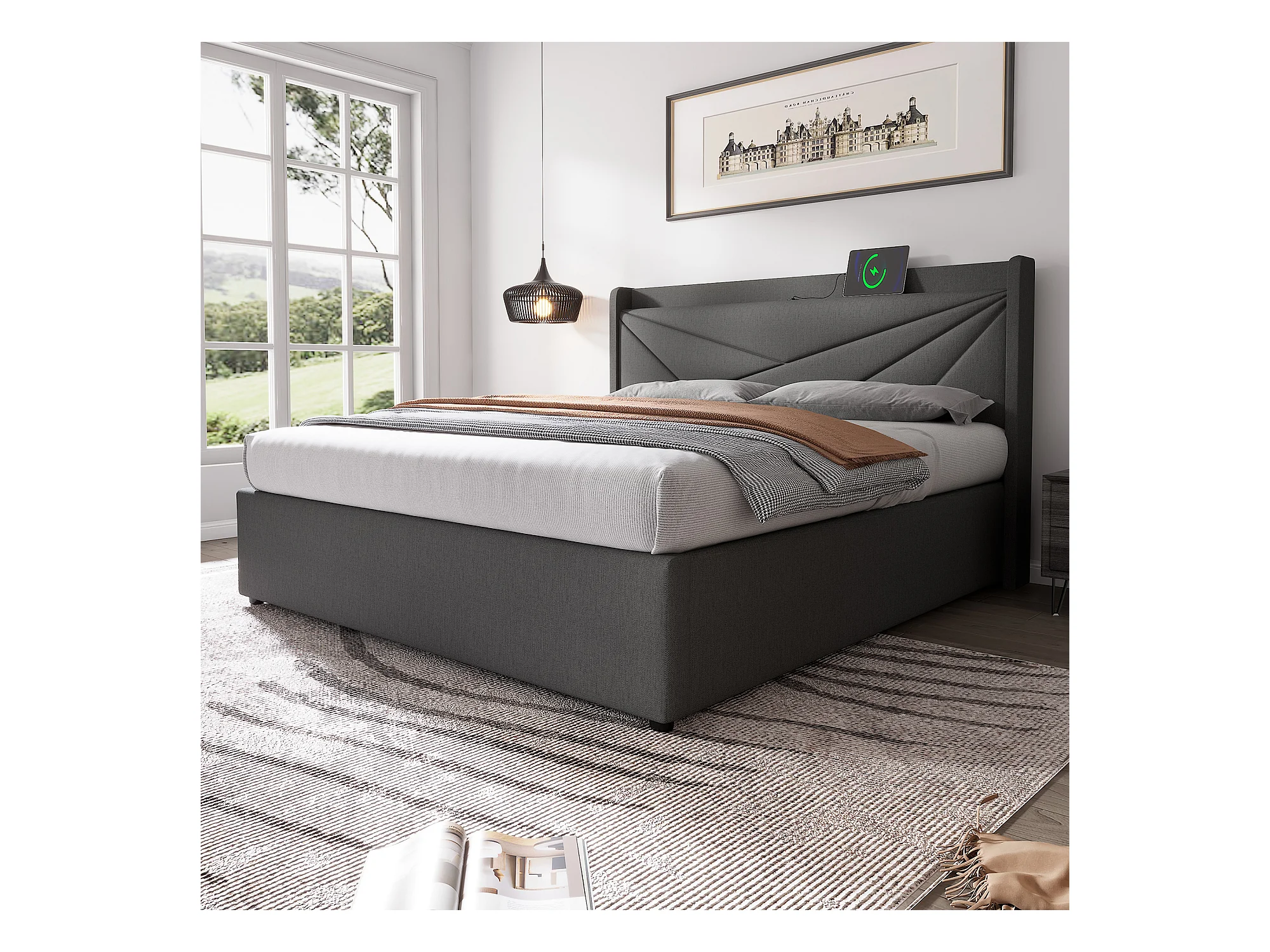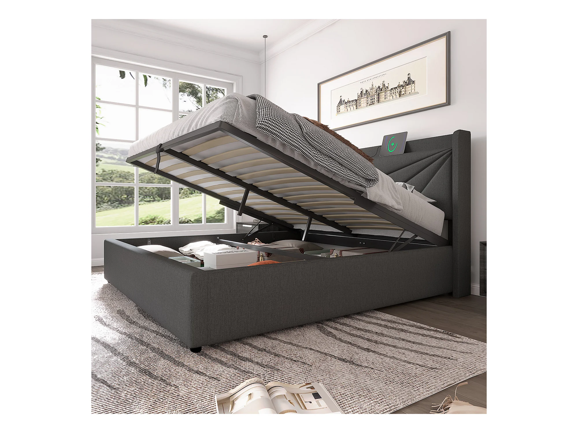 Cama baúl doble 160x200 cm con cabecero, función de carga USB Tipo-C, lino gris (sin colchón)
