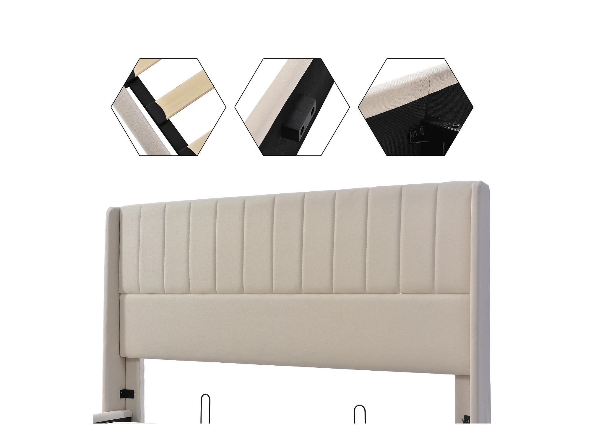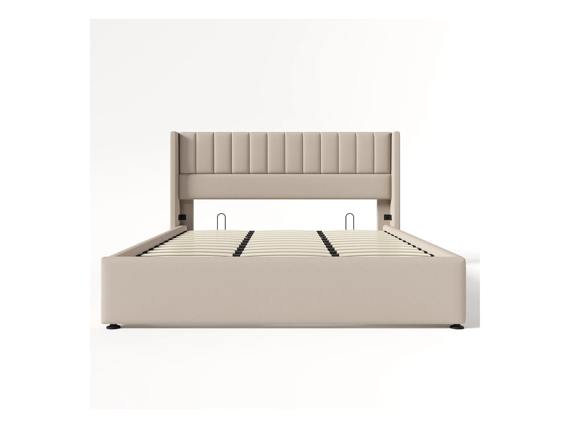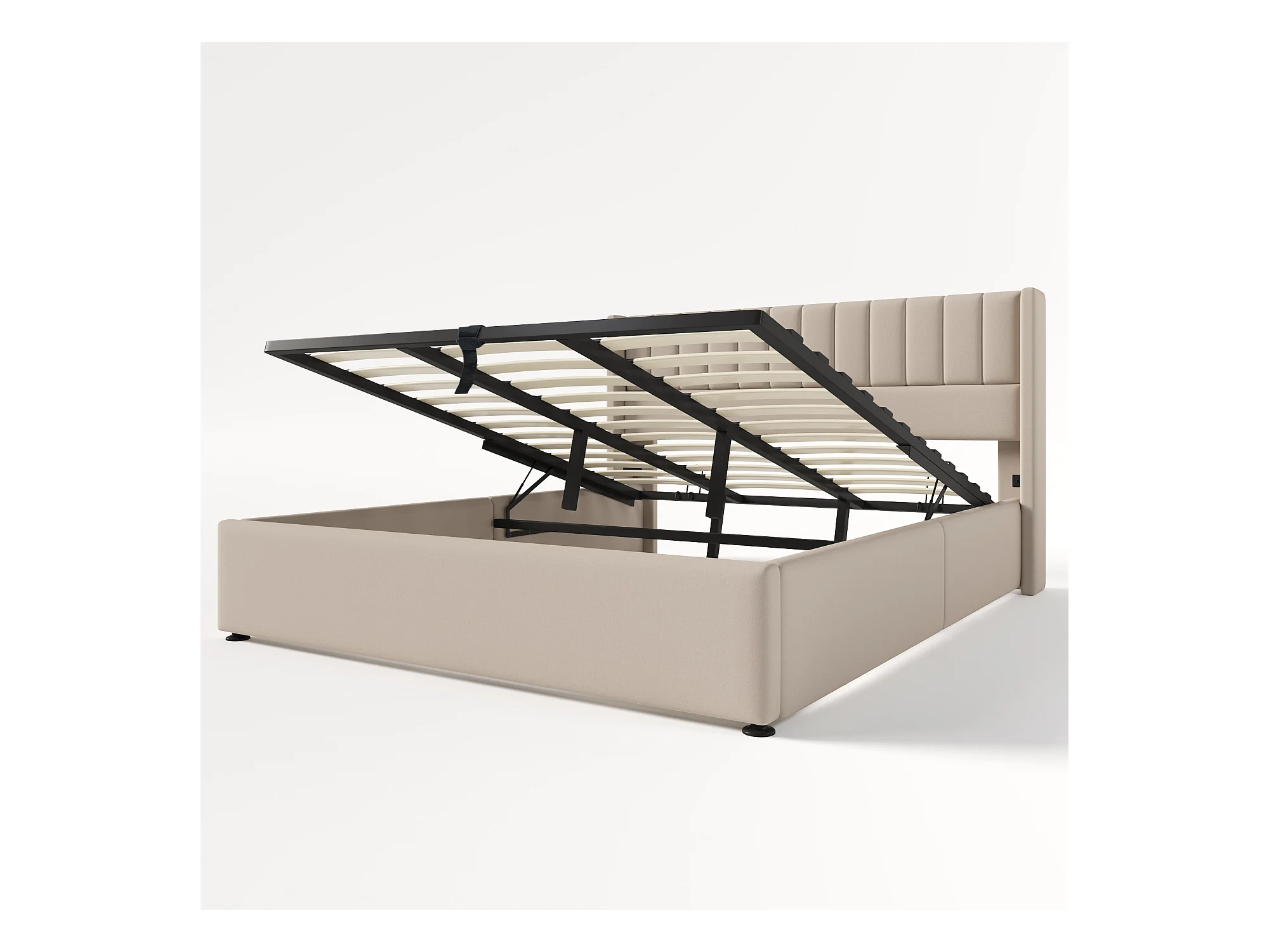 Cama baúl doble 180x200 cm para adultos, con sistema hidráulico, somier de lamas de madera y tapizado en lino beige (sin colchón)