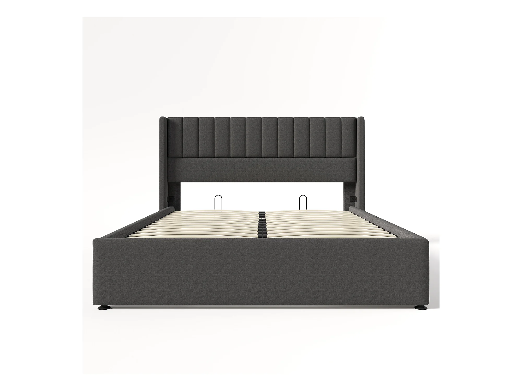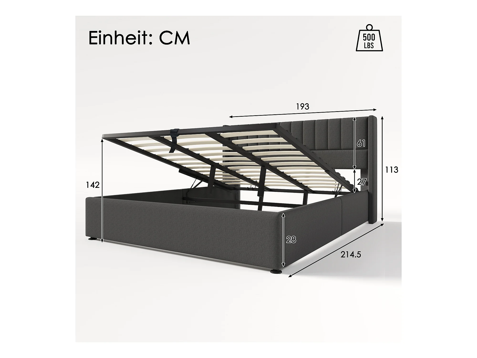 Cama baúl doble 180x200 cm para adultos, con sistema hidráulico, somier de lamas de madera y tapizado en lino gris (sin colchón)