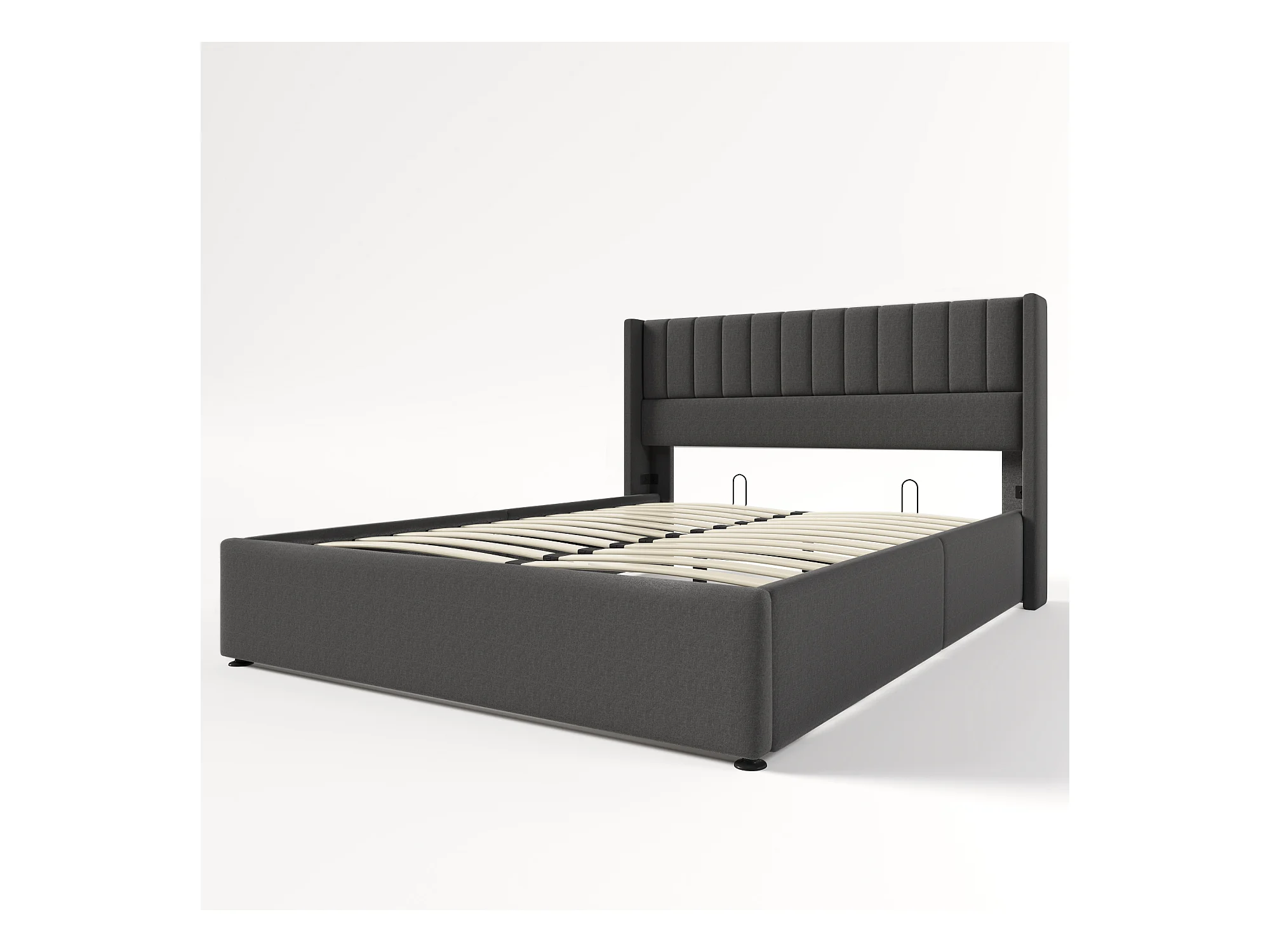 Cama con almacenaje 180x200 cm - Cama doble con iluminación LED y carga USB - lino gris - sin colchón