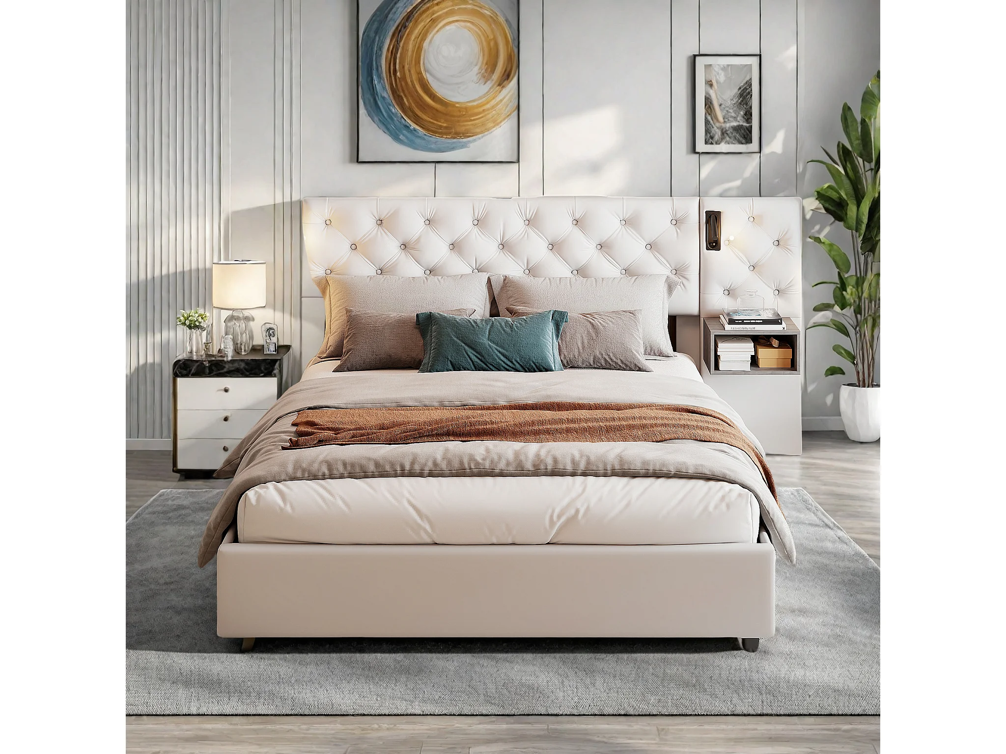 Cama tapizada en blanco de 140x200 cm con elevación a gas, mesitas de noche dobles y lámparas de noche, tela de terciopelo, almacenaje moderno y confort.
