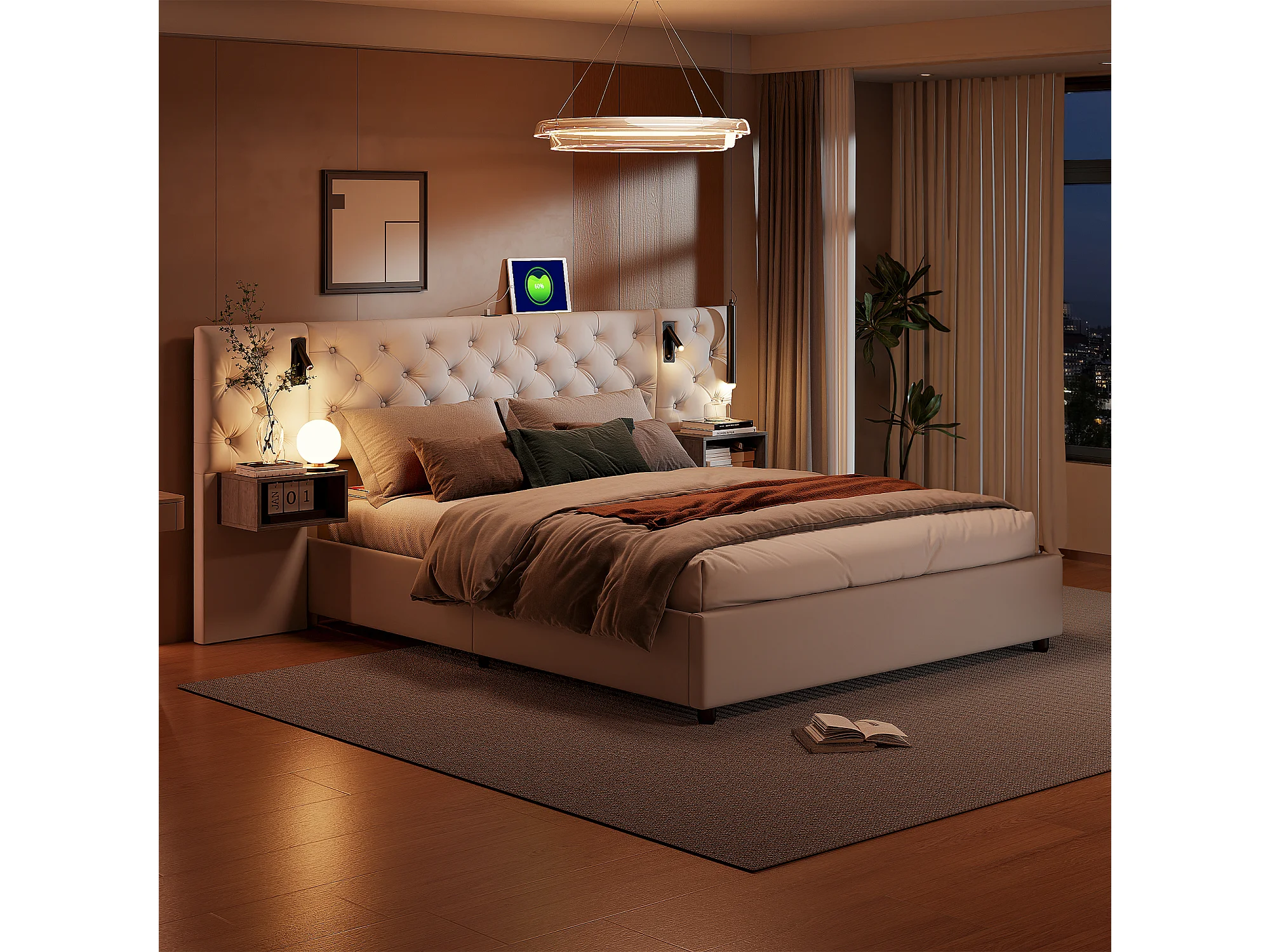Cama blanca tapizada de 140 x 200 cm con elevación de gas, mesitas de noche dobles y lámparas de noche, tela de terciopelo, almacenaje moderno y cómodo.