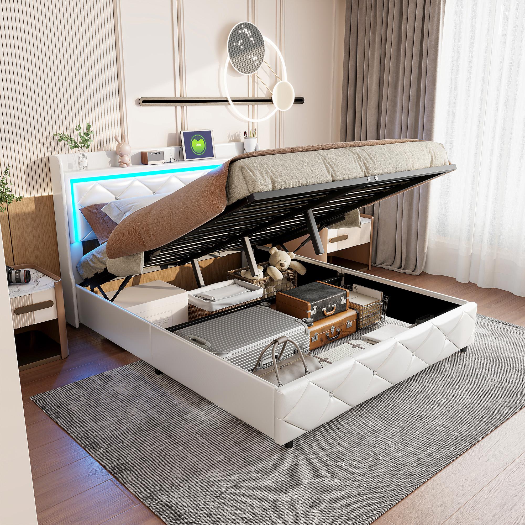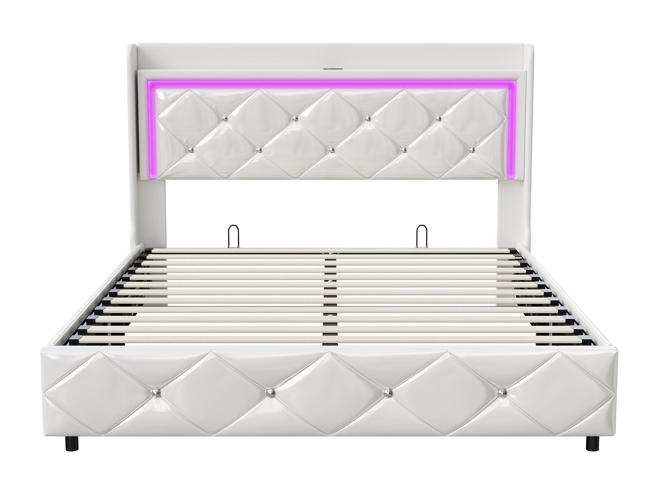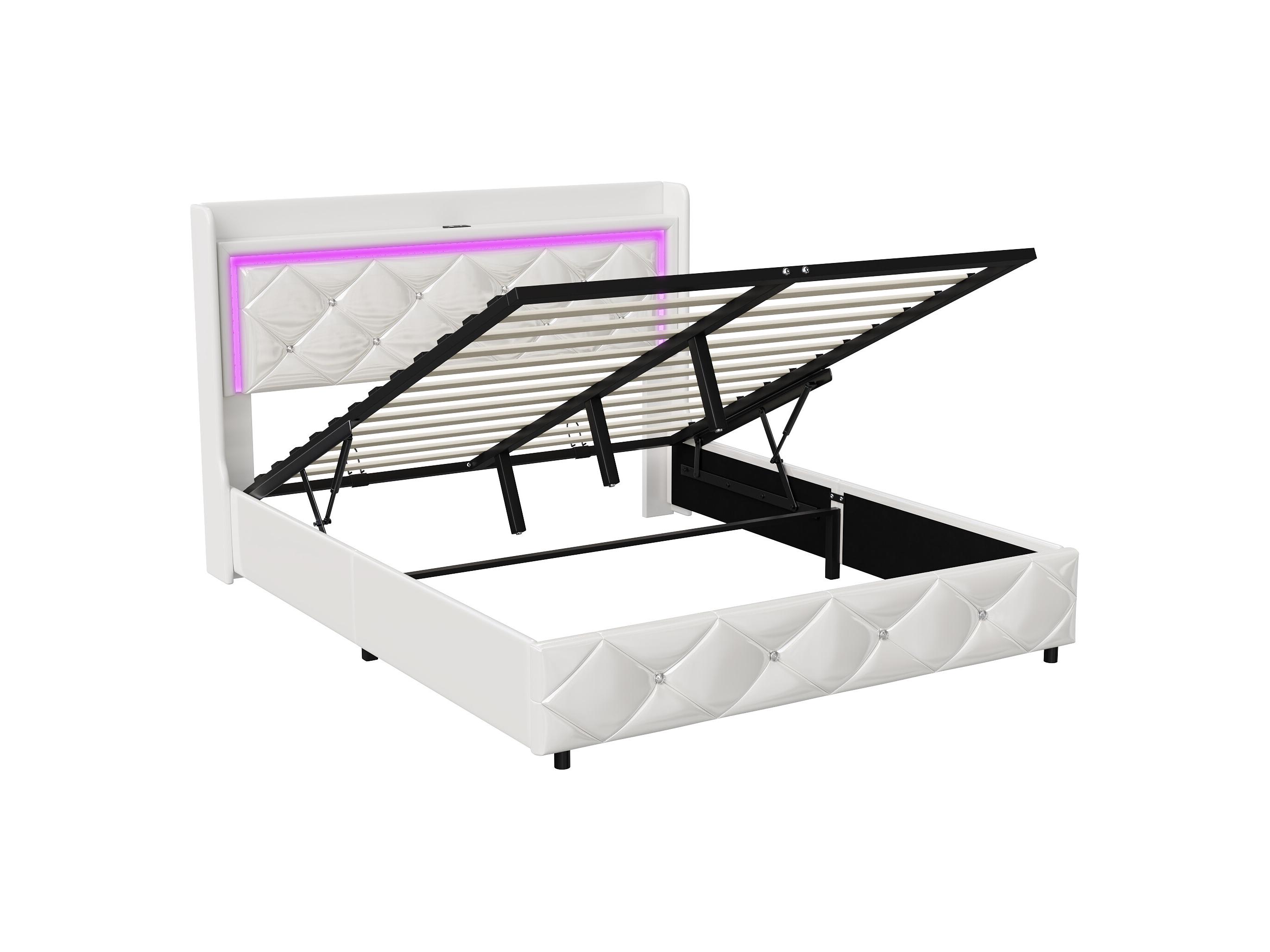 Cama doble de 140 x 200 cm con LED y puerto USB, con canapé y somier de láminas, color blanco