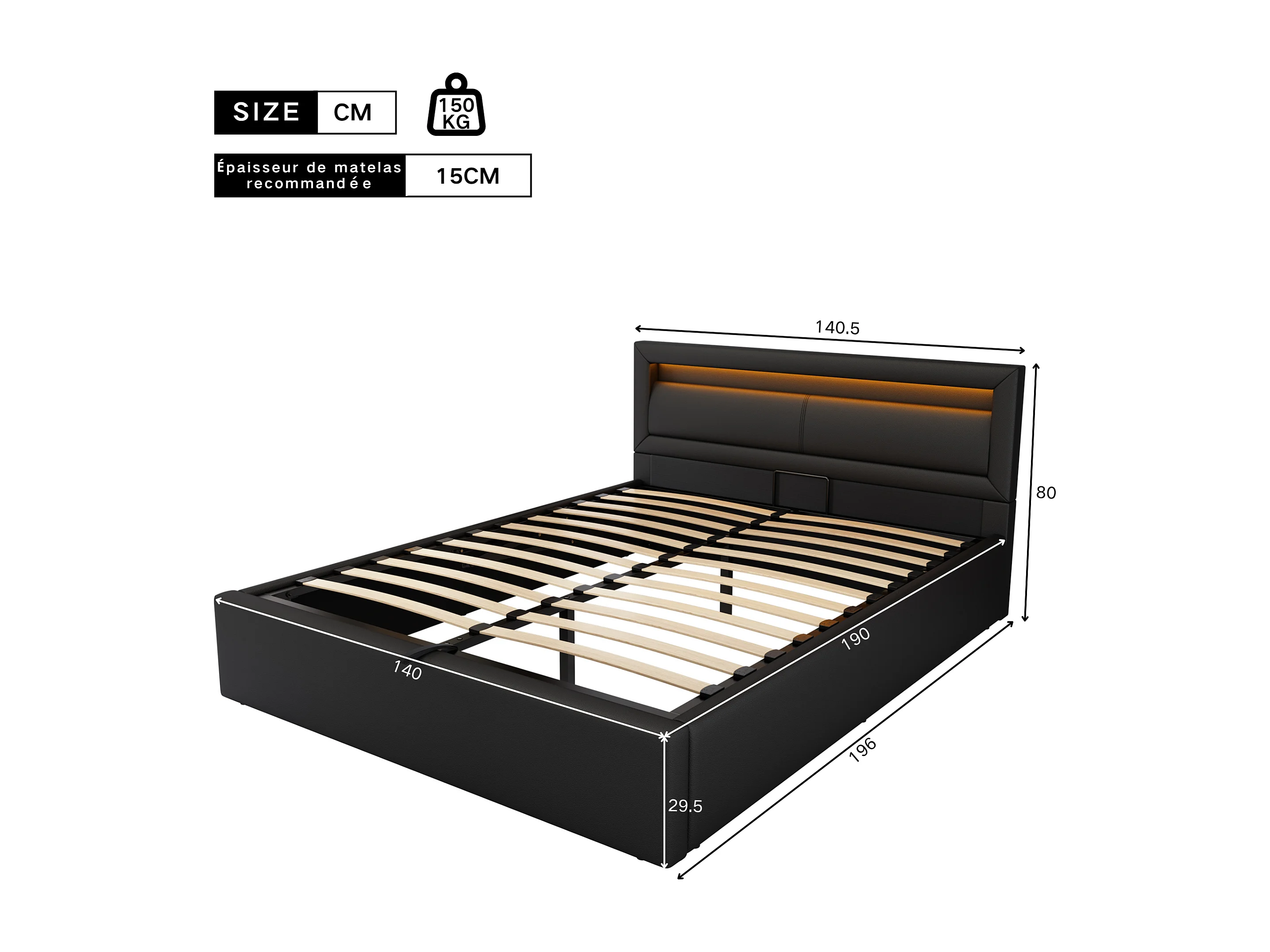 Cama canapé adulto 140x190 cm con somier de láminas - cabecero tapizado y LED - polipiel - color negro (sin colchón)