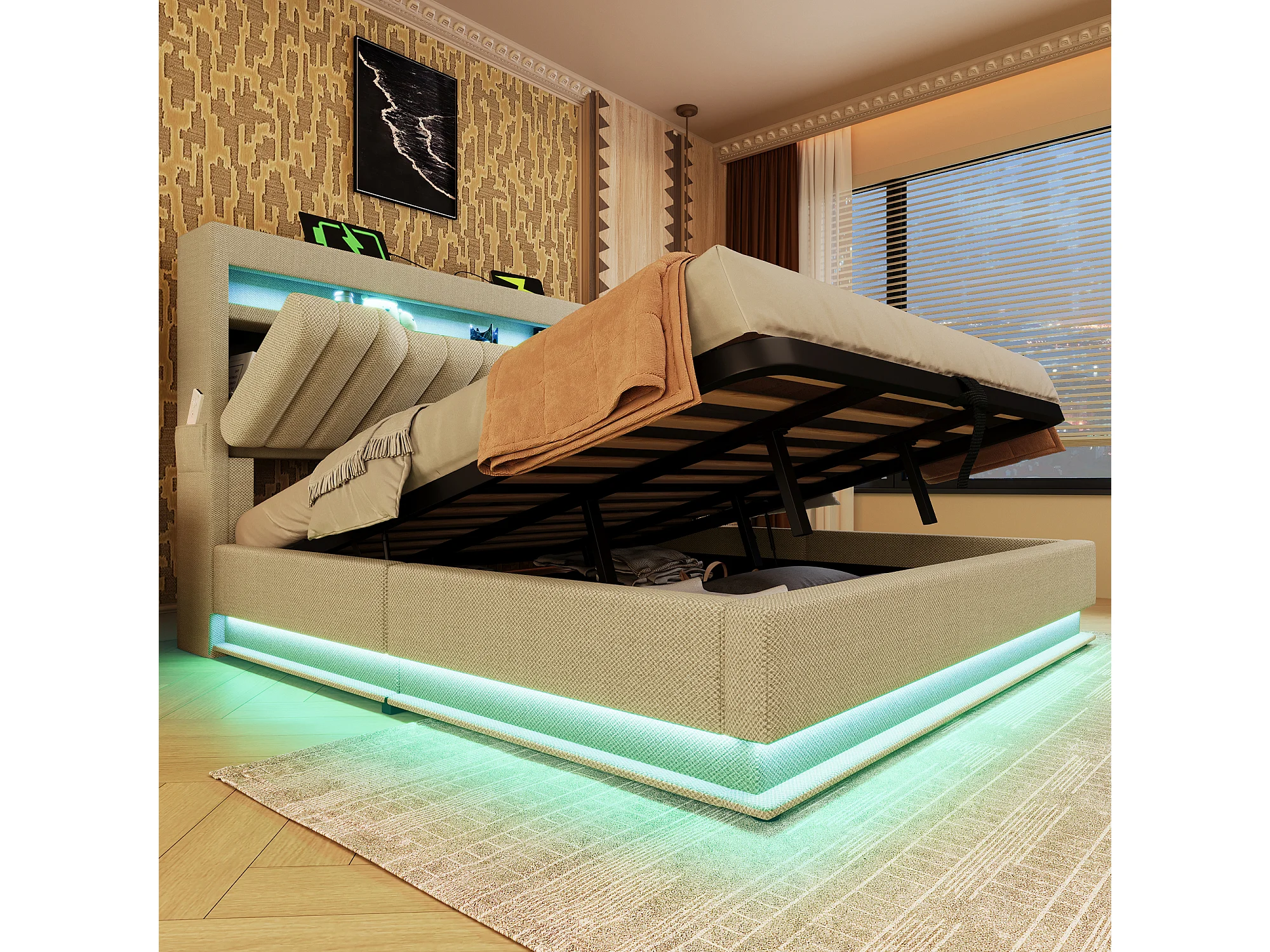 Cama con almacenaje para adultos 160x200cm en lino beige, con LED y USB, somier de láminas, sin colchón
