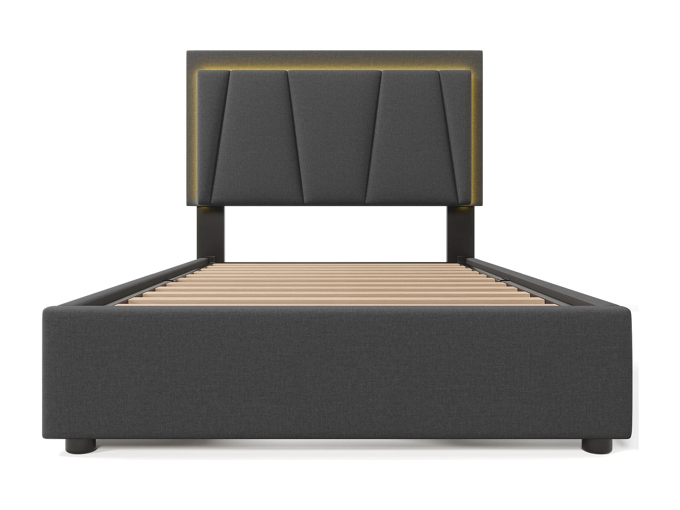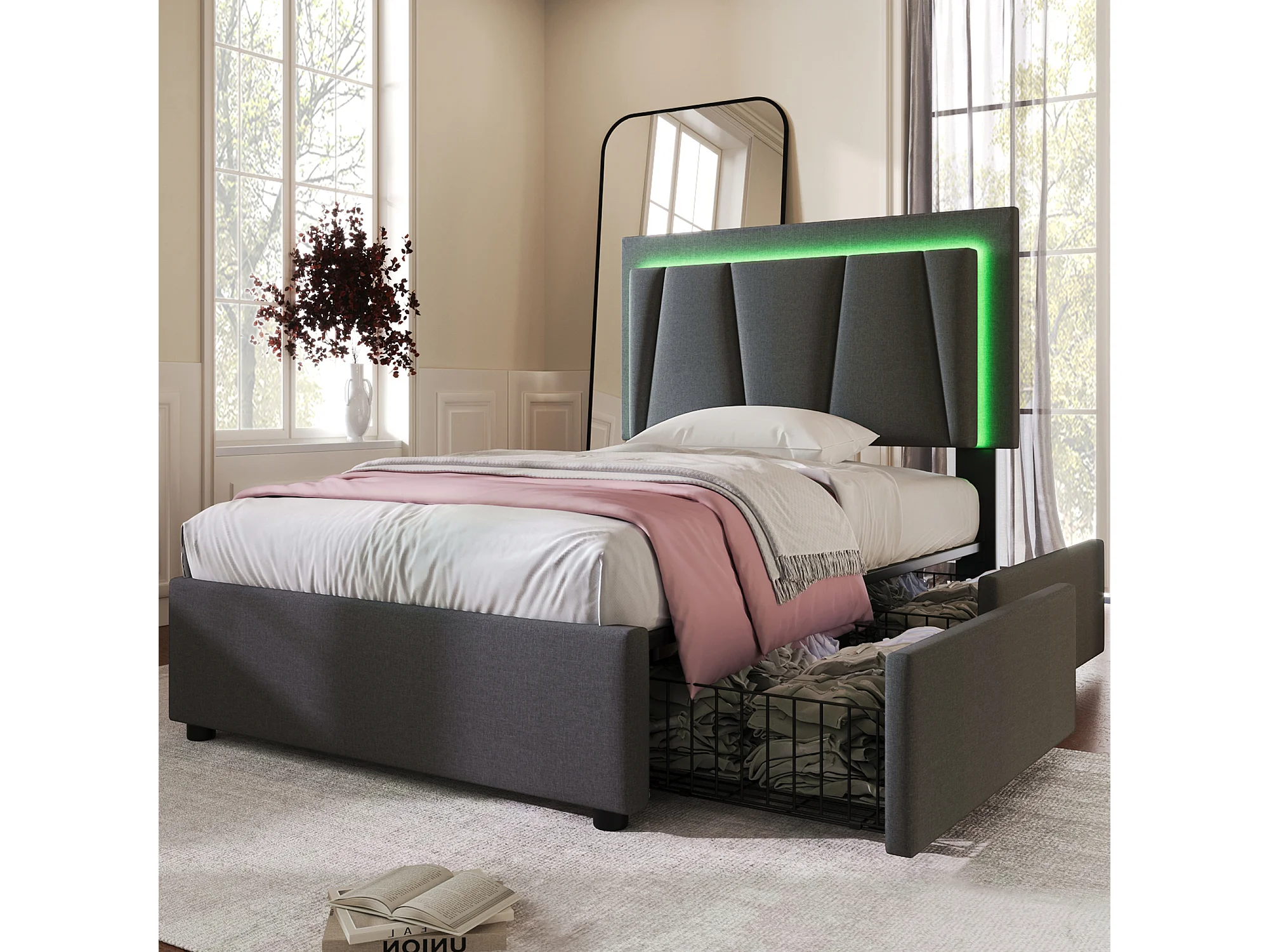 Cama canapé adulto 90x200cm con iluminación LED y 2 cajones - Tejido de lino gris (Colchón incluido)