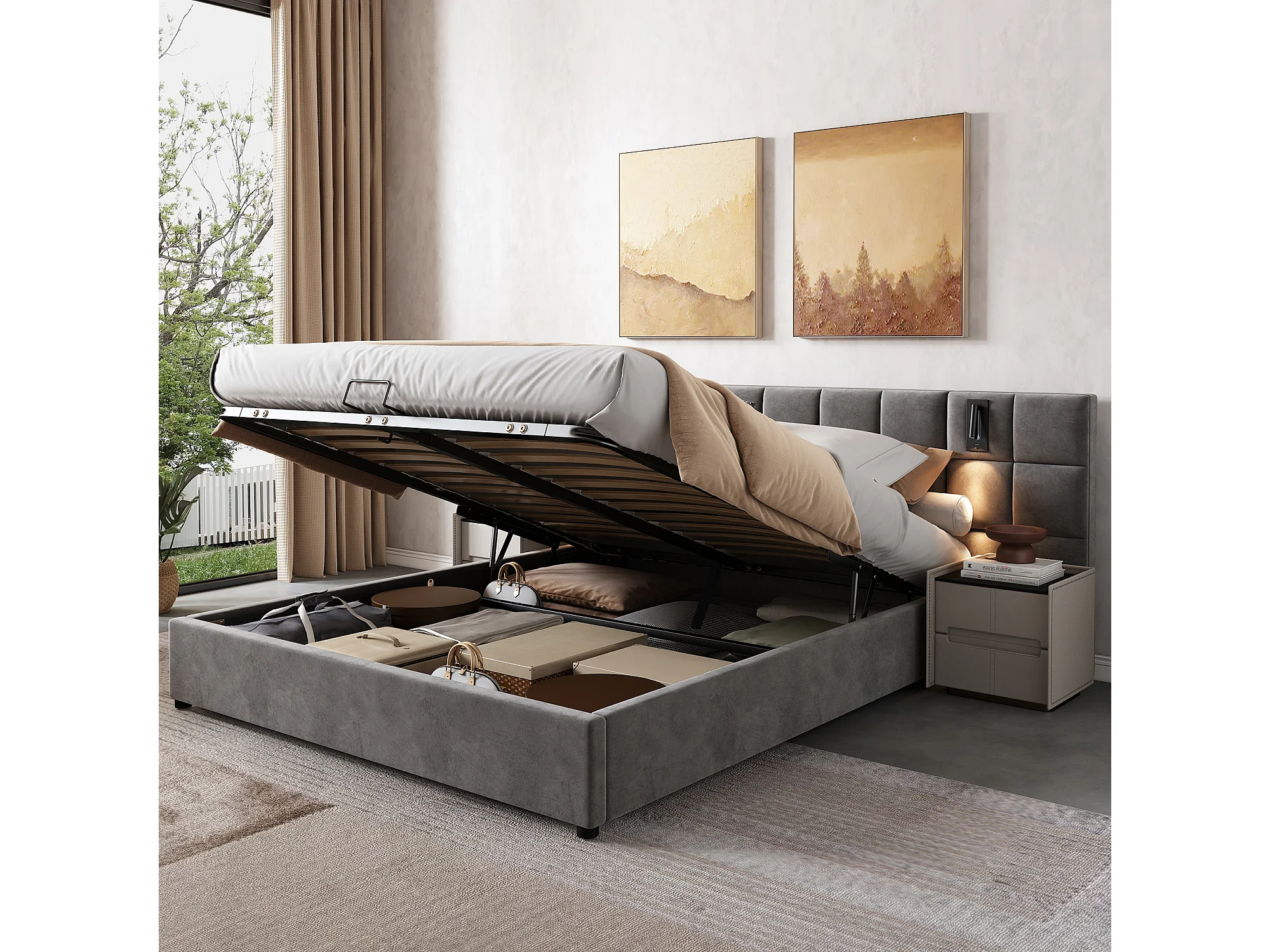 Cama basculante de 140 x 200 cm con LED, tapizada hidráulica, cabecero y somier de láminas, gris, terciopelo