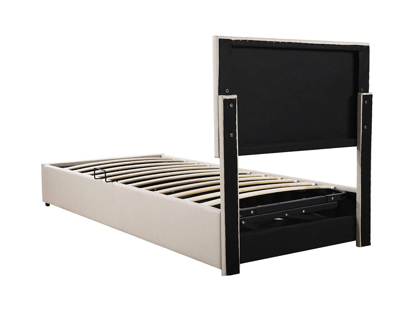 Cama individual 90x200 de tela con canapé y base de metal beige
