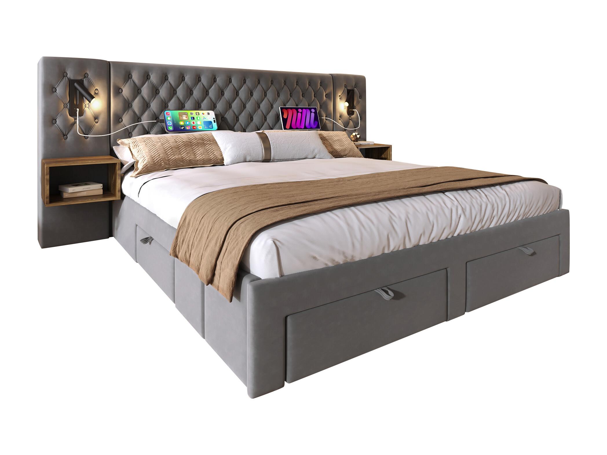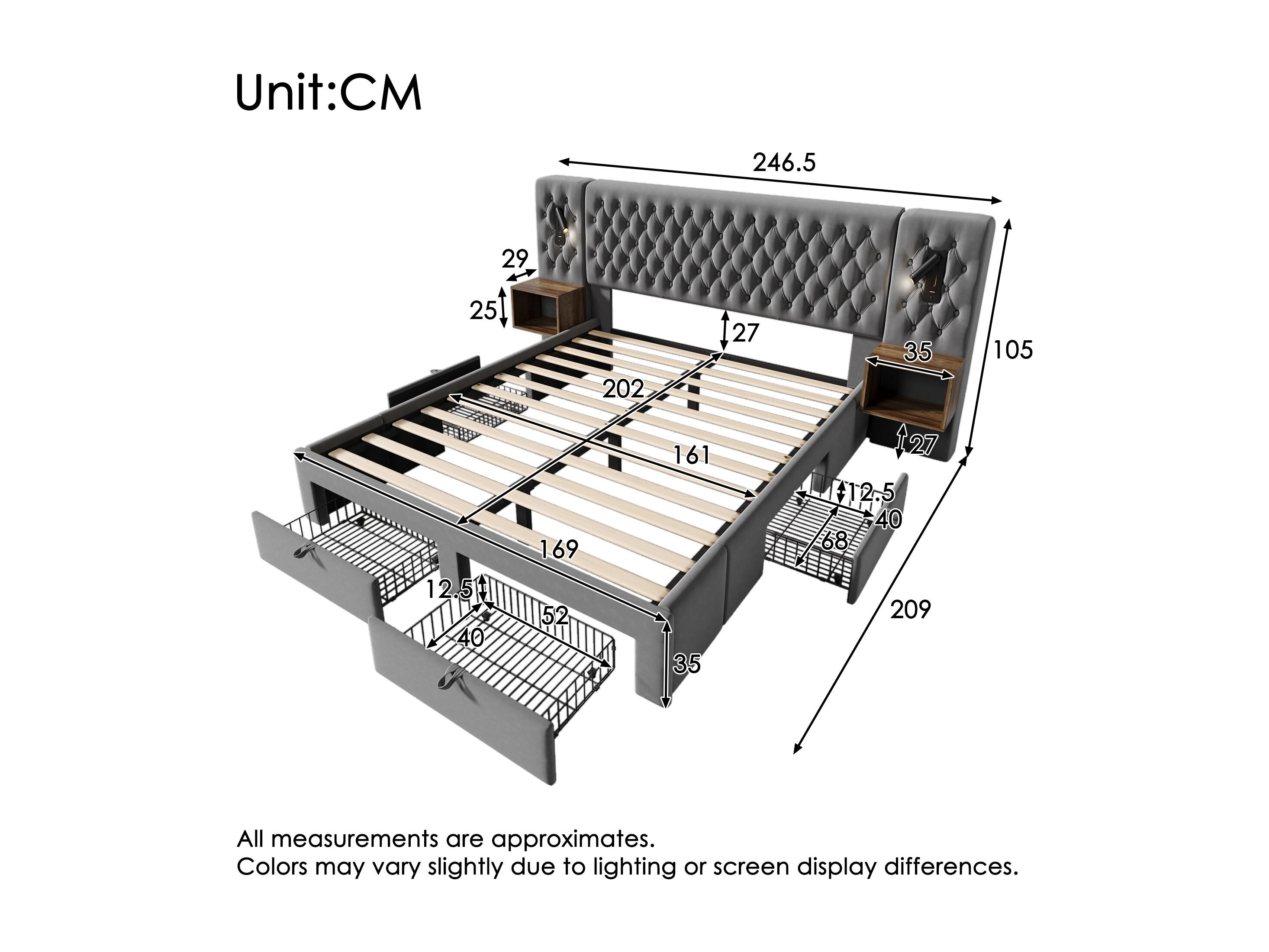 Cama completa con cabecero y lámparas de lectura, 160×200 cm, tela de terciopelo gris, con 2 mesitas de noche y 4 cajones, con colchón (209x246,5x105 cm)