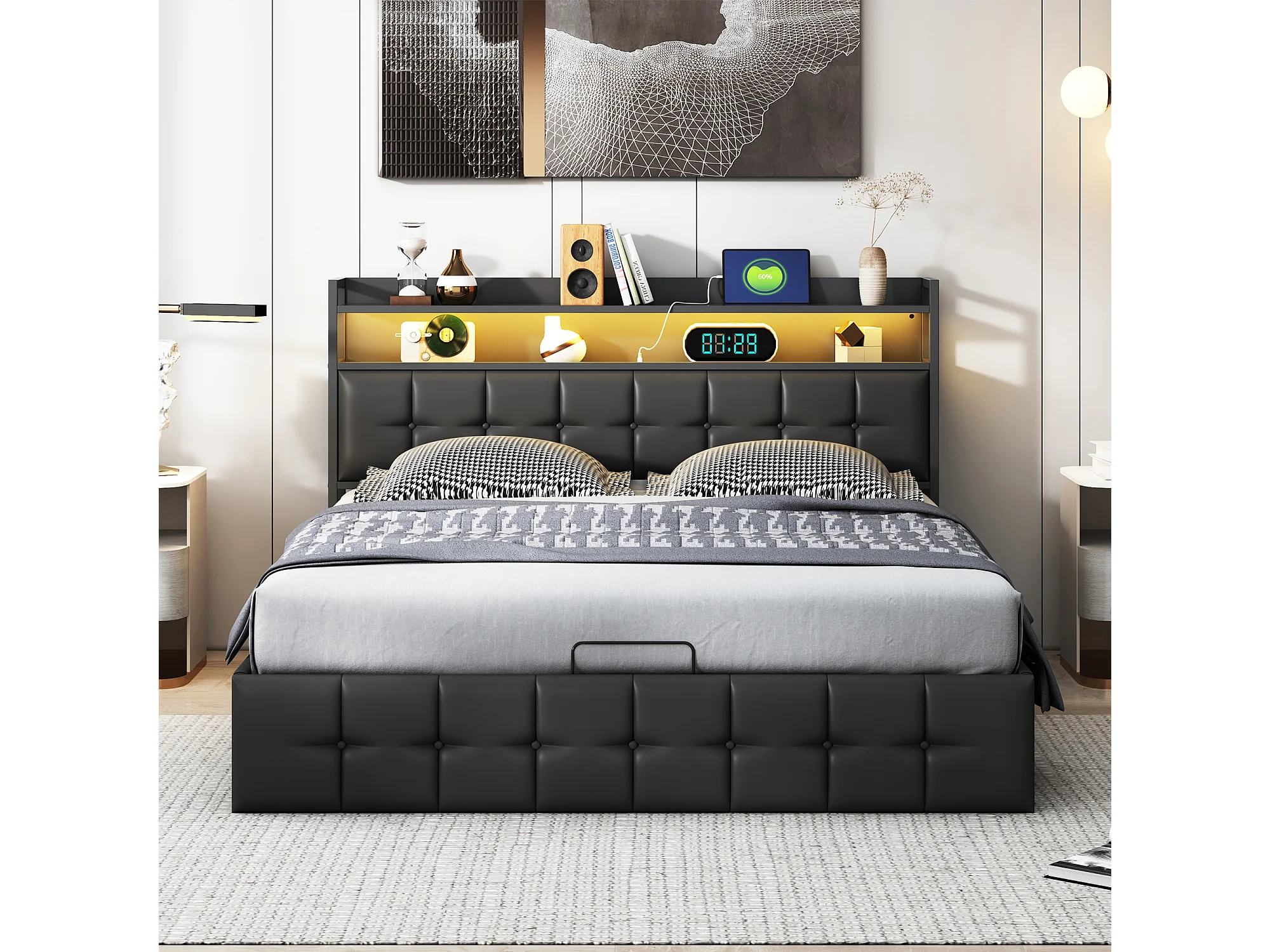 Cama con almacenaje de 140 x 200 cm - con LED y carga USB - Cabecero con compartimento de almacenamiento - Tejido PU - Negro