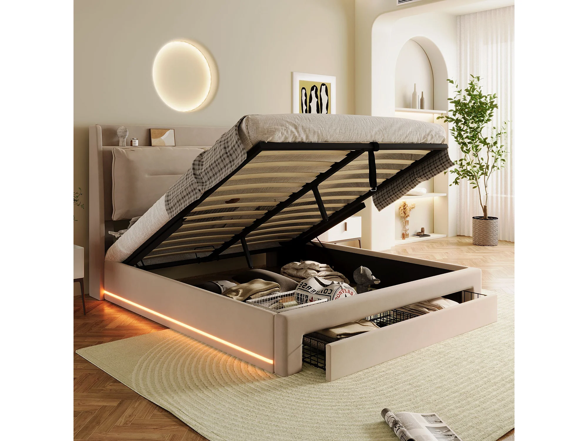 Cama con almacenaje 140x190 cm, cama para adultos con 1 cajón y cabecero tapizado, luz LED - terciopelo beige (sin colchón)