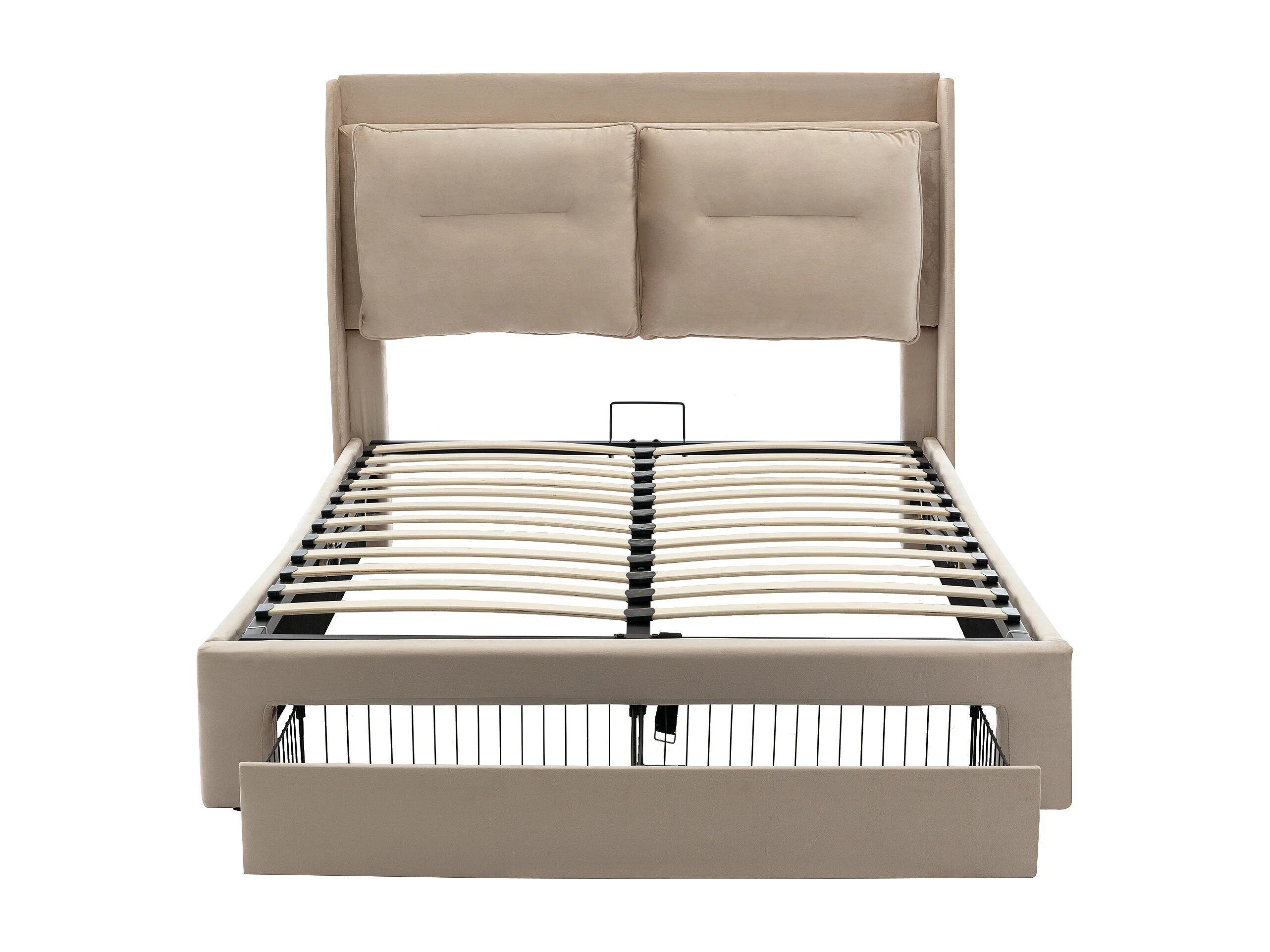 Cama con almacenaje 180x200 cm, cama doble con 1 cajón y cabecero tapizado, luz LED - terciopelo beige (sin colchón)