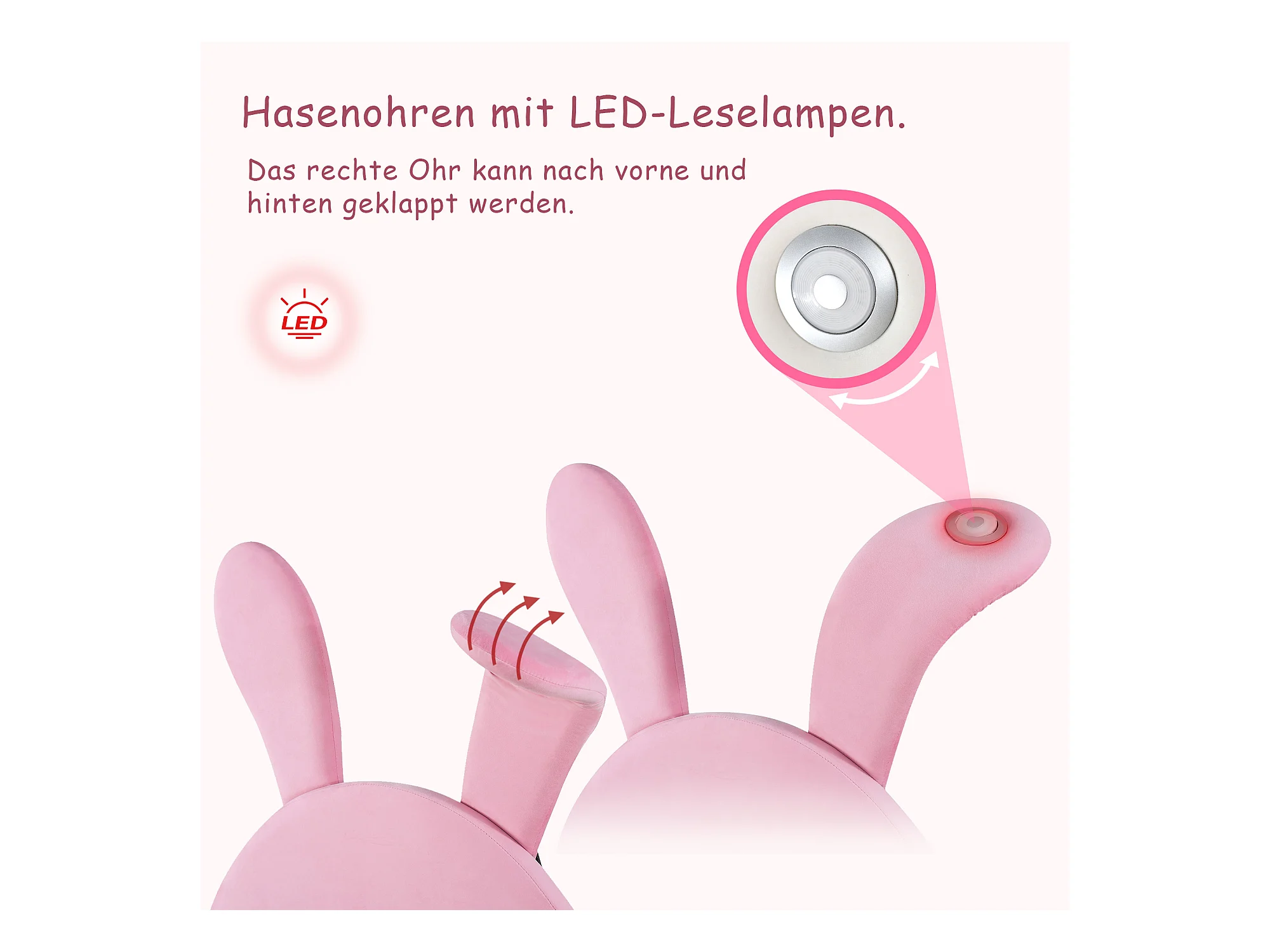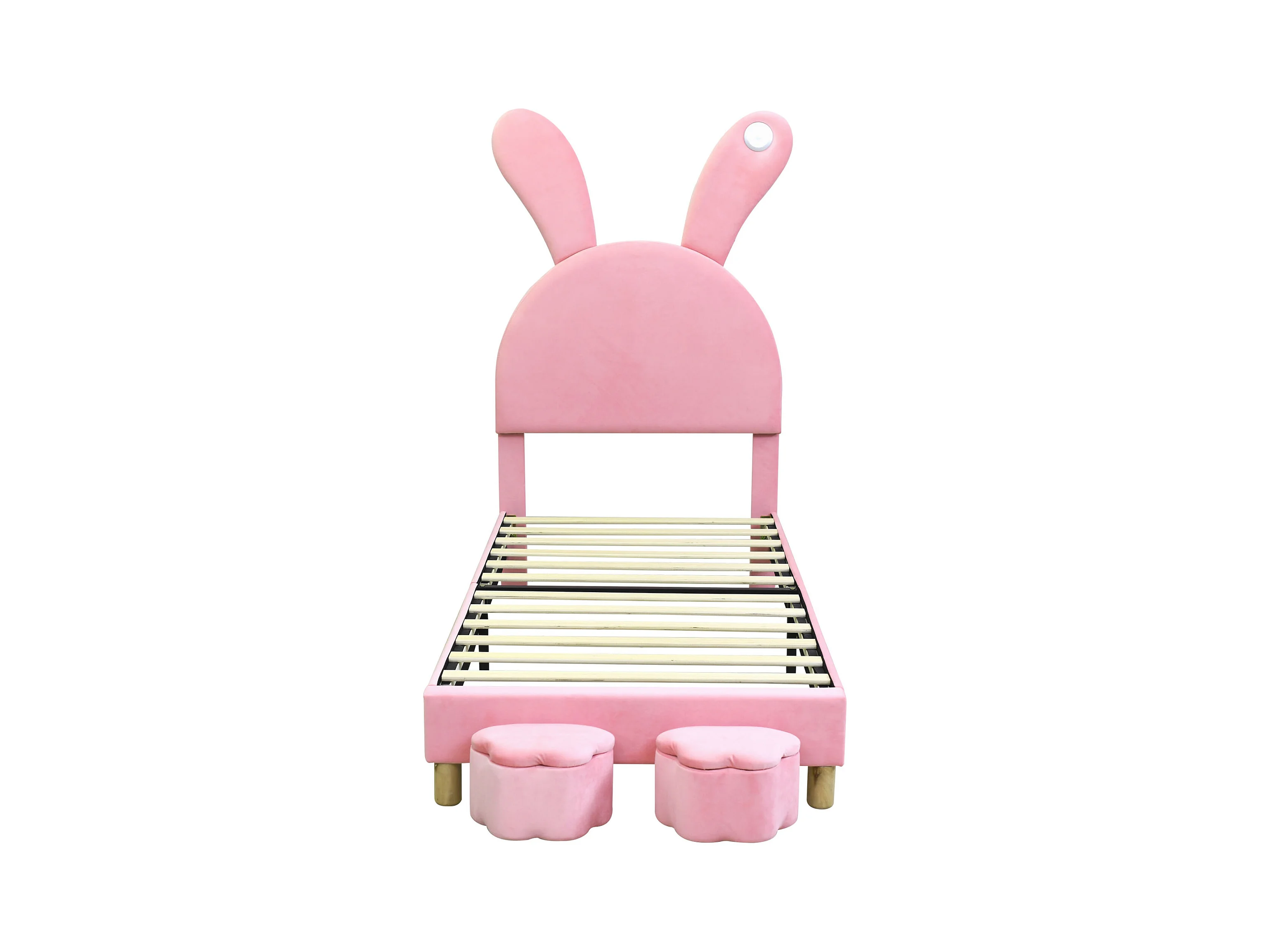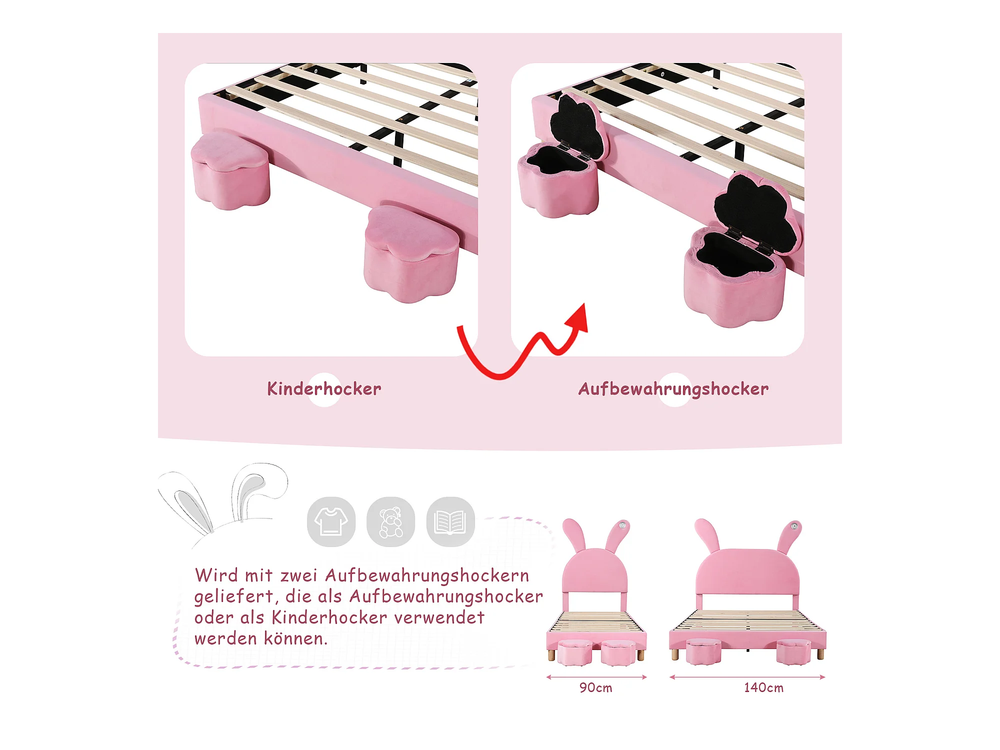 Cama con almacenaje 90x200, 2 pufs, iluminación LED, cabezales abatibles, en terciopelo rosa (90x203,5x145/151,5 cm)