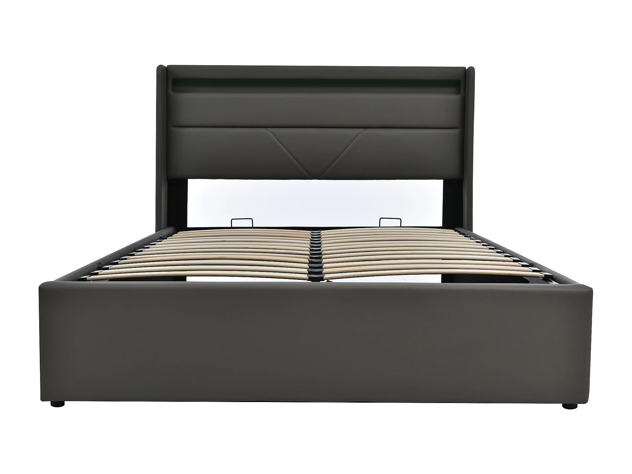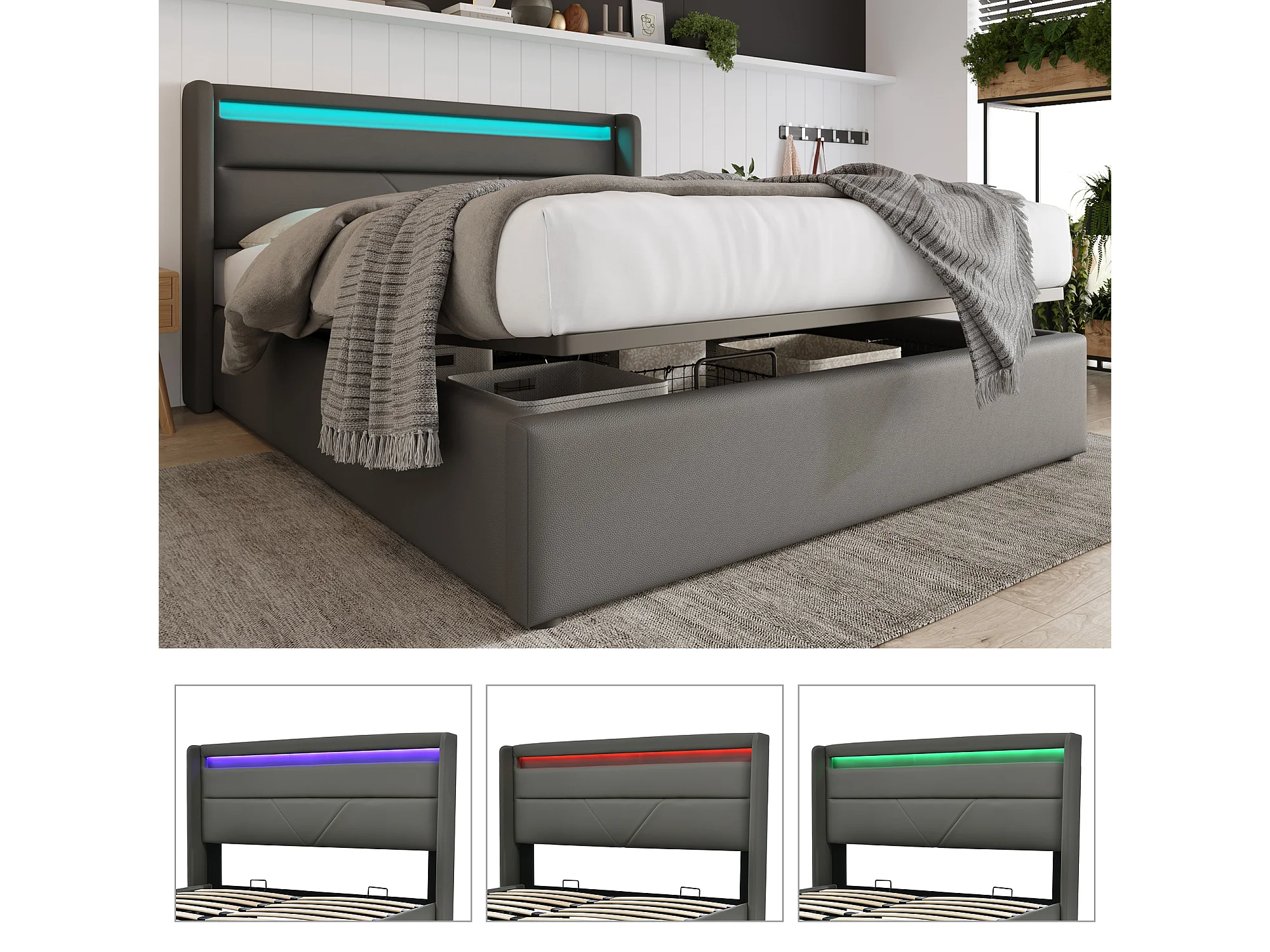 Cama con almacenaje de 140 x 200 cm con iluminación LED y colchón - Piel sintética gris