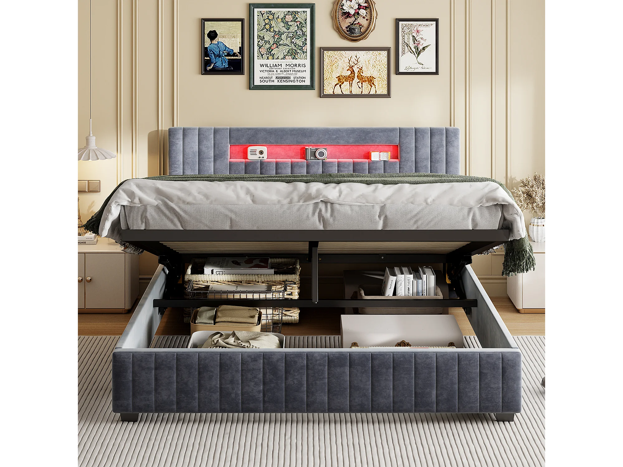 Cama con almacenaje de 140x200 cm con iluminación LED - compartimento hidráulico y somier de láminas - terciopelo - gris