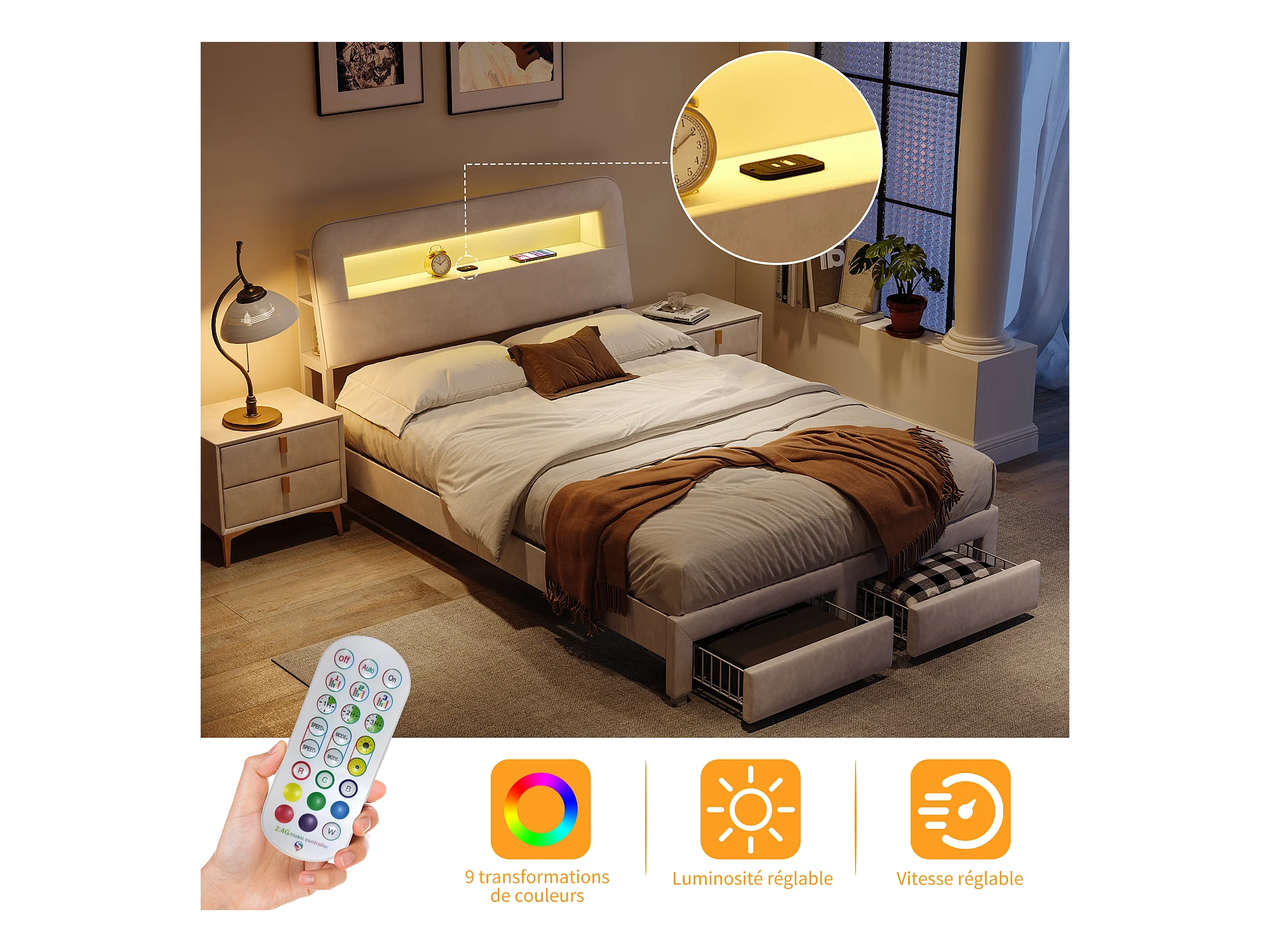 Cama con almacenaje de 160x200 cm en terciopelo beige, cabecero con almacenaje, puertos de carga USB, iluminación LED integrada, 2 cajones de almacenaje