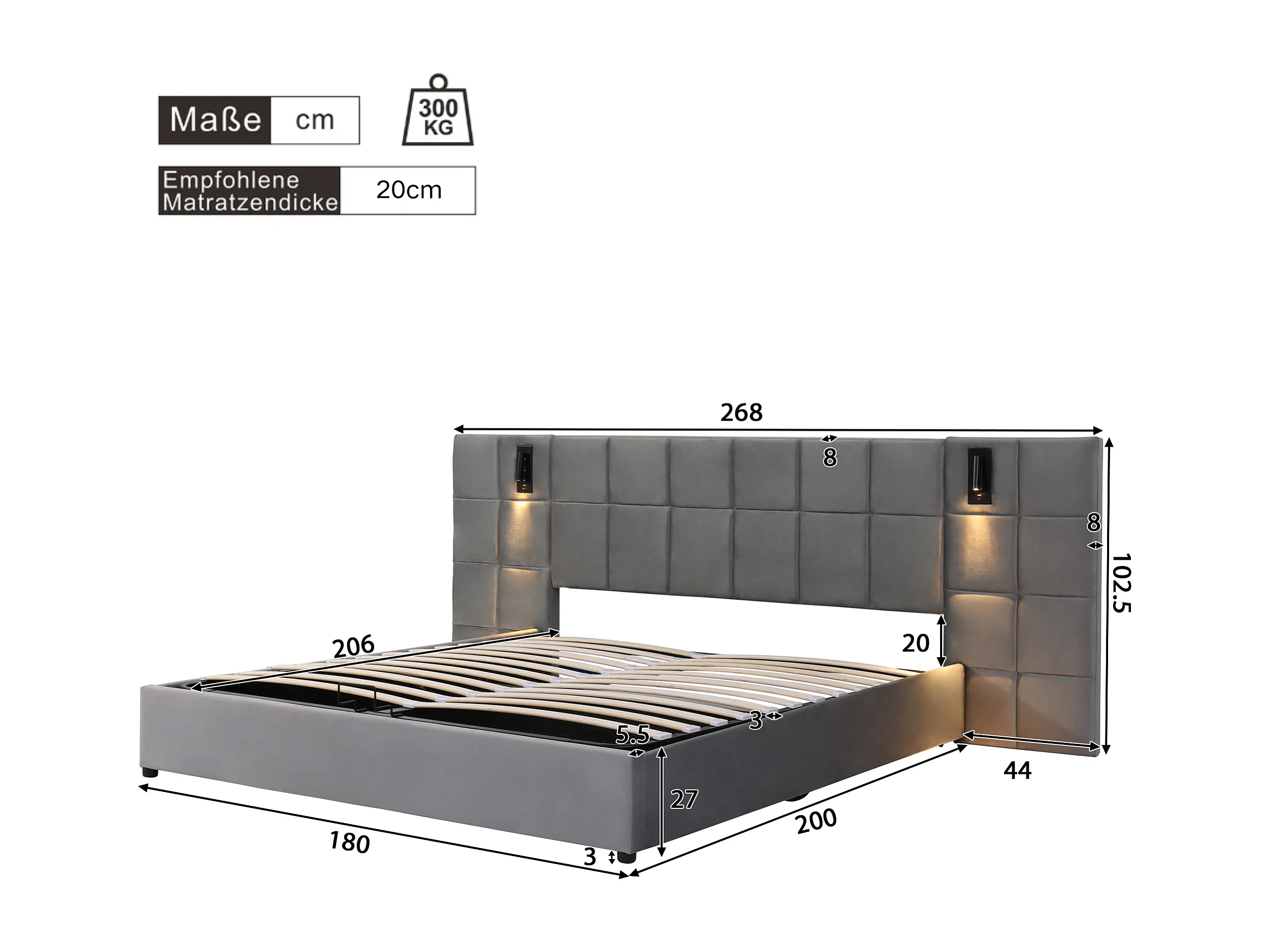 Cama con almacenamiento 180x200 cm para adultos, cabecero ancho con 2 luces de lectura, tapizada en terciopelo gris, sin colchón ni mesitas de noche