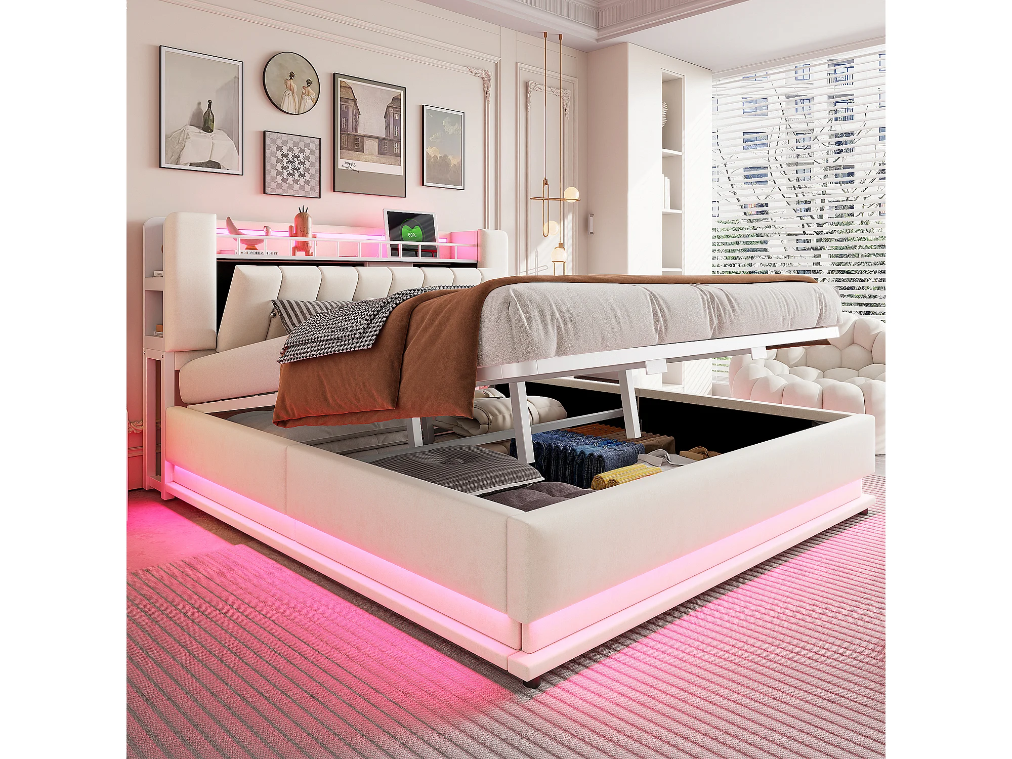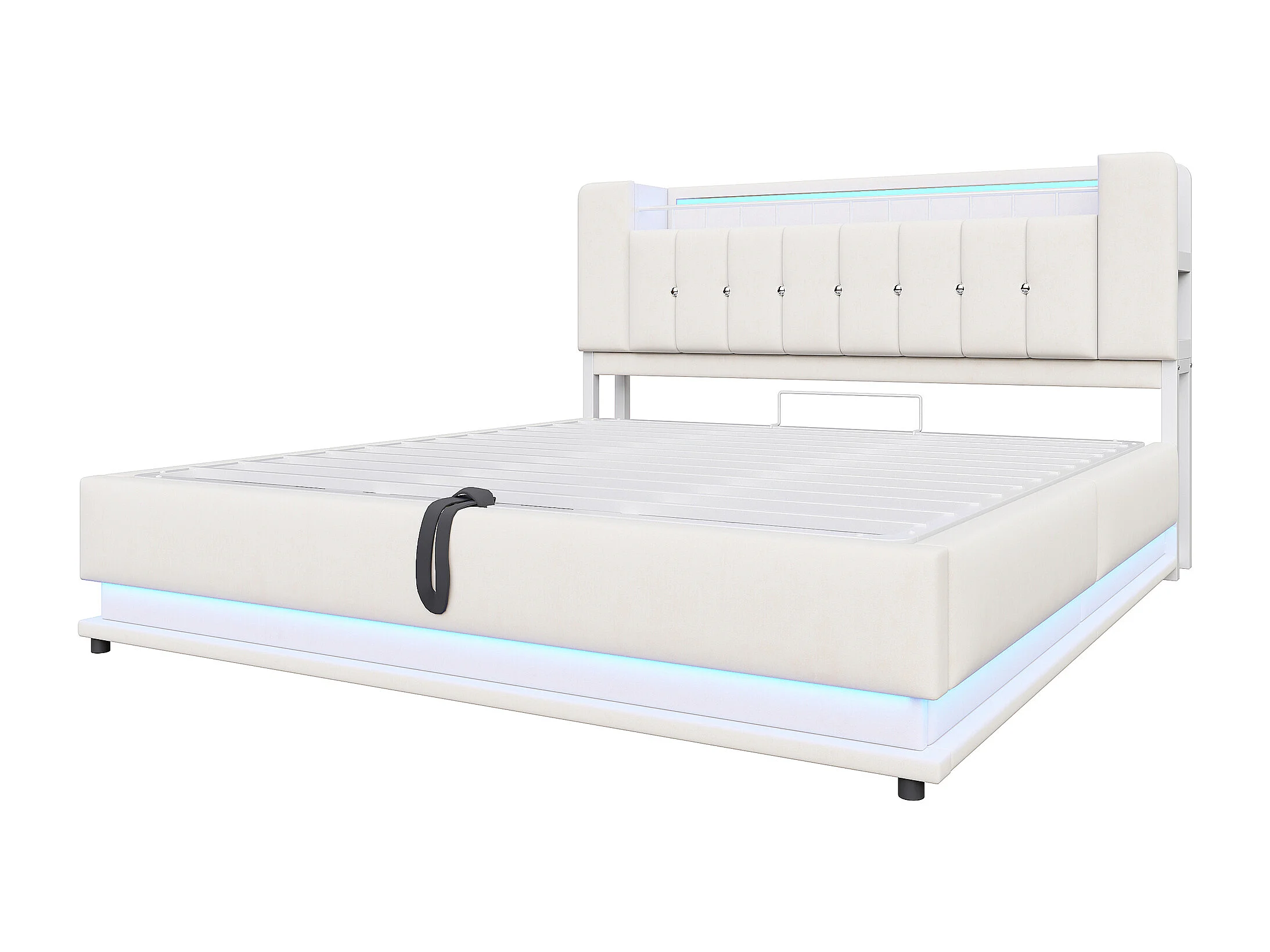 Cama con almacenamiento acolchada 180x200 cm - con luz LED - con puerto USB - terciopelo - beige (colchón no incluido)