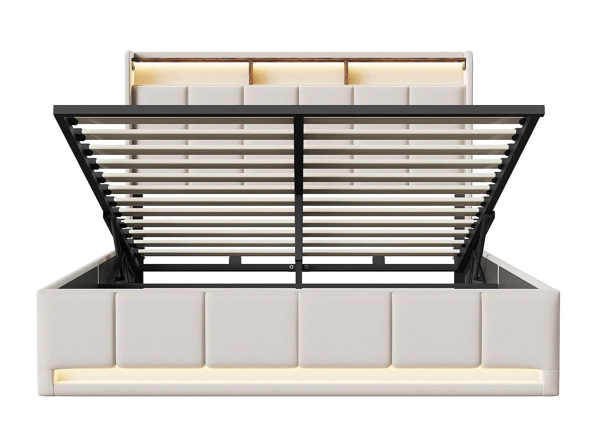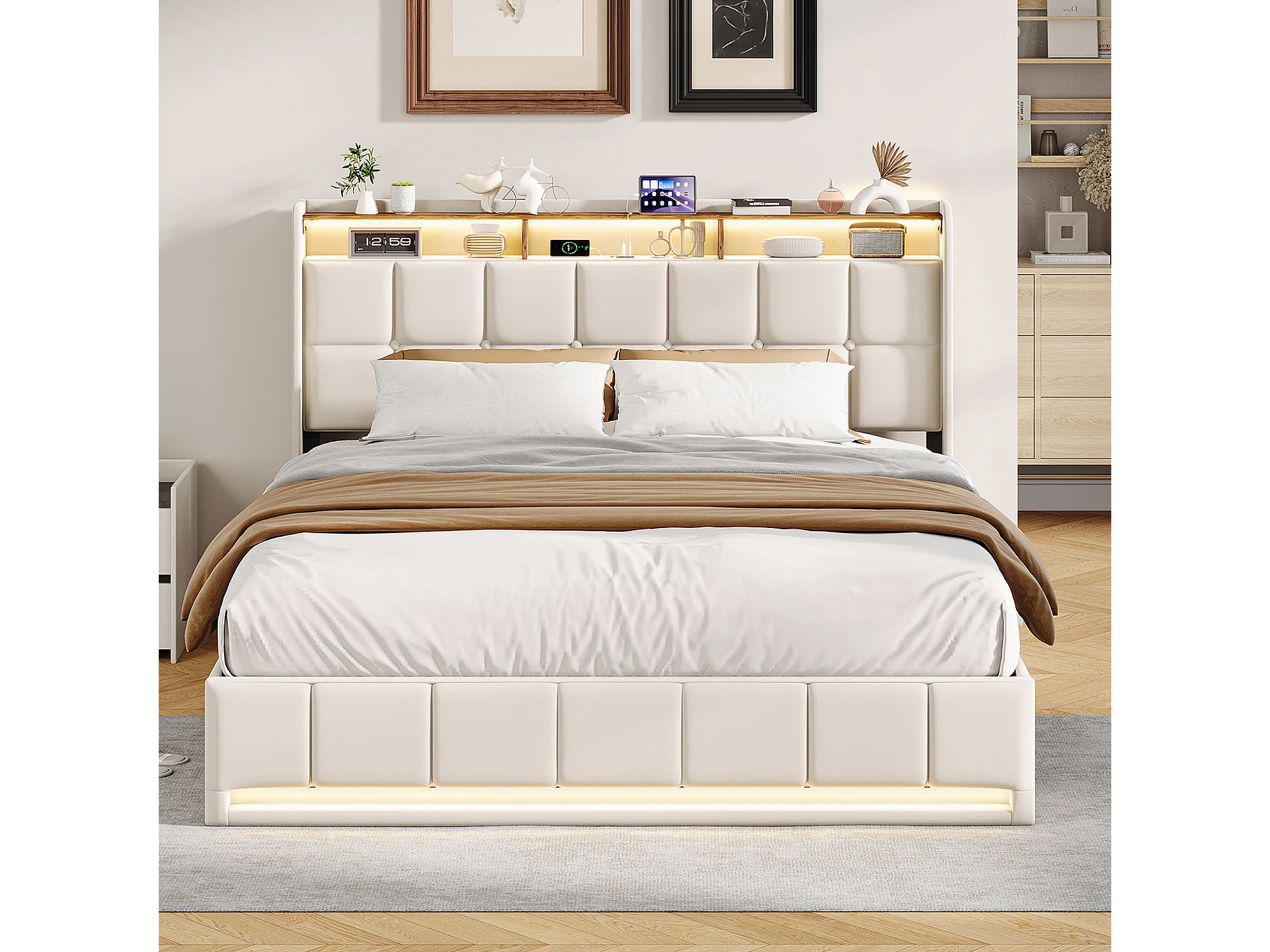 Cama con almacenamiento de 160x200cm con LED, puerto USB y puerto Tipo-C, estructura de cama con almacenamiento, lino, beige