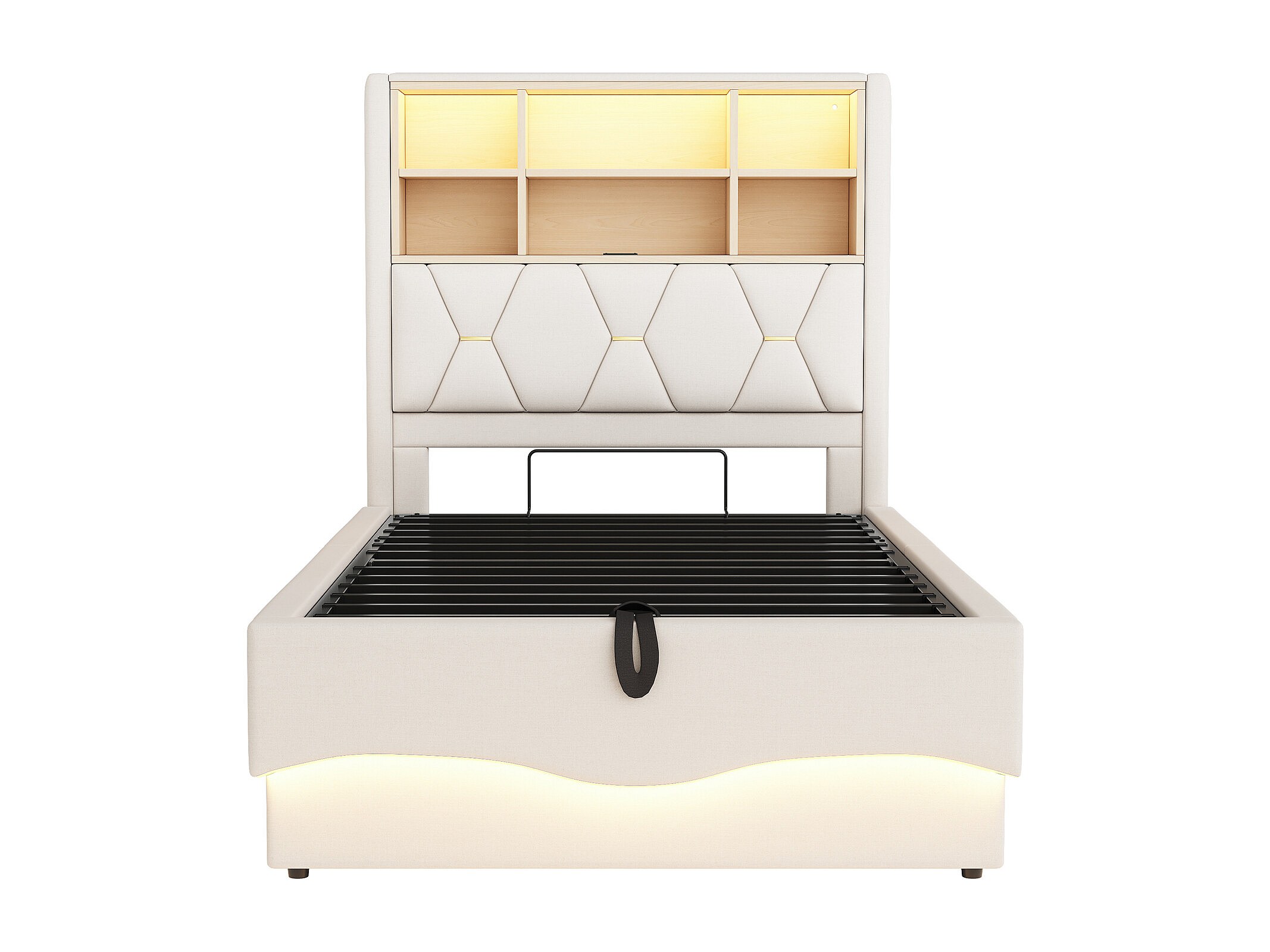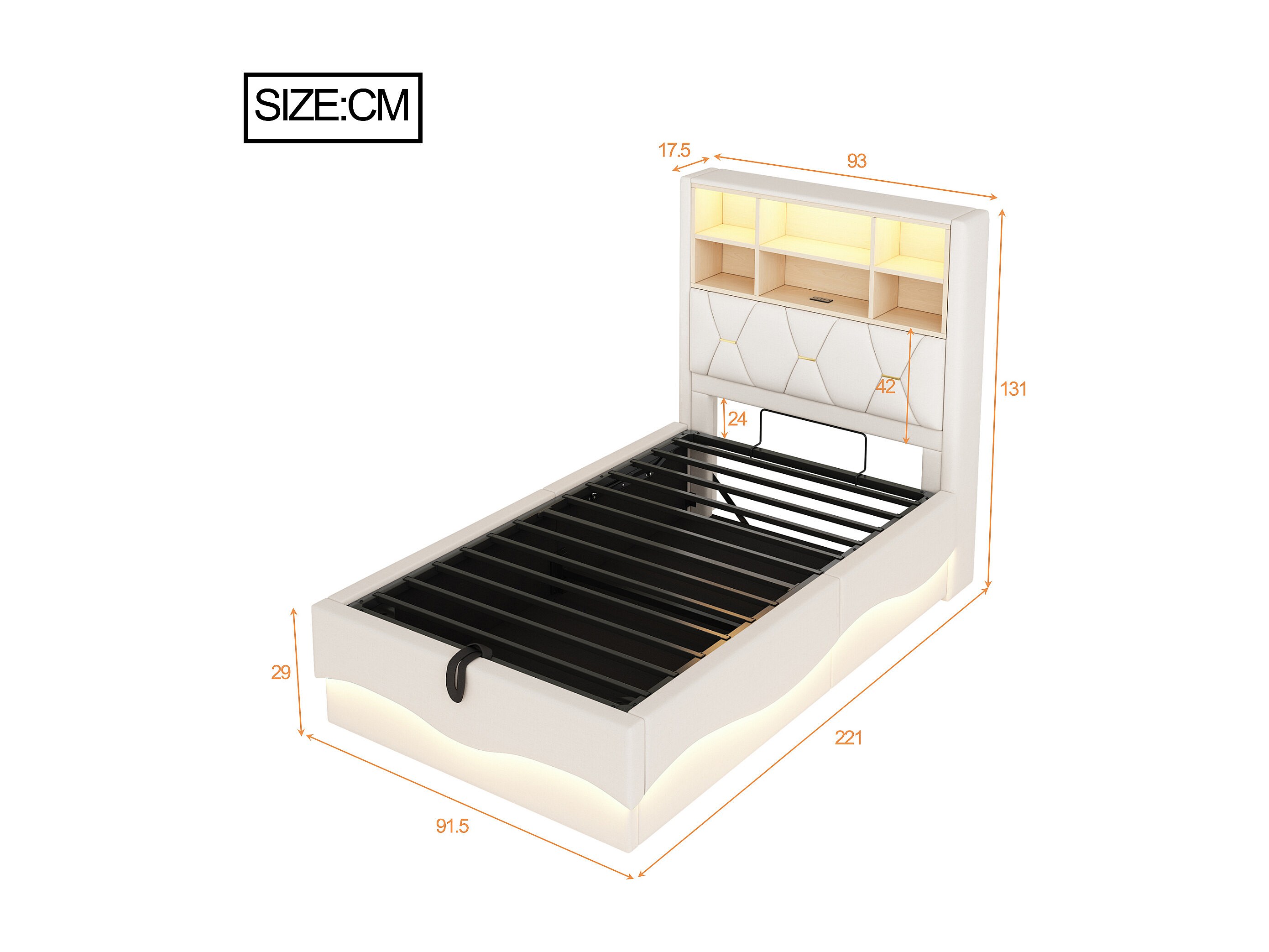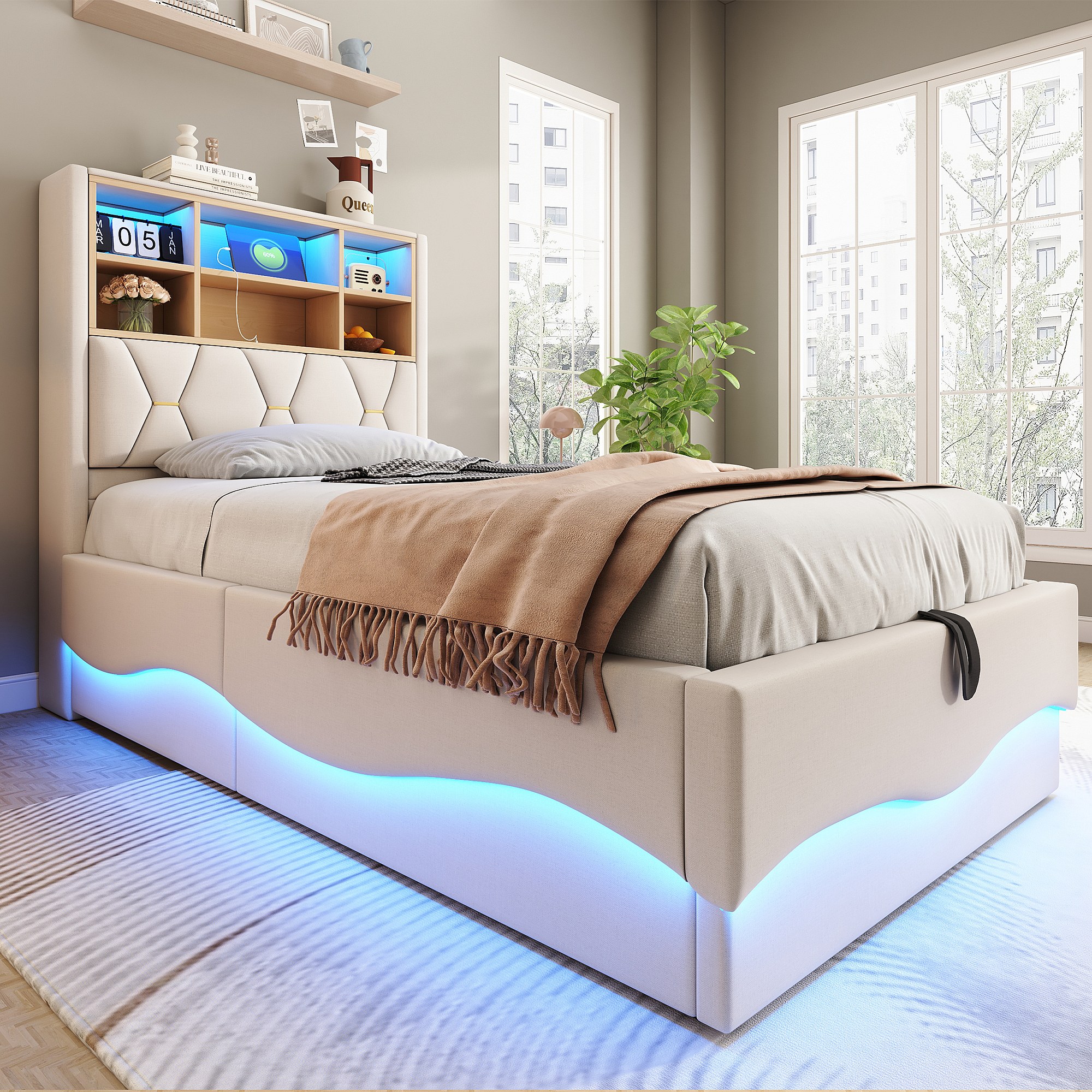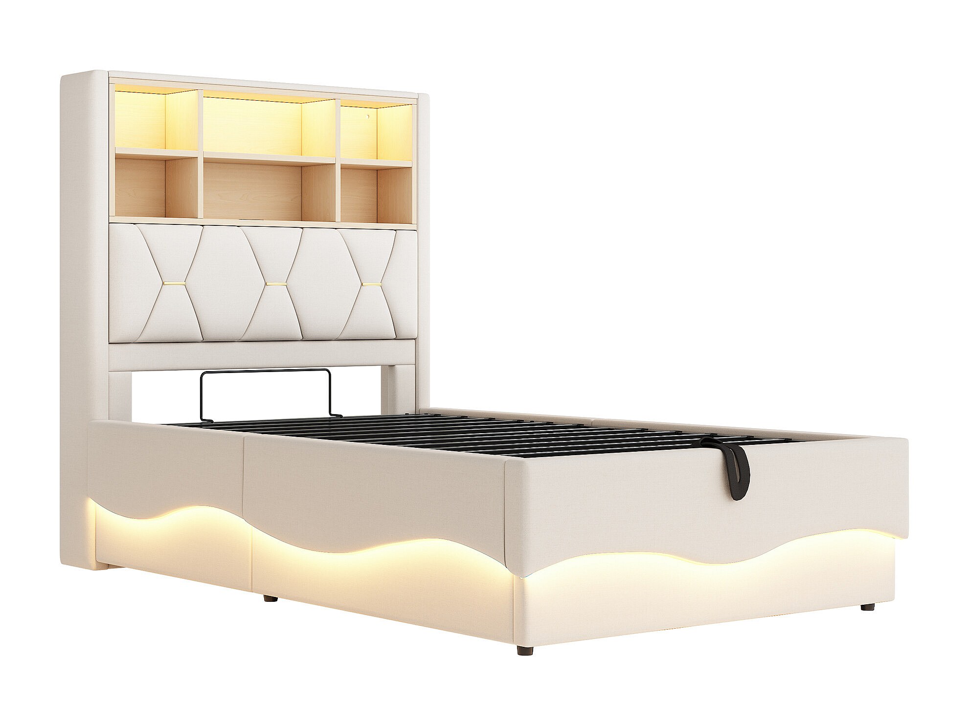 Cama con almacenamiento de 90 x 200 cm, lino beige, cama infantil con LED y puerto USB, cabecero con canapé - colchón no incluido