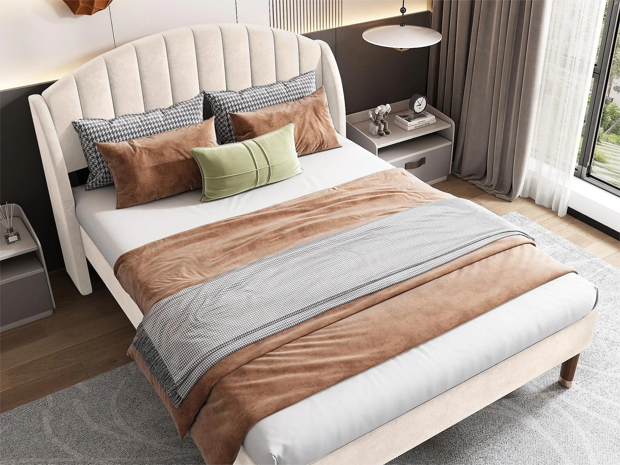 Cama con cabecero acolchado - 140 x 200 cm - terciopelo - somier de láminas - color beige