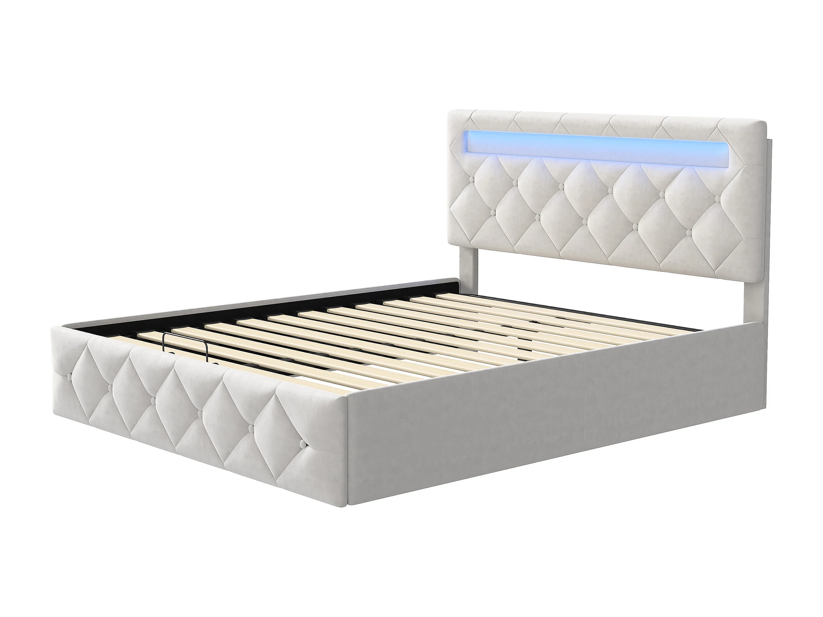Cama con almacenaje de 160 x 200 cm, con función de almacenamiento, tira de luz y puerto de carga USB, color blanco roto, terciopelo.