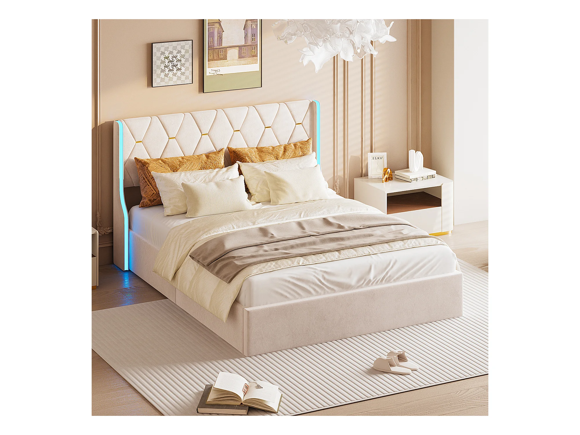 Cama de 160 x 200 cm con compartimentos y LED, tapizada con somier de láminas, color beige