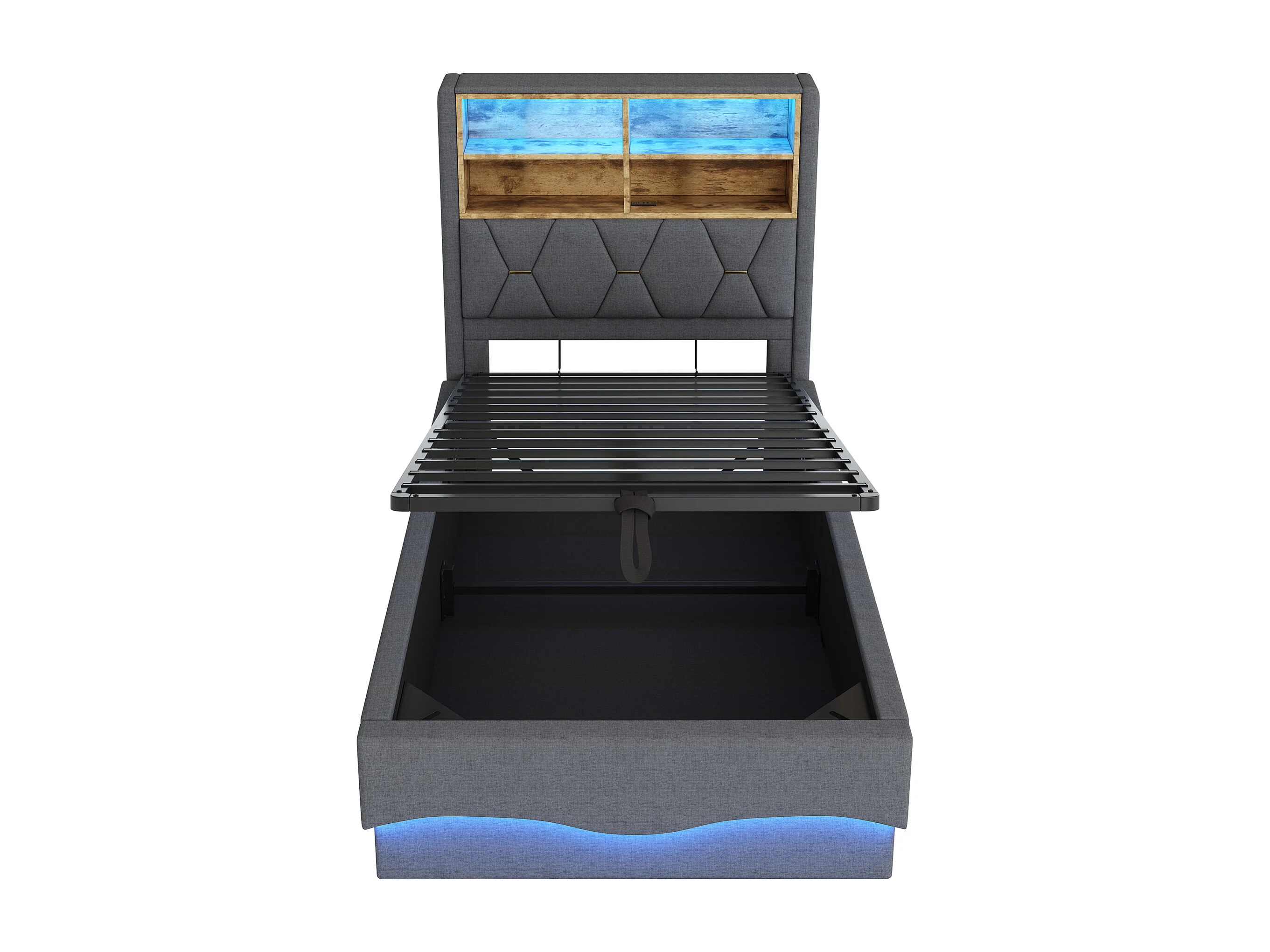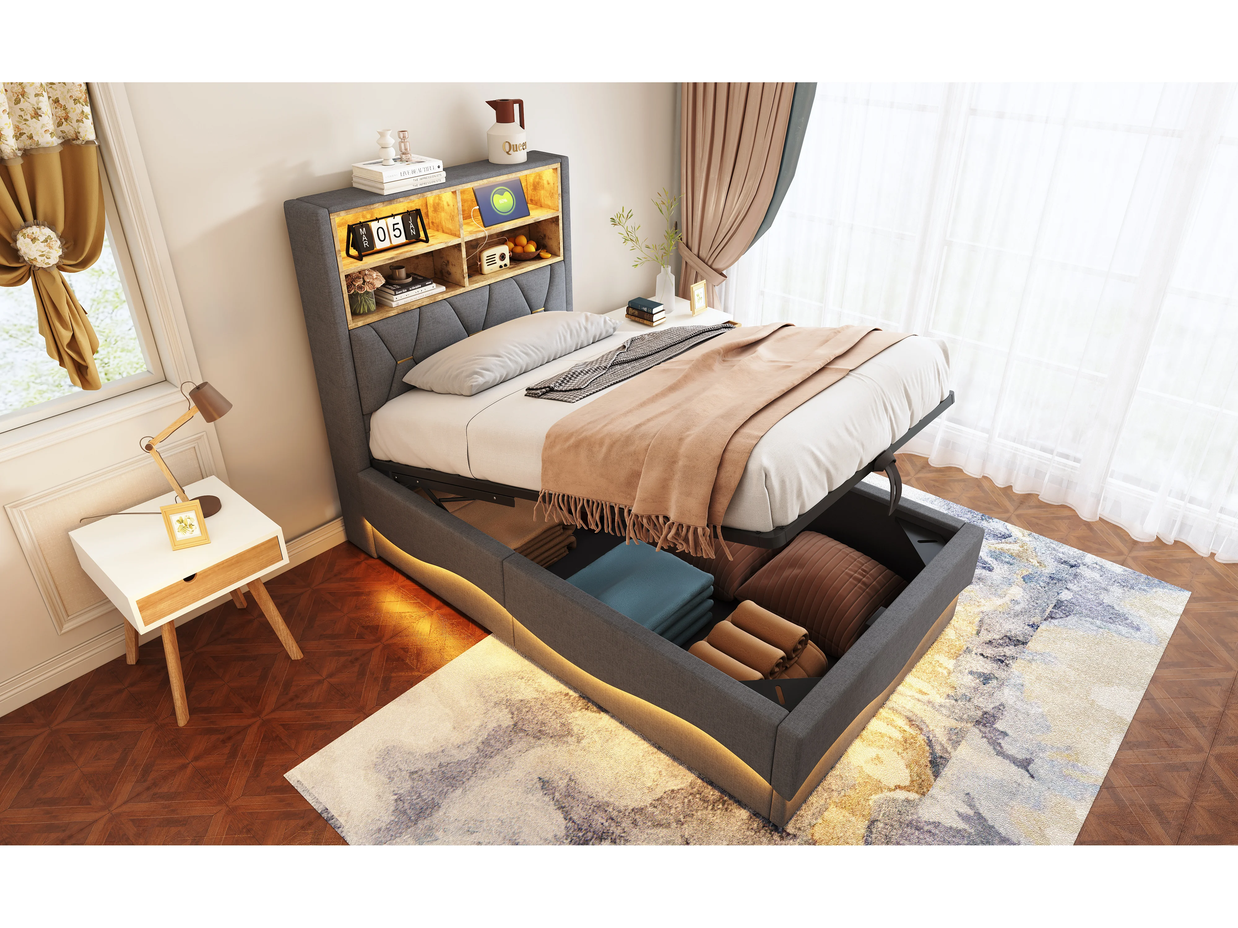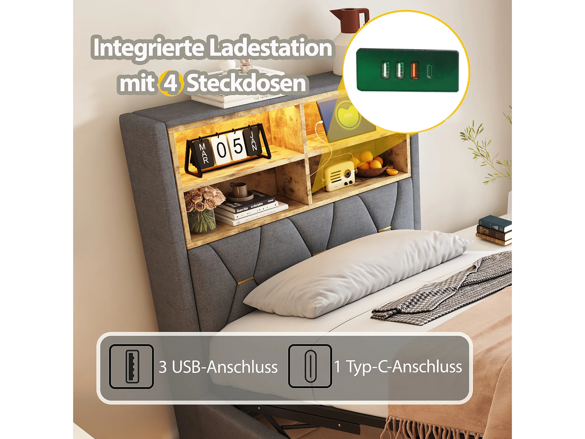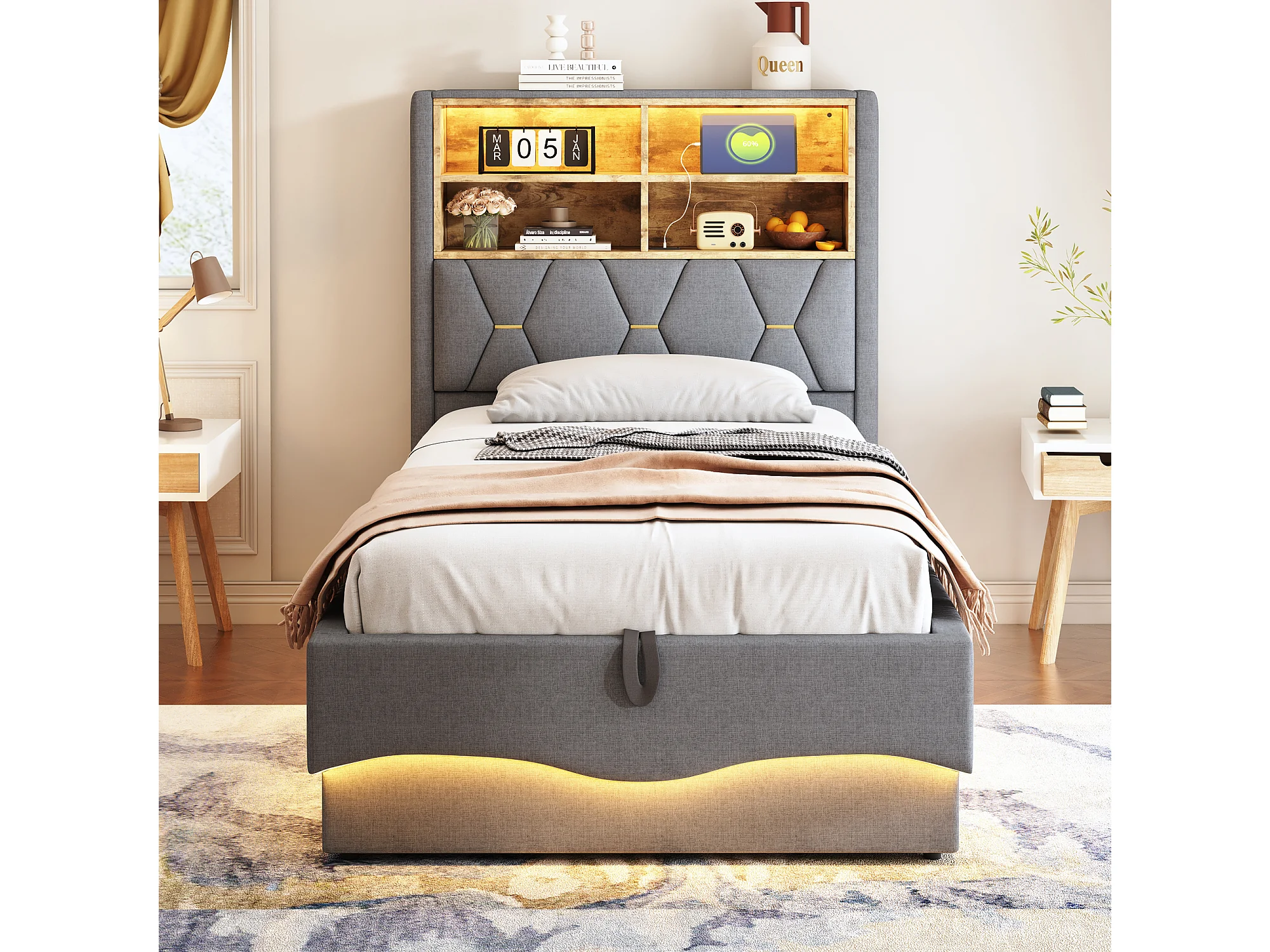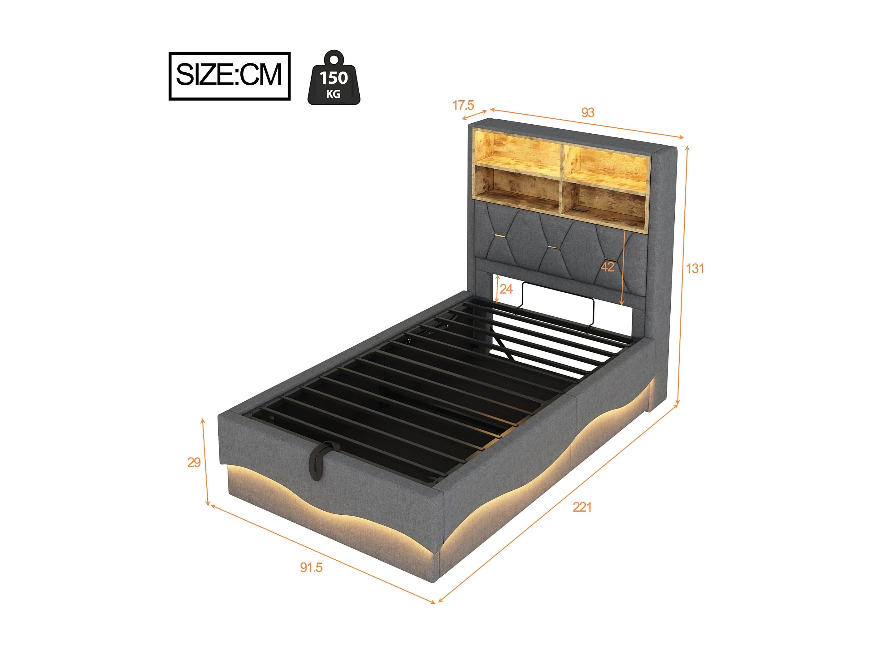 Cama con canapé de 90x200 cm en lino gris - Cama individual con LED y USB - Somier de láminas metálicas