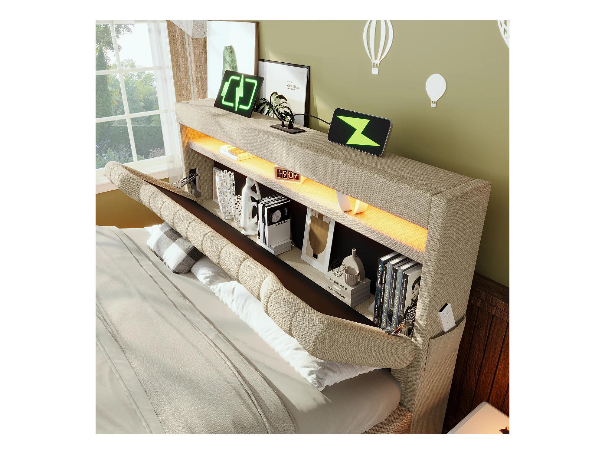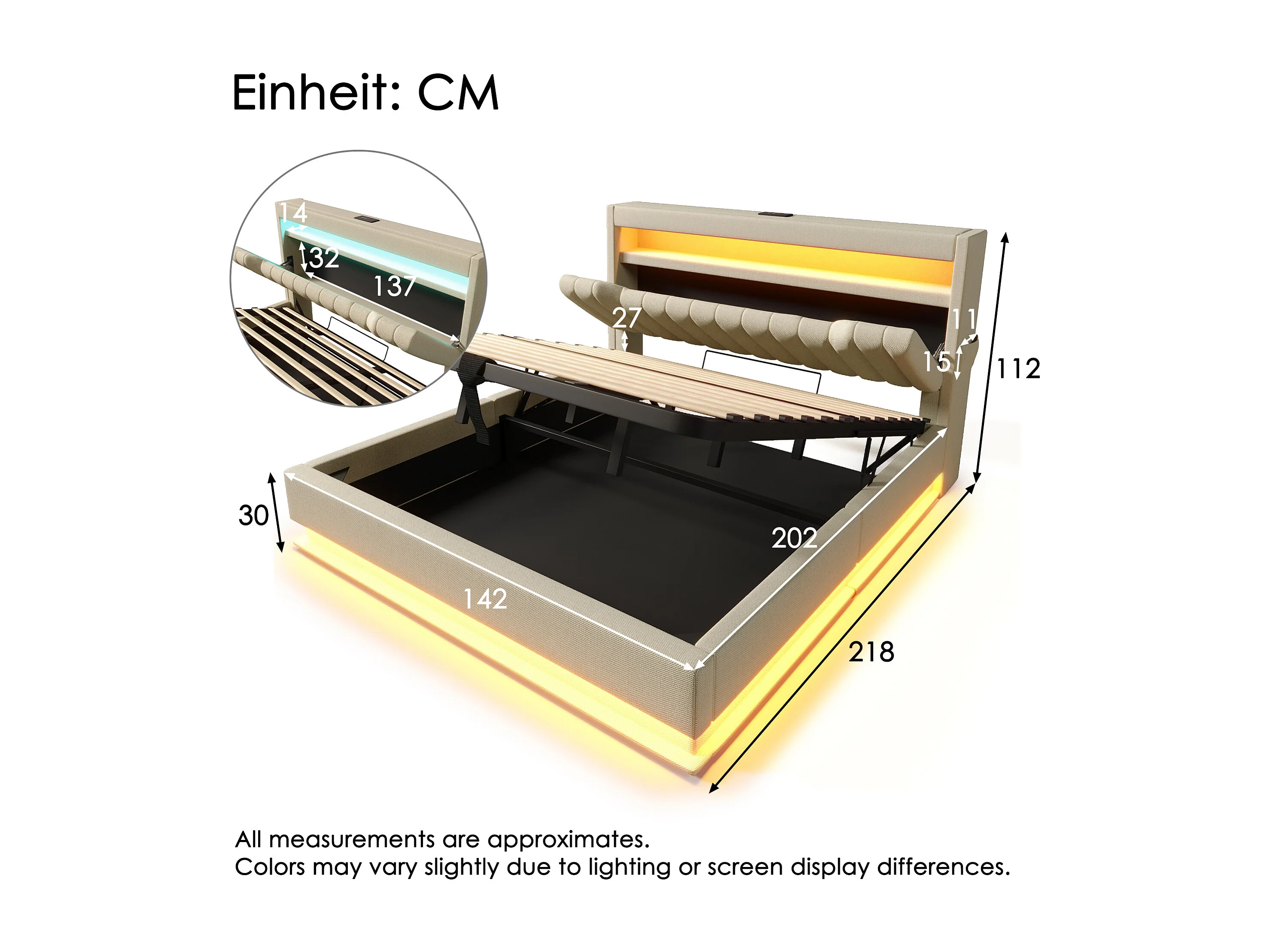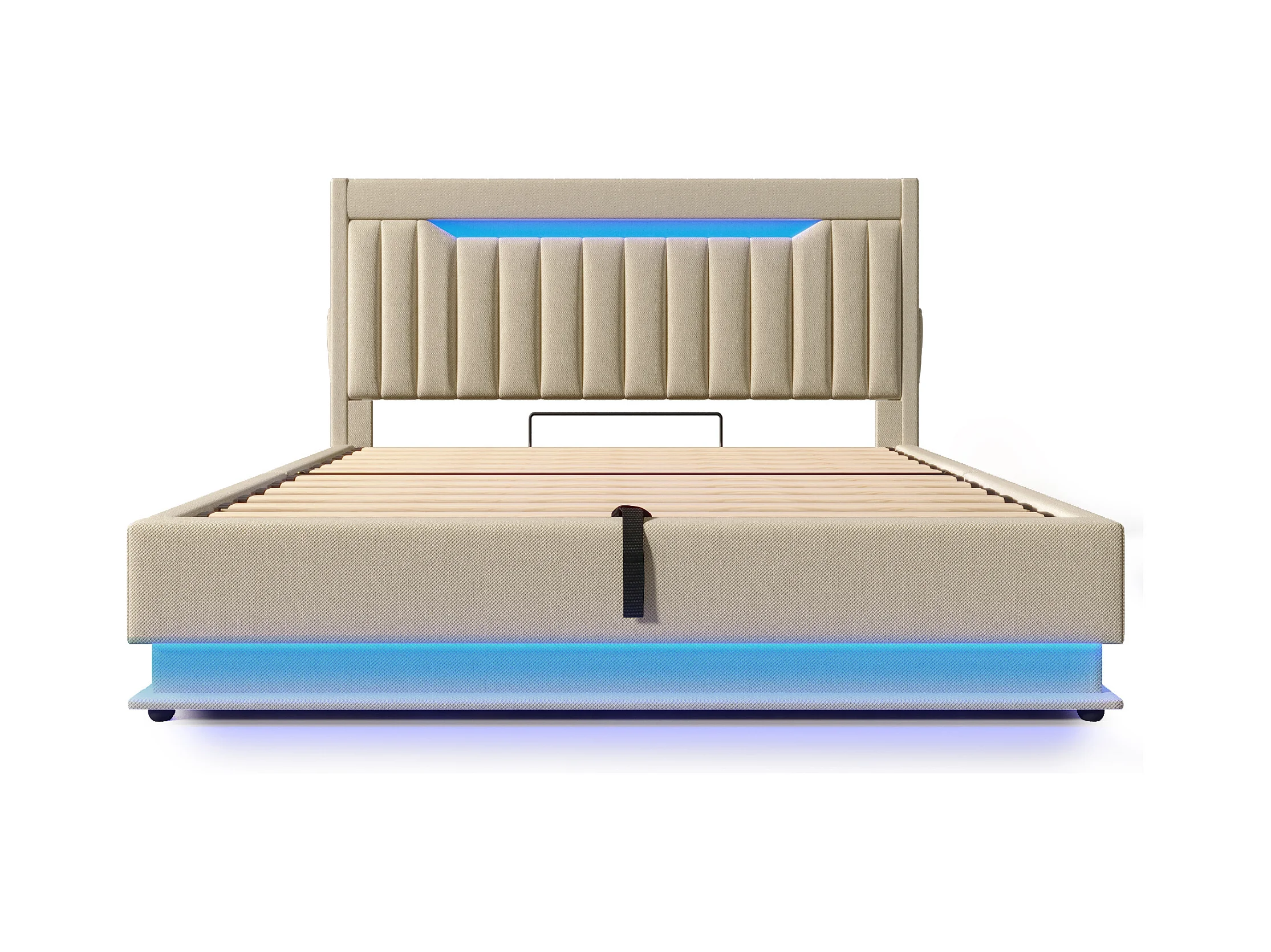 Cama con canapé de lino beige de 140x200 cm con puertos USB y Tipo C, iluminación LED y colchón