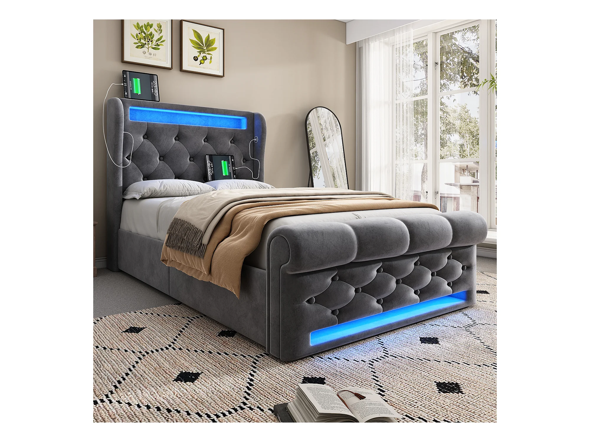 Cama con canapé tapizada - 90 x 200 cm - con LED - cabecero con canapé y USB - terciopelo - gris