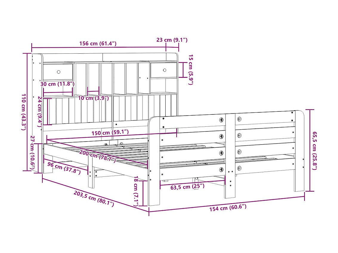 Cama con estantería sin colchón madera maciza de pino 140x200cm