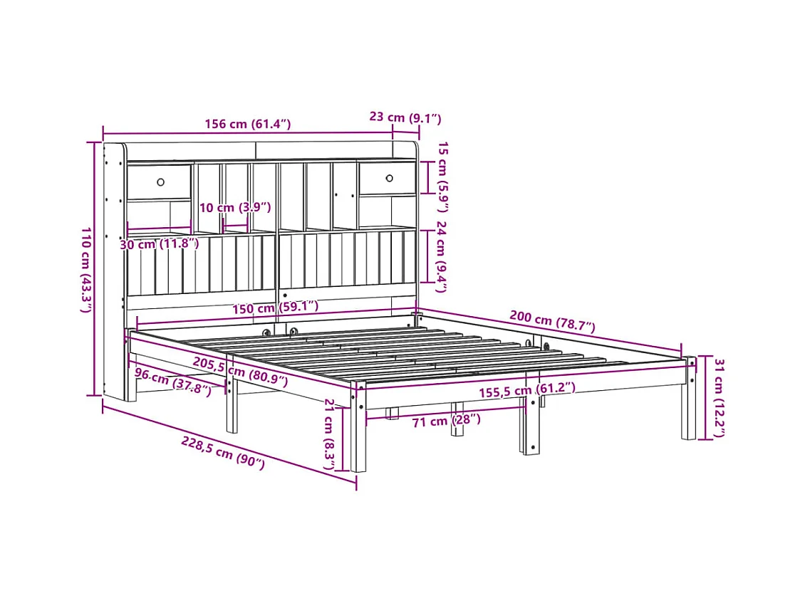 Cama con estantería sin colchón madera maciza de pino 150x200cm