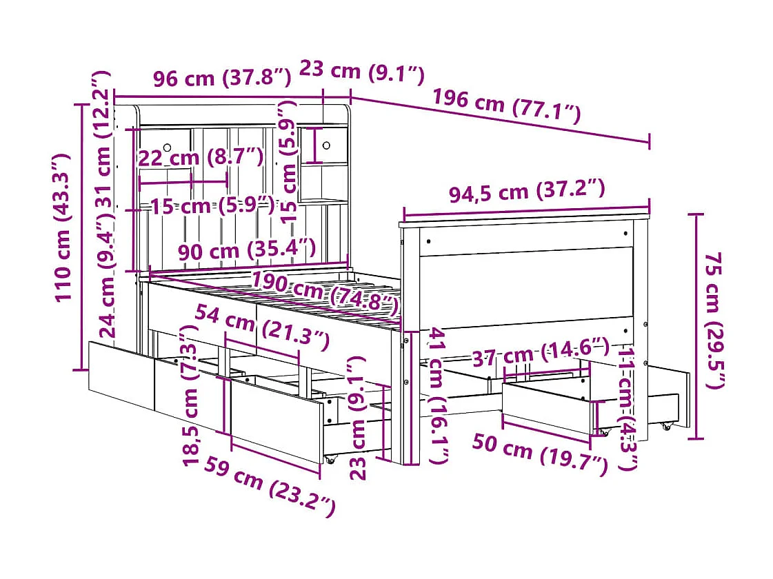 Cama con estantería sin colchón madera maciza de pino 90x190 cm