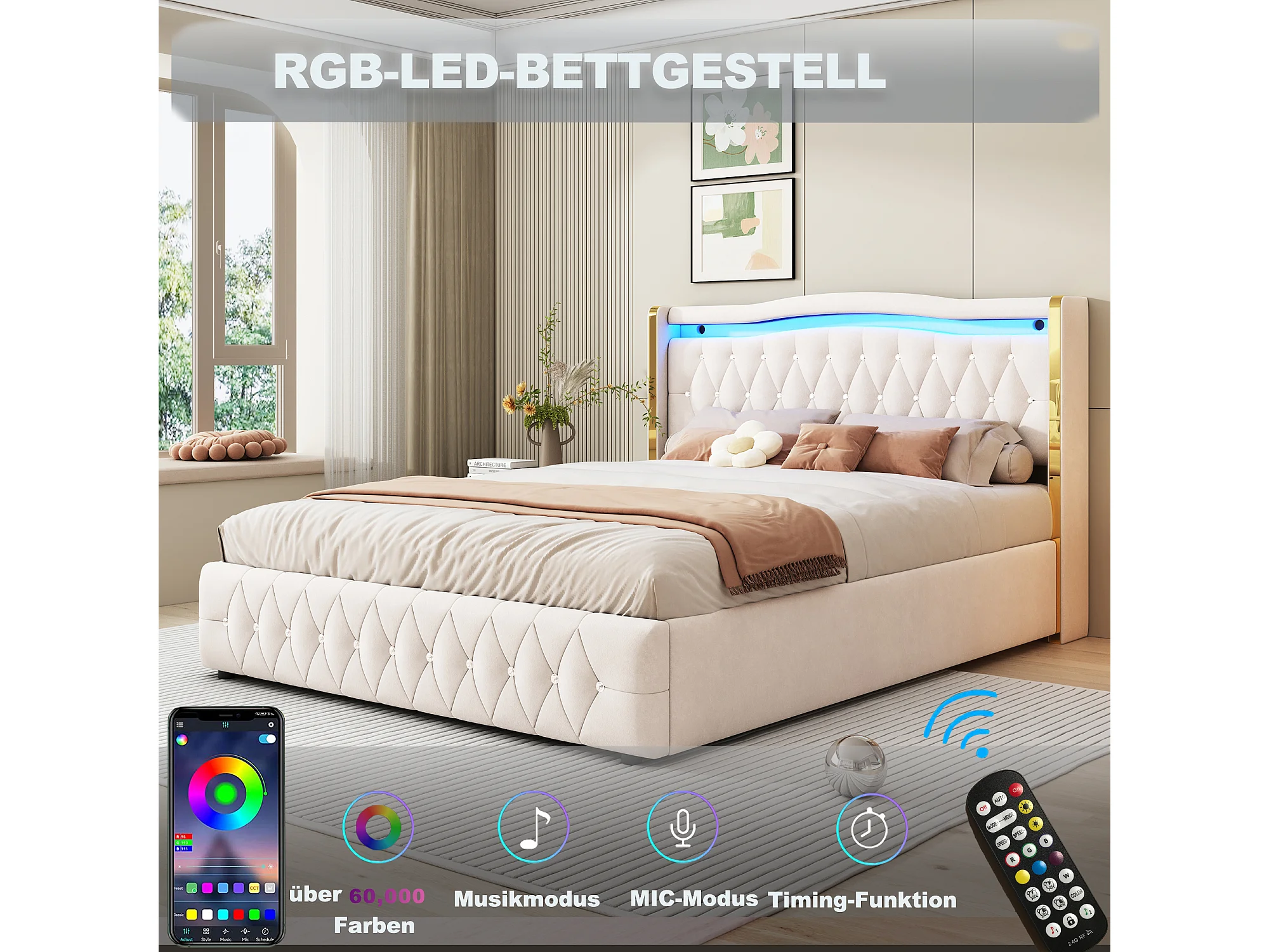 Cama doble 140x200 tapizada, carga USB, LED regulable, terciopelo, beige